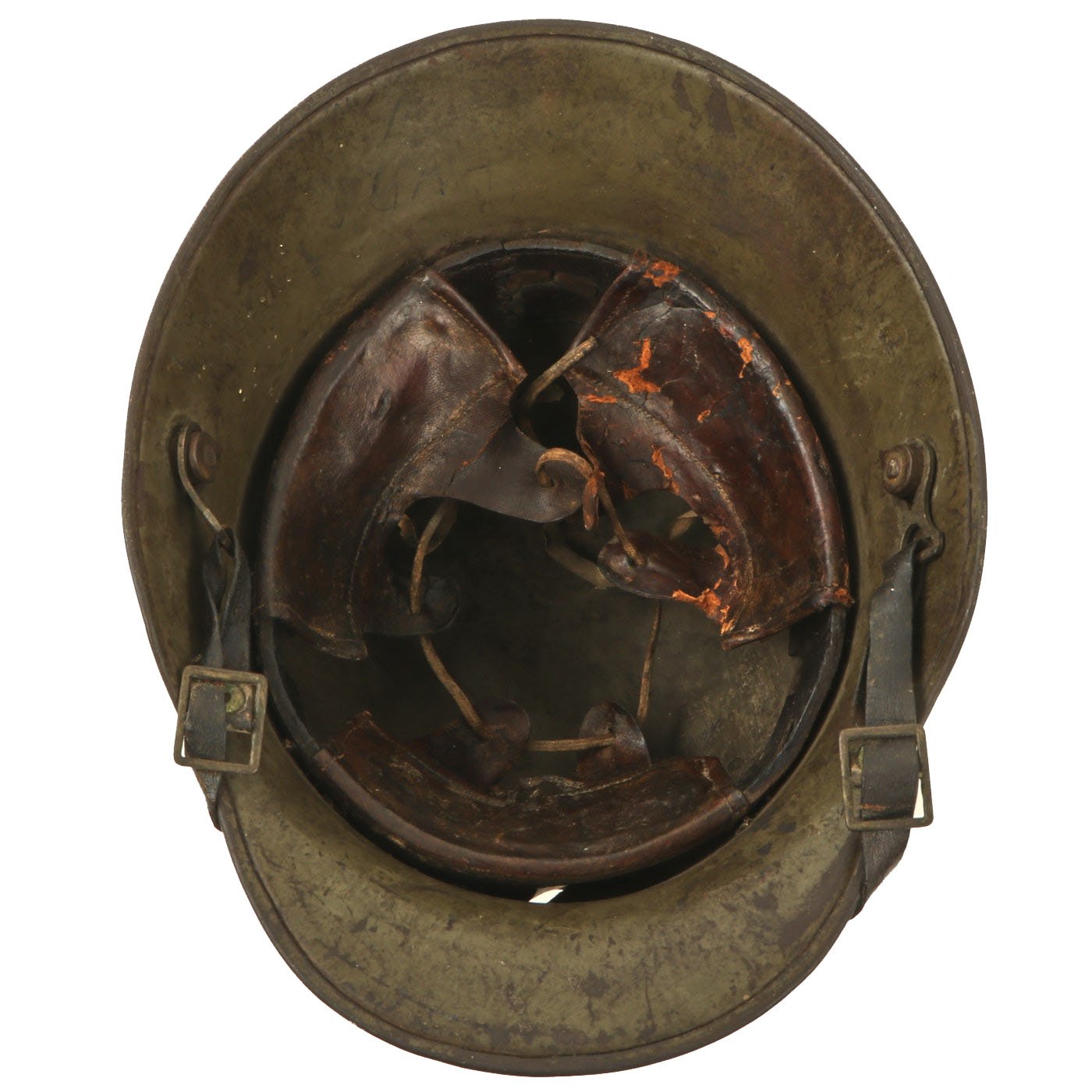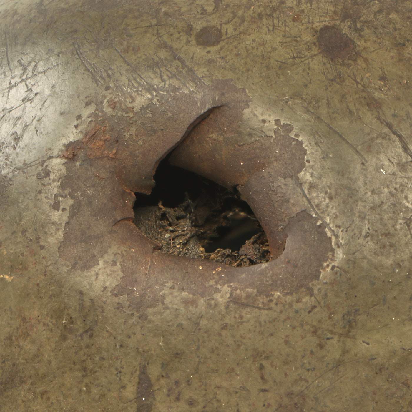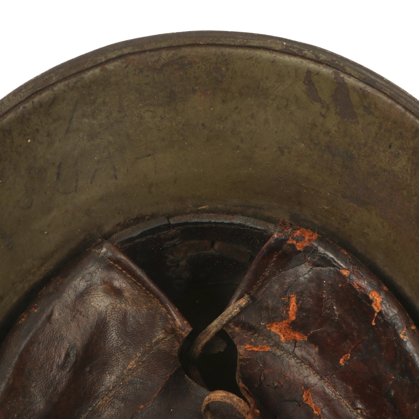 Thefront of the helmet has a bullet hole just above the forehead area, which definitely came from the front of the helmet. The steel is bent inwards, and it looks like some of it may be missing. The projectile also went through front liner panel and the padding behind it. We do not see any other dents or cracks, so it not go out the other side. Close inspection of the paint, style and aging of the edges lead us to be very confident that this totally 100% genuine. It looks to be most likely from standard small arms fire, most likely the .30" rifle bullets common at the time.