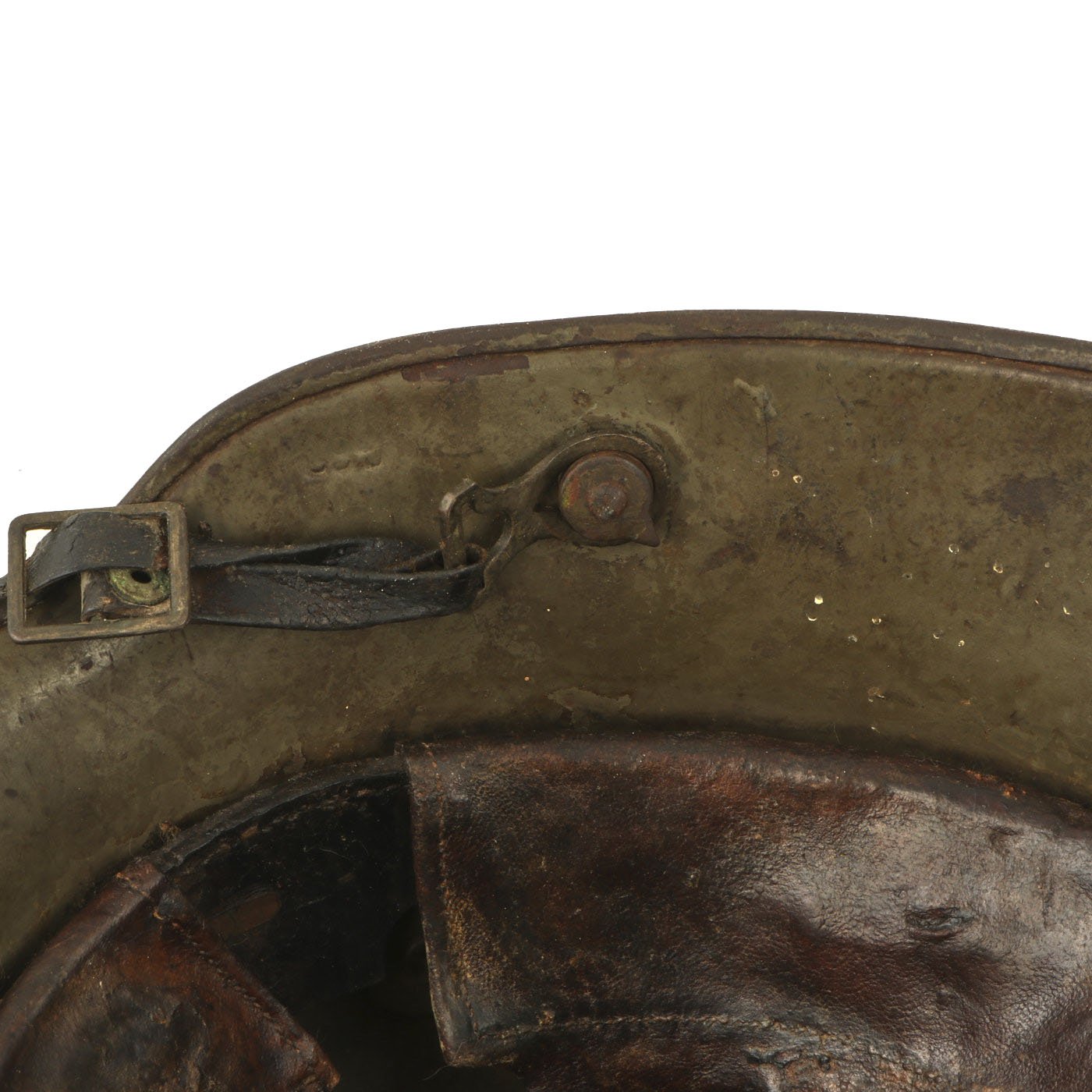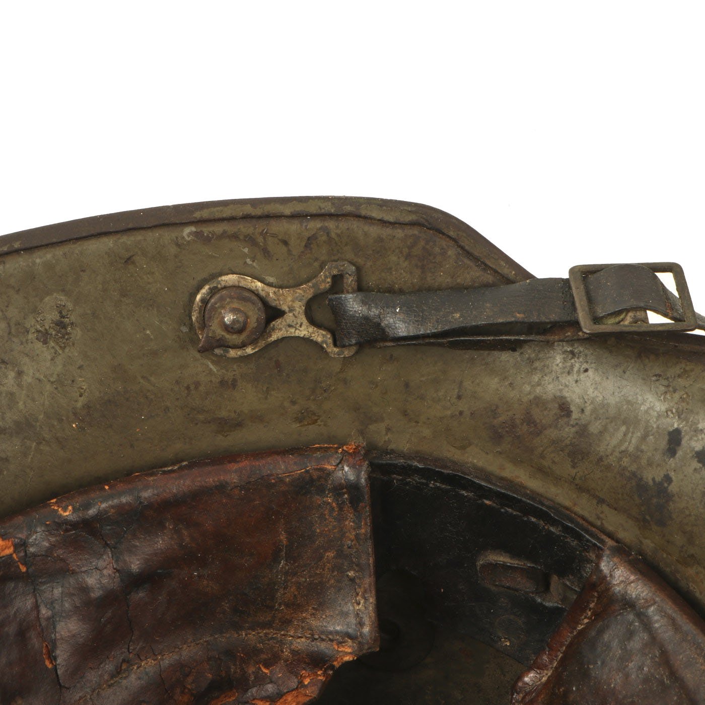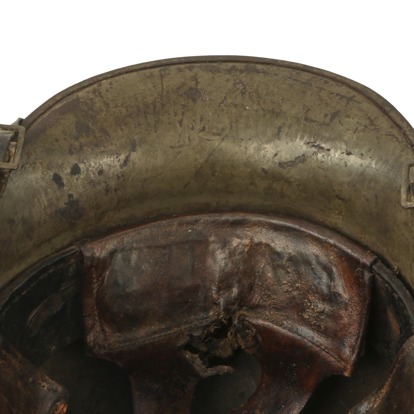 The original liner is present, and still has the complete early war leather band, held in place by the three split pins. These look to be original, with original paint on them, and the rear pin is the correct thicker version. Though the leather is quite stiff and degraded, the liner is almost entirely complete, except for the bullet hole, with all three pads still mostly intact. Most of the helmets that we see are missing the liners completely or have only remnants, so finding a liner this complete is a real rarity.