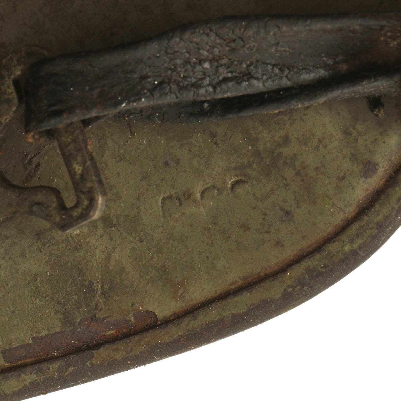 The shell is stamped G. 62 over the left ear, indicating that it was manufactured by Gebrüder Gnüchtel A.G., located at Lauter in Saxony, Germany. This company made shells in sizes 62 ONLY for the war effort. Size 62 is a smaller size that can accommodate liners from 54cm to 56cm or US 6 3/4 to 7. Unfortunately the paint on the inside of the helmet is thick, which along with the staining has made the rolling mill marking impossible to see.