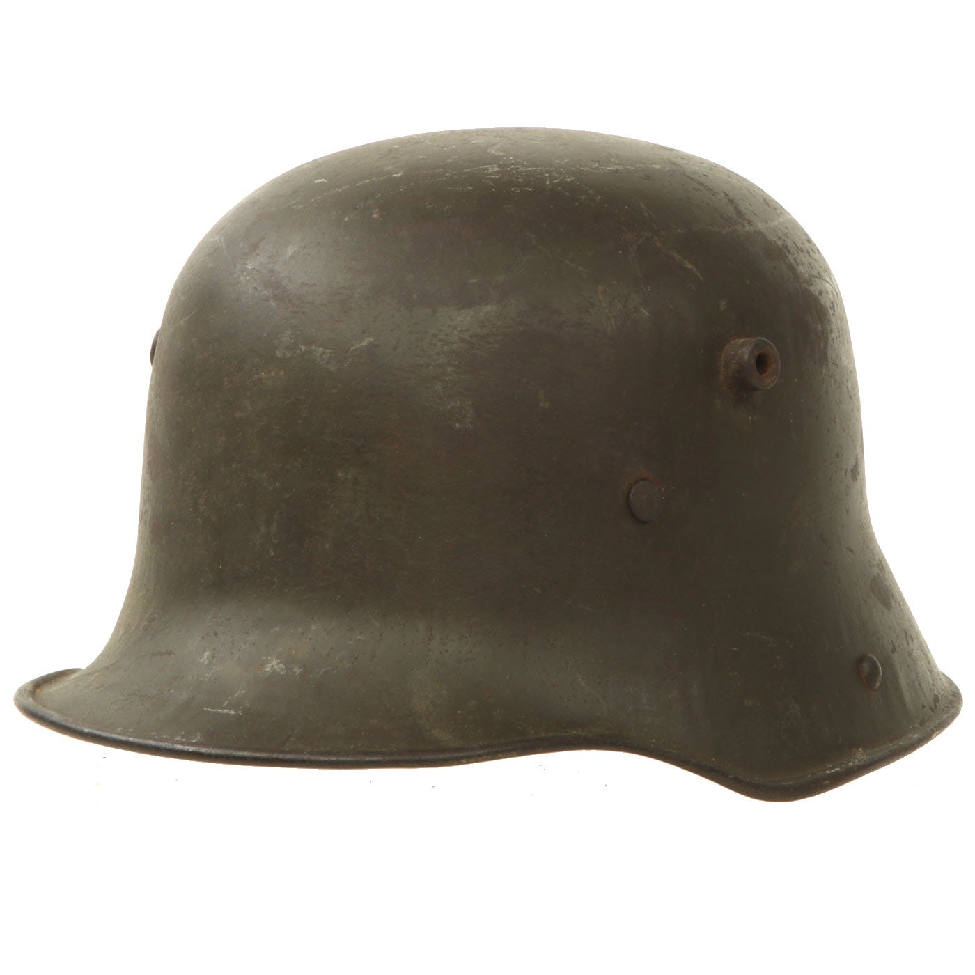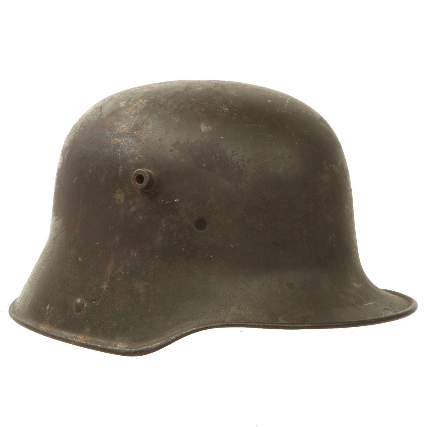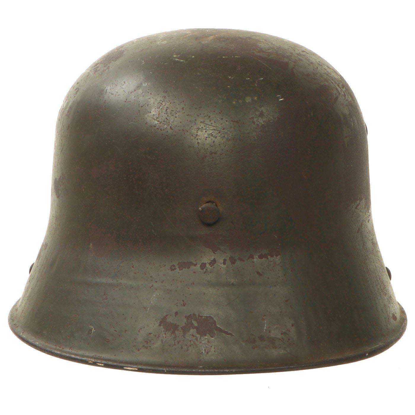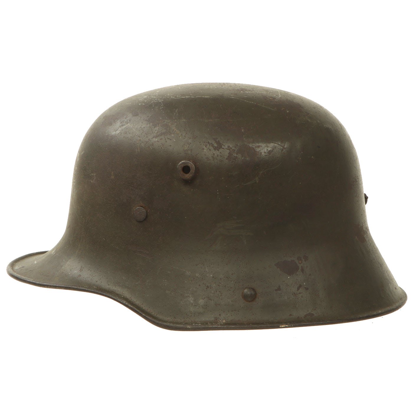 Original Item: Only One Available. This is a very nice example of a totally original WWI German M16 Helmet shell, with a great look and markings. The original green paint is still well retained inside the shell, with about 60% still present on the exterior, with areas of paint loss and oxidation. It does not look to have been repainted at any time. The entire liner is missing, very common to find on early helmets, as the liner was entirely leather, and once it deteriorates there is nothing to hold it in place. It does still have two of the three split pins, including the rear pin with the larger head.