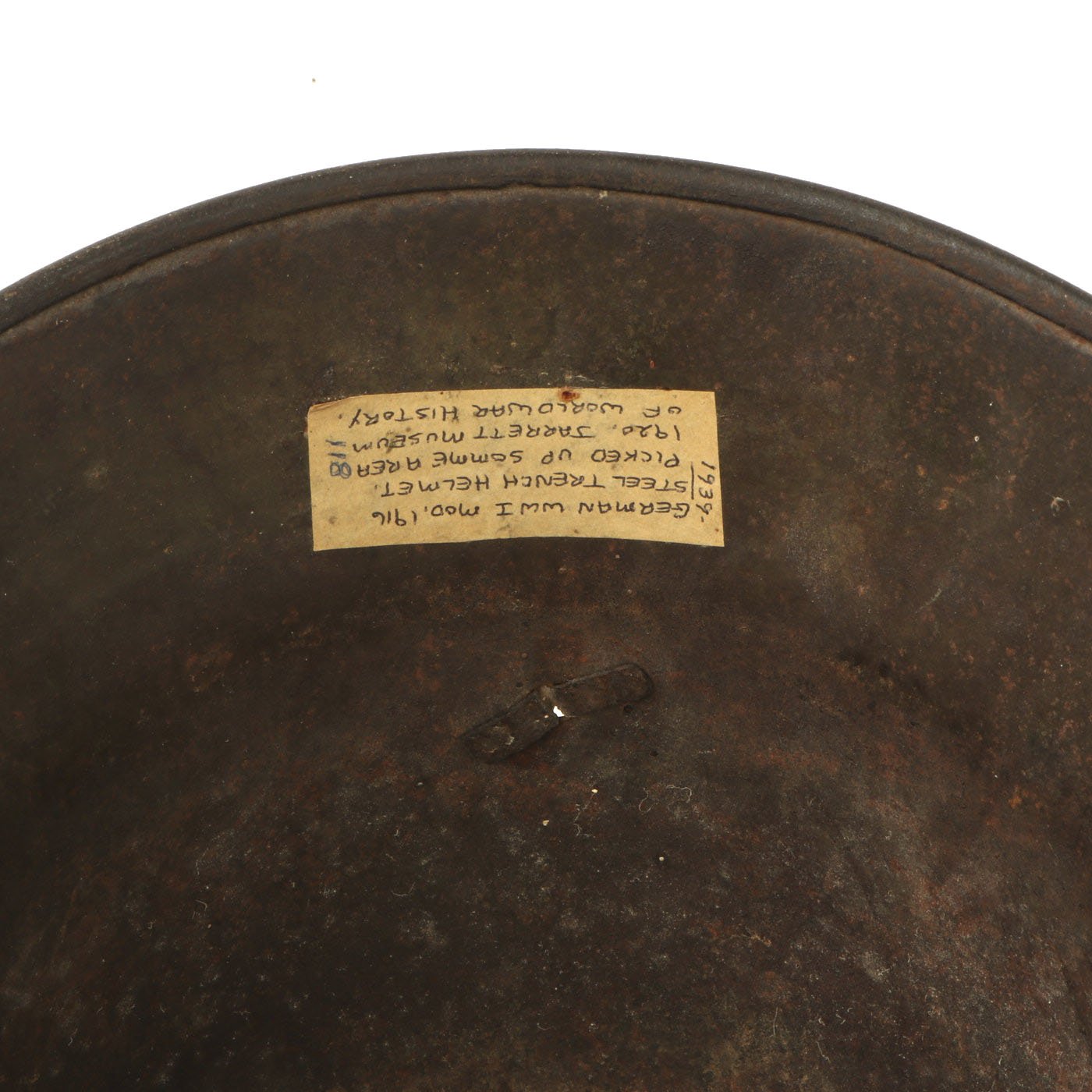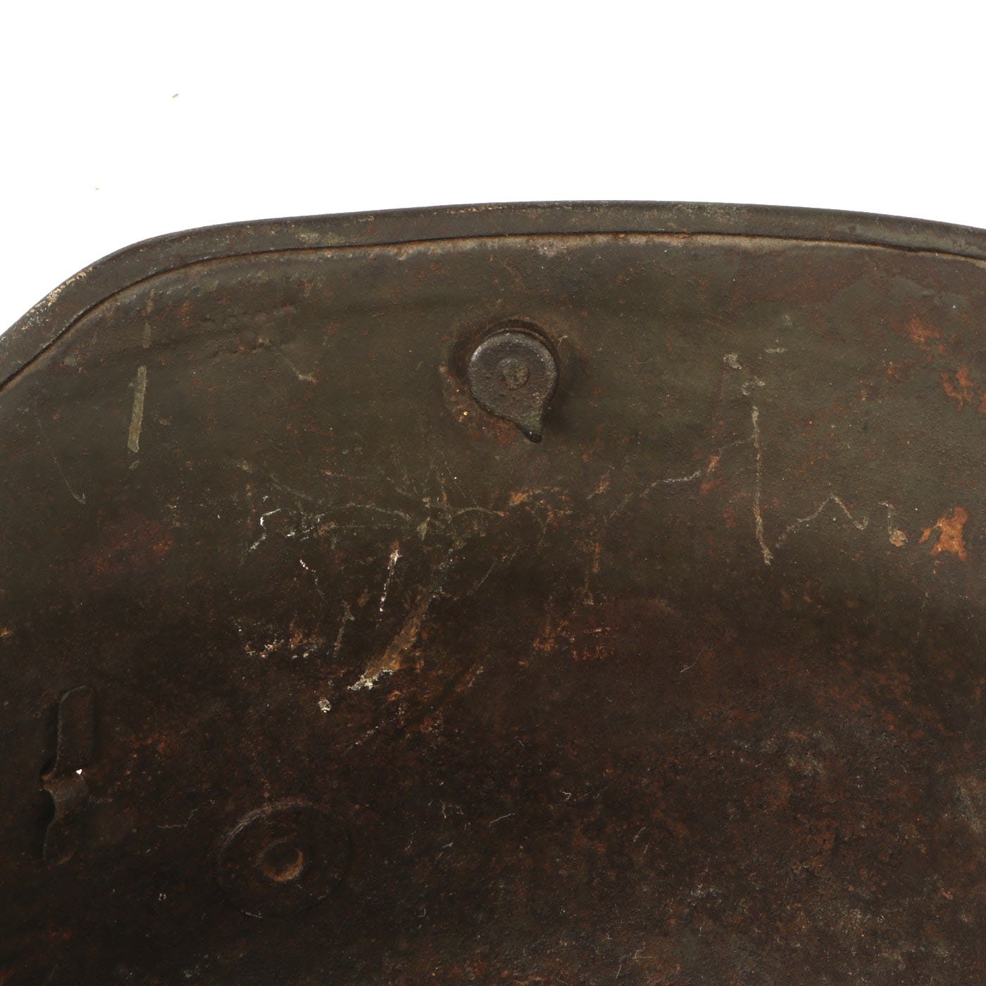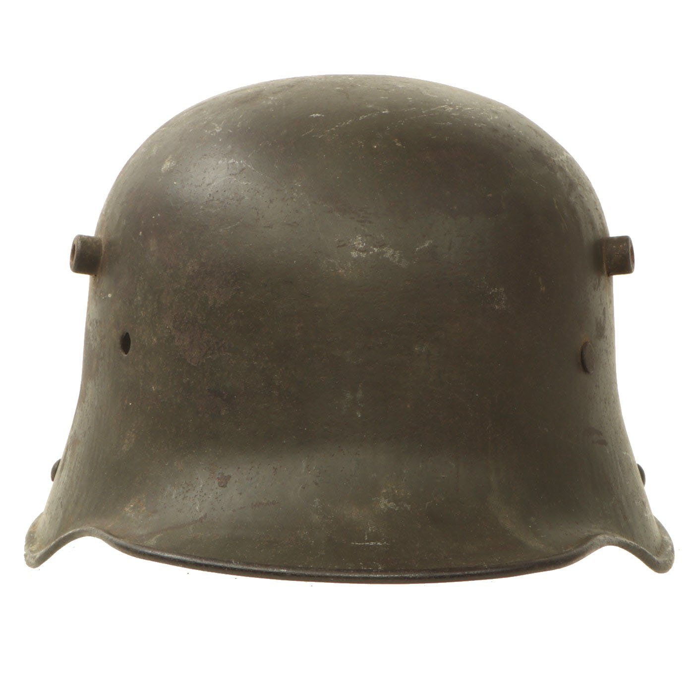 Original Item: Only One Available. This is a very nice example of a totally original WWI German M16 Helmet shell, with a great look and markings. The original green paint is still well retained inside the shell, with about 60% still present on the exterior, with areas of paint loss and oxidation. It does not look to have been repainted at any time. The entire liner is missing, very common to find on early helmets, as the liner was entirely leather, and once it deteriorates there is nothing to hold it in place. It does still have two of the three split pins, including the rear pin with the larger head.