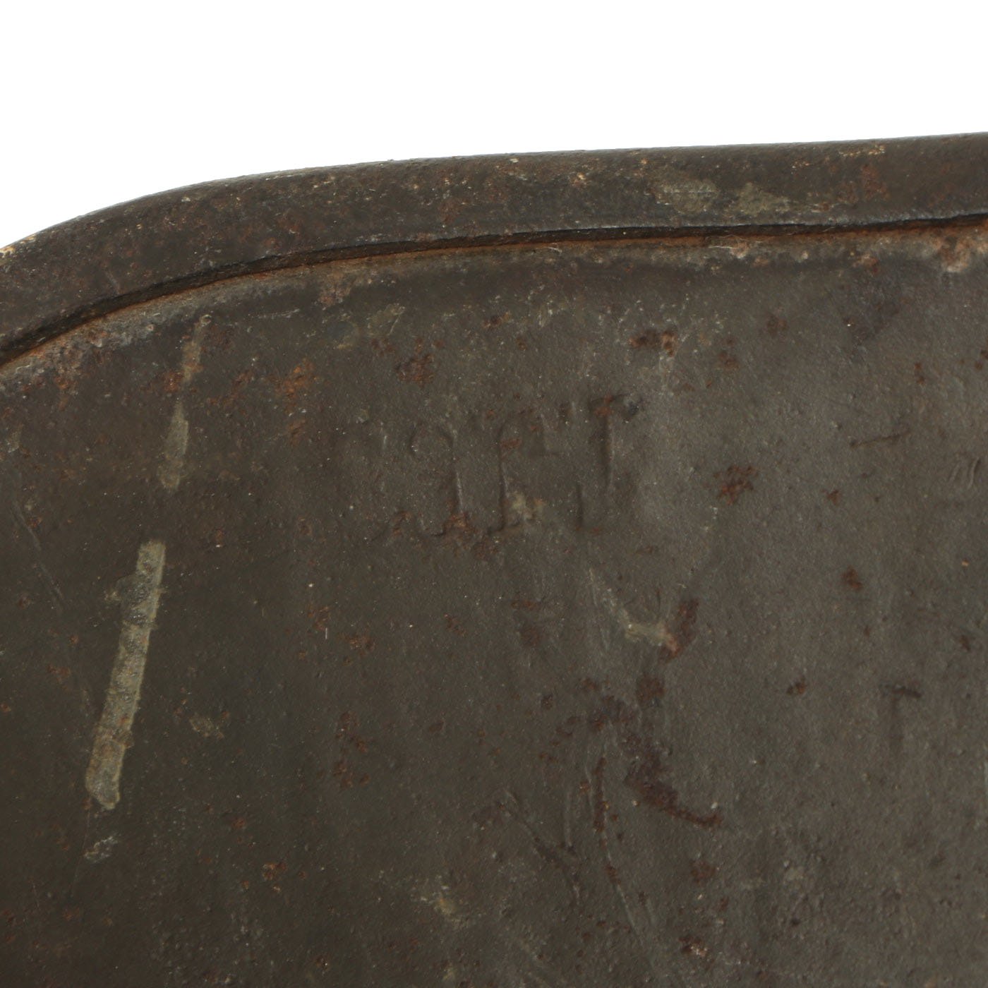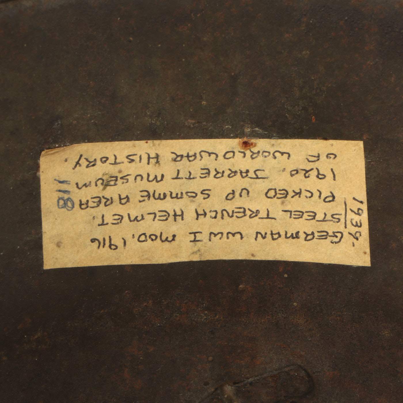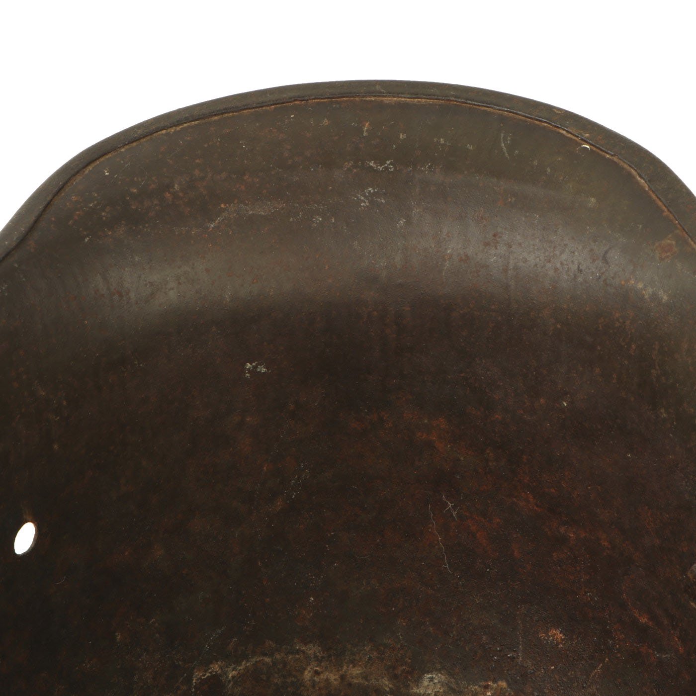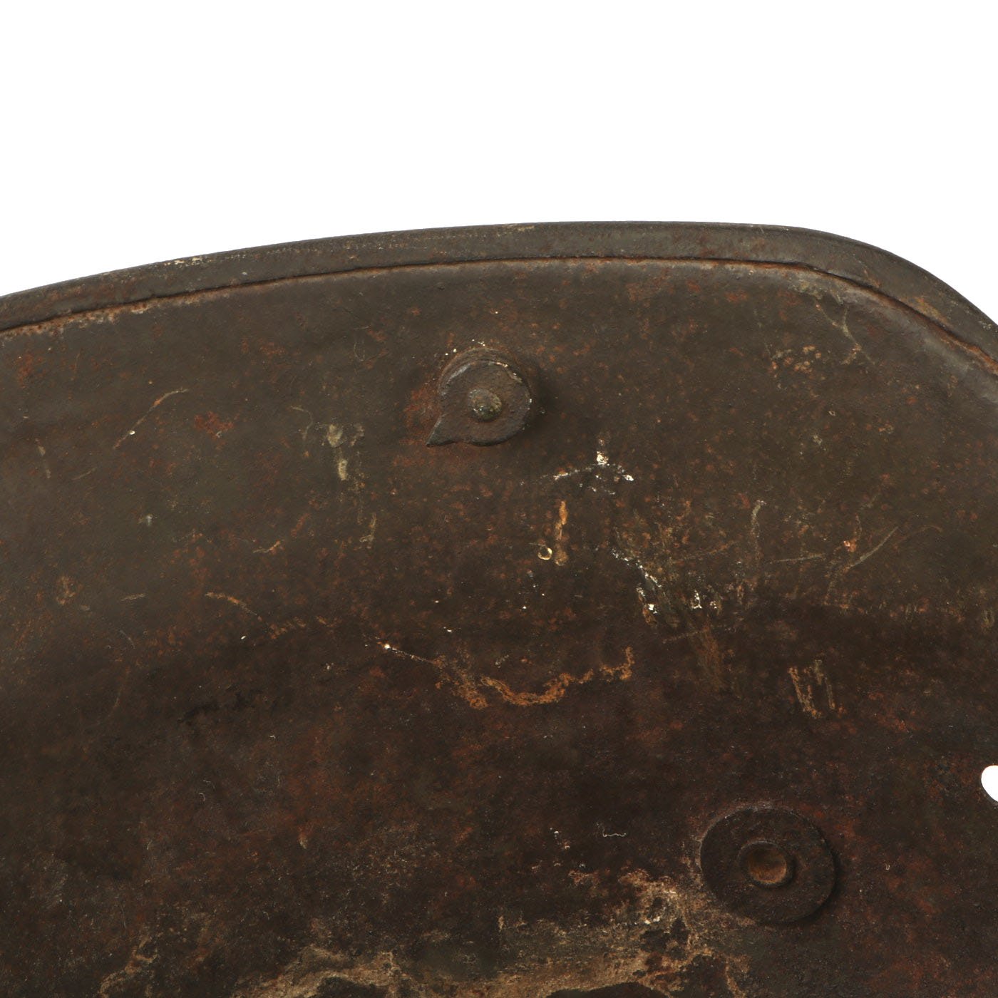 Original Item: Only One Available. This is a very nice example of a totally original WWI German M16 Helmet shell, with a great look and markings. The original green paint is still well retained inside the shell, with about 60% still present on the exterior, with areas of paint loss and oxidation. It does not look to have been repainted at any time. The entire liner is missing, very common to find on early helmets, as the liner was entirely leather, and once it deteriorates there is nothing to hold it in place. It does still have two of the three split pins, including the rear pin with the larger head.