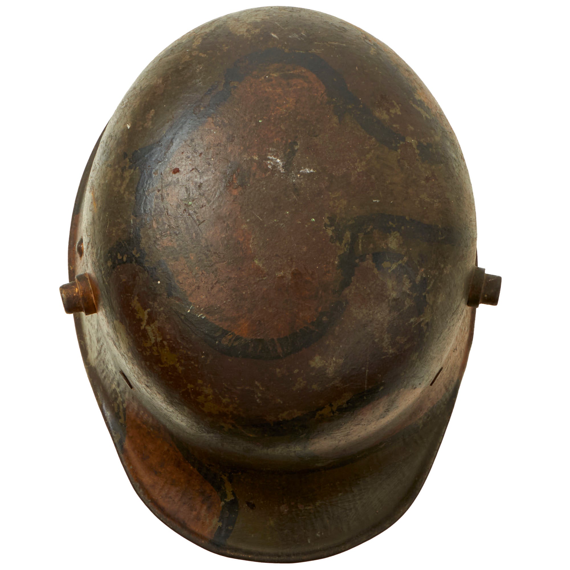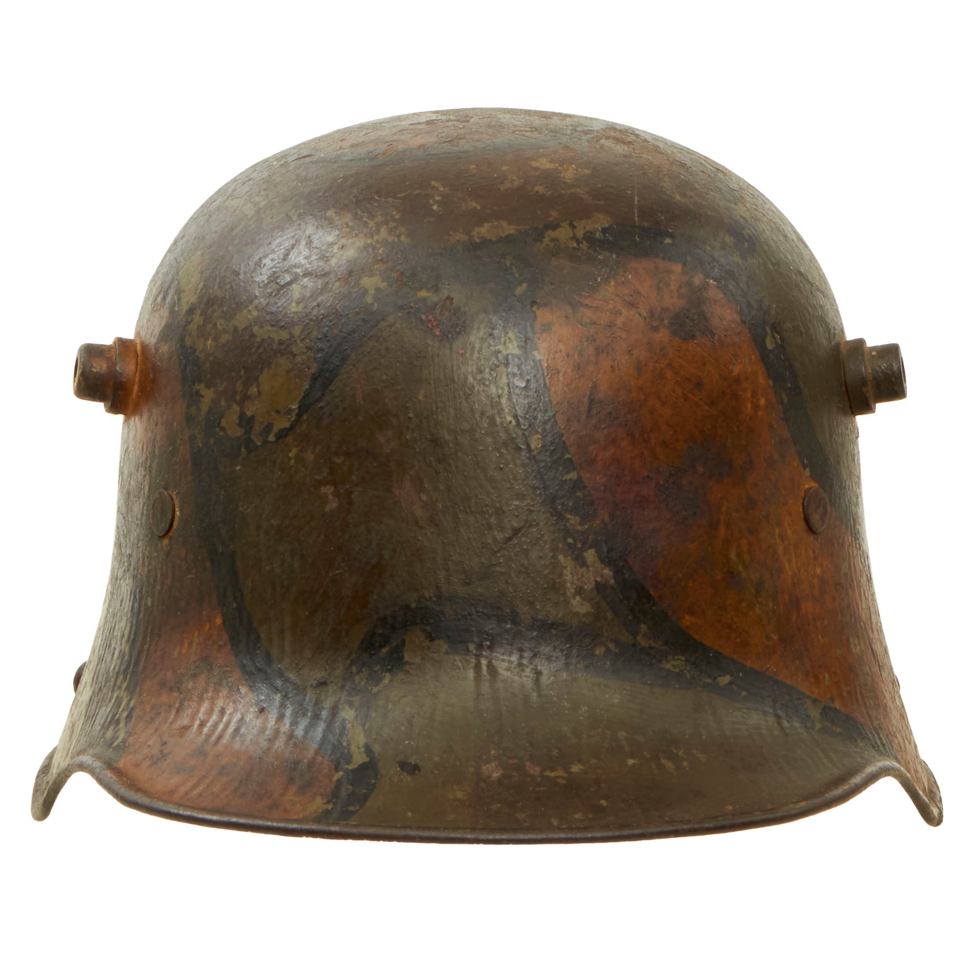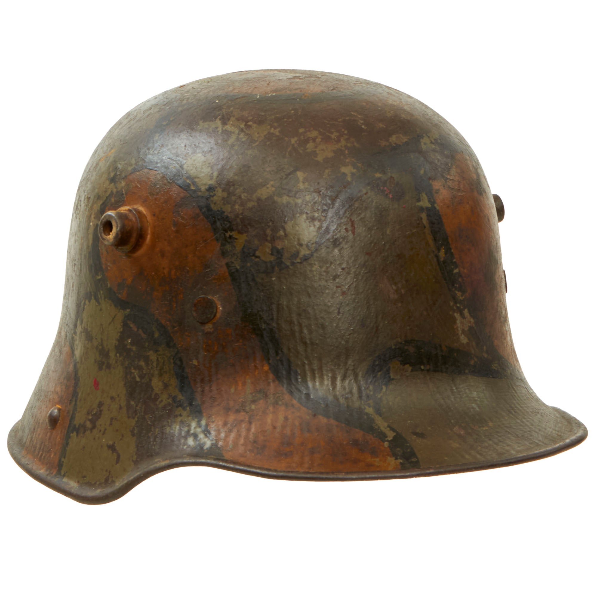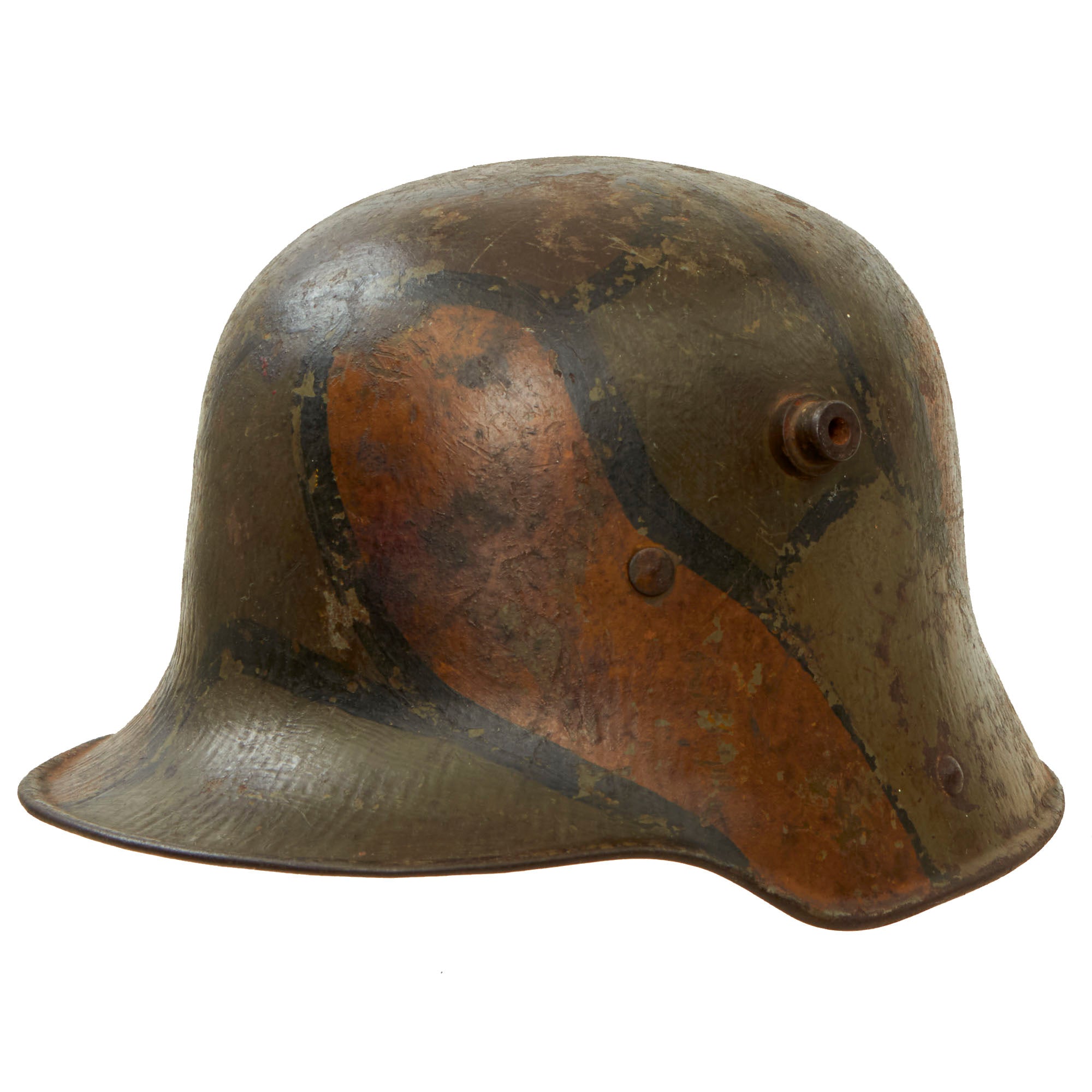 Original Item: Only One Available. This is a very nice example of a totally original WWI German M16 Helmet, with a fantastic "paneled" camouflage paint scheme. This was a very popular type of camouflage used on both sides of WWI. The colors include yellows, greens, and browns, with black lines separating each color, the CLASSIC pattern. The stamped, sheet steel construction helmet retains about 75% of its original hand painted camouflage paint. This was painted over the original field gray paint, so this is visible in areas where the paint has flaked off, while others show the bare steel, now oxidized. It appears there was a brown paint used on three panels which did not adhere very well, so the original feldgrau is visible underneath