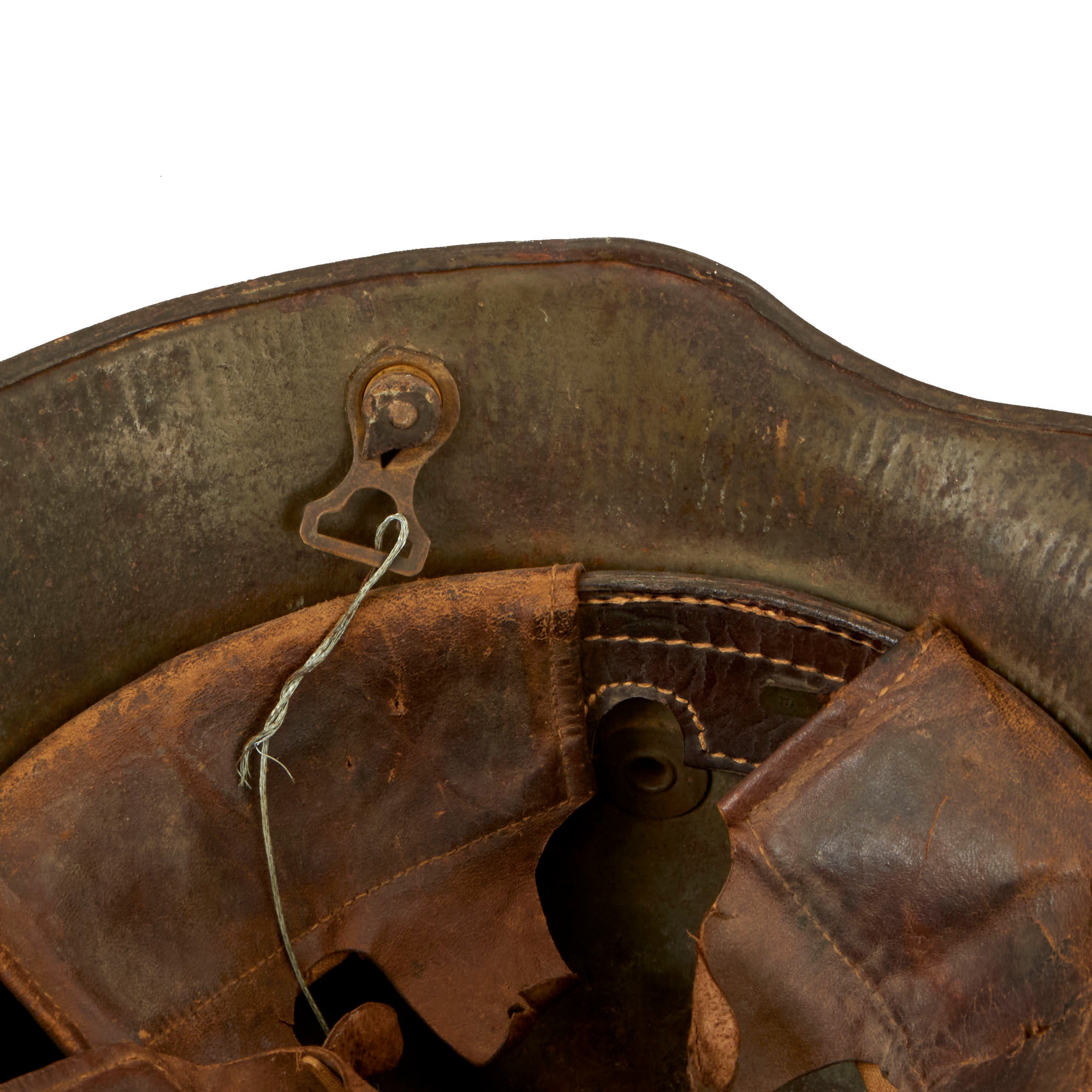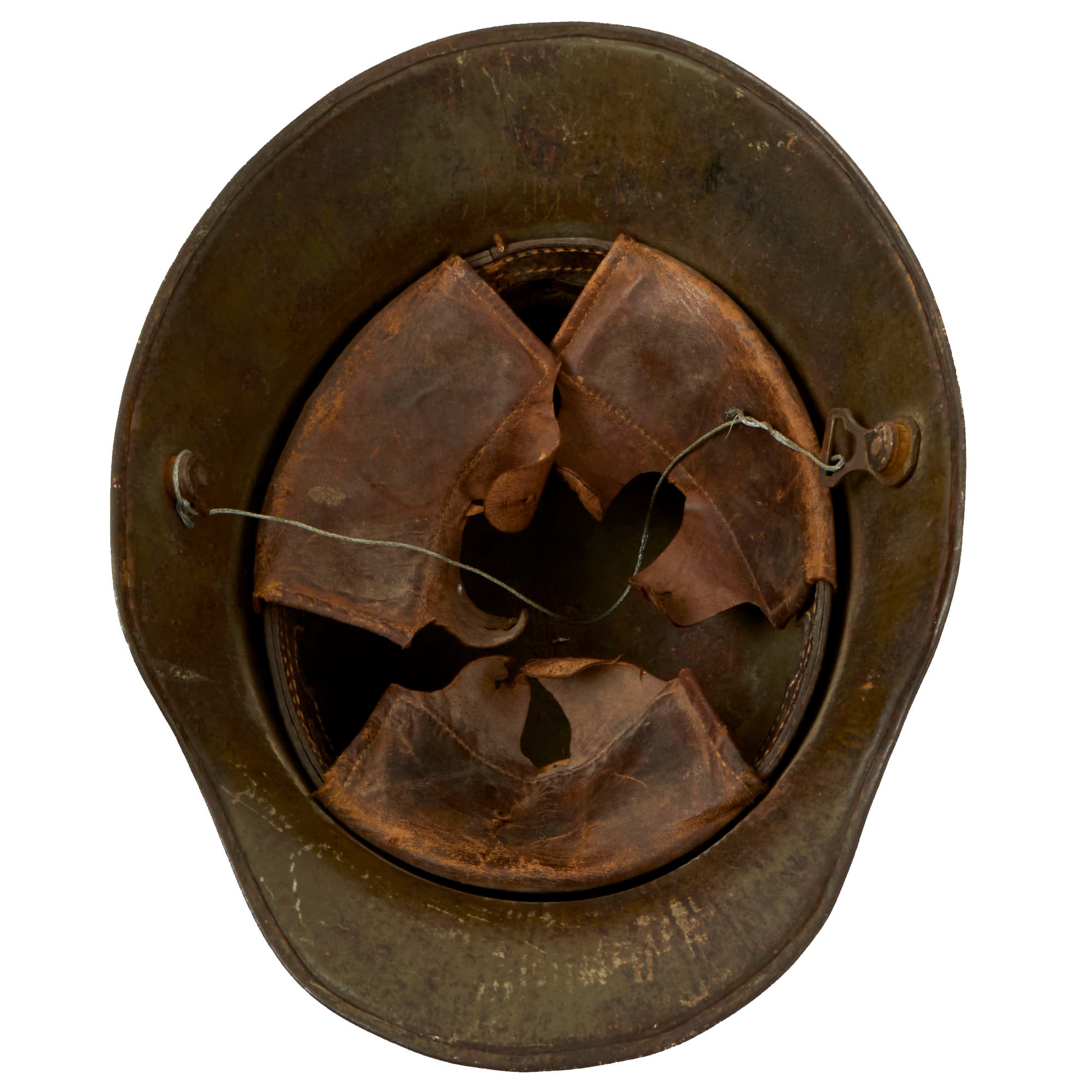 All three liner splint pins are still present, including the correct thicker rear pin, and all retain the camouflage paint. The original earliest pattern leather band liner is still present, held in placed by the two front split pins and the rear pin. All three original leather panels are intact. As this helmet still has the M1916 liner band, this soldier wore this helmet from 1916 through 1918, painting it camouflage per the instructions of the July of 1918 Ludendorff Camouflage Directive.