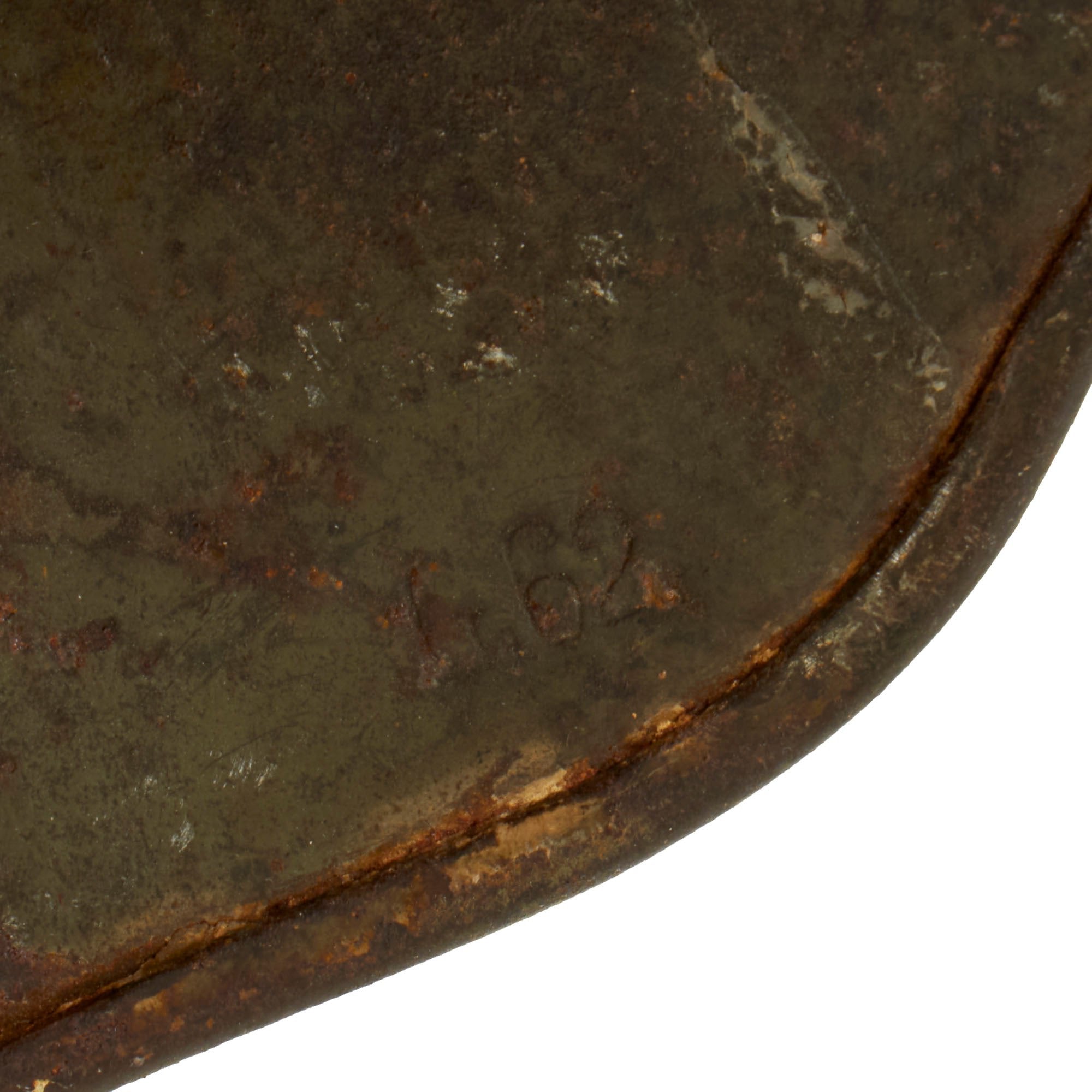 The shell still has an original maker mark over the left ear: G.62. This is the marking for helmet maker Gebrueder Gnuechtel A.G., Lauter in Sachsen, which made shells in ONLY size 62 during the WWI period. This is a very sought-after maker, whose helmets have a unique shape that experienced collectors will recognize immediately. The top of the shell has a rolling mill mark, R400, indicating the steel was made at Stahlwerk Röchling in Volkingen.