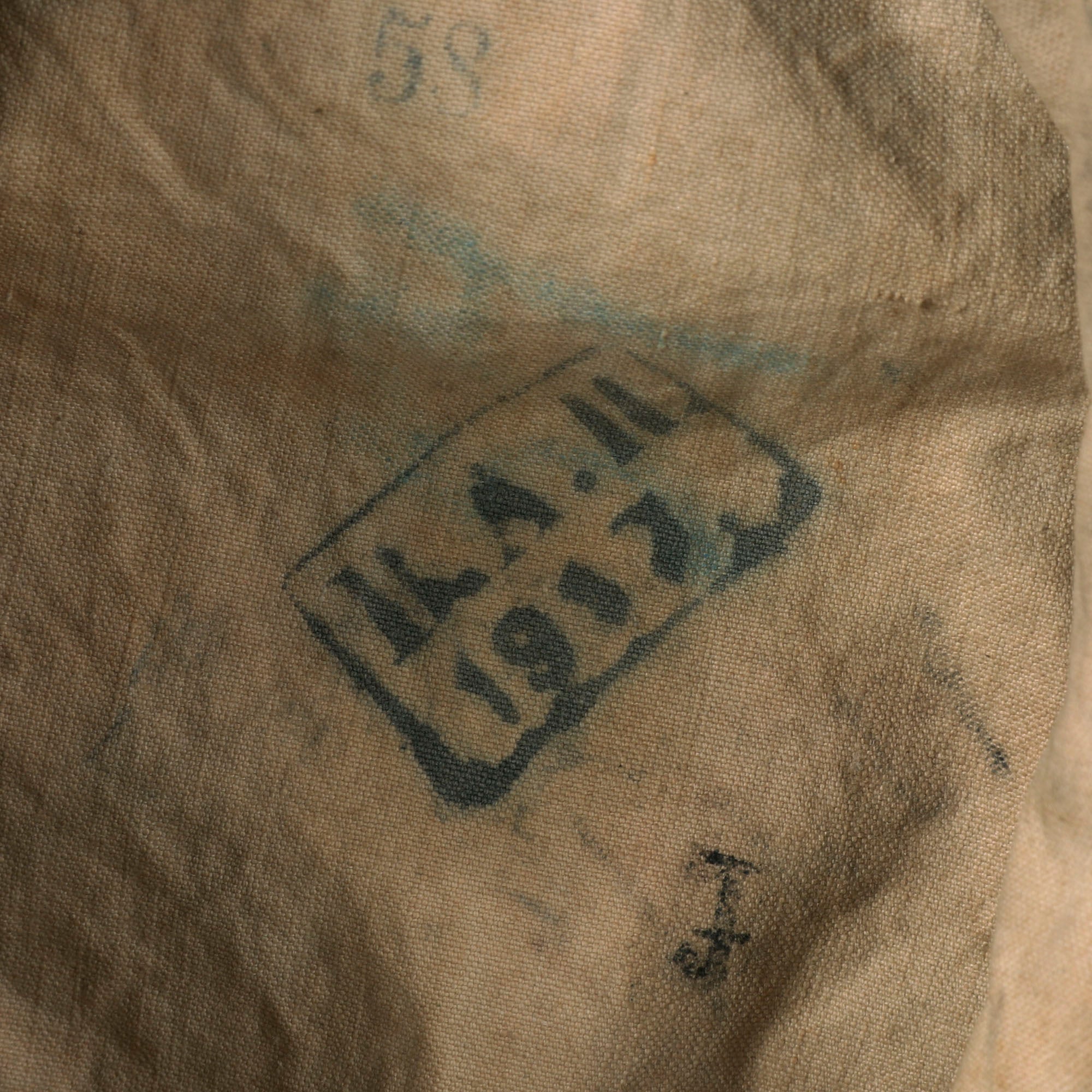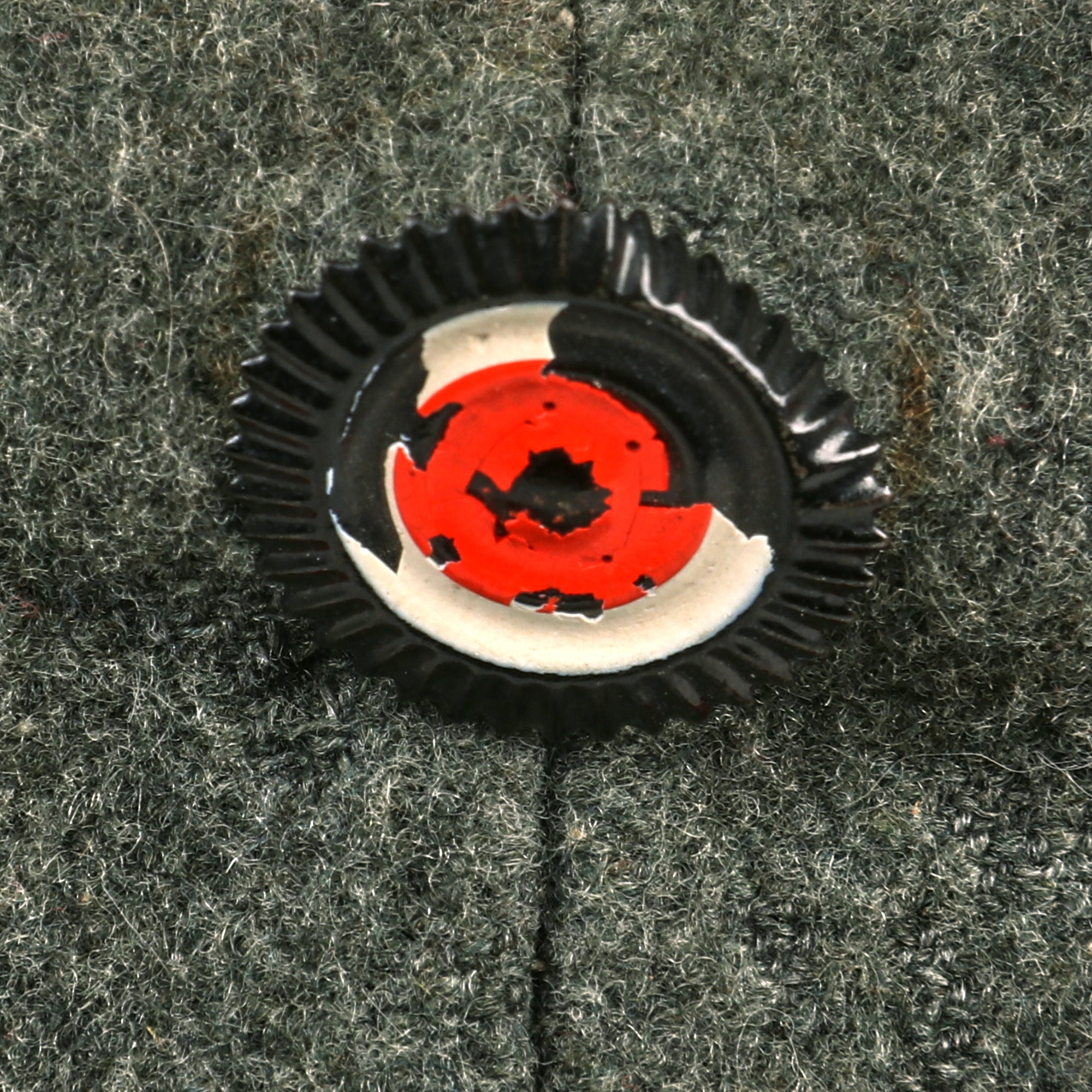 This M1907 Feldmütze has a great 1917-dated depot stamp reading B.A.II. 1917 which indicates the II Armee-Korps (Stettin). There is also a faint size stamp, 58. There is also a single J stamp, which could indicate J - Instandsetzungsamt - repair depot. This feldmütze has some heavy mothing across the wool exterior as shown, but does not take away from the overall beauty of the cap. The top cockade on the mütze is the Black, White and Red Reichskokarde (Imperial Cockade) the top of this cockade being bent back slightly as shown. The bottom and slightly larger cockade is that for the German state of Bavaria. The cockades are both in fair shape, but they do show wear and have paint loss, as shown.