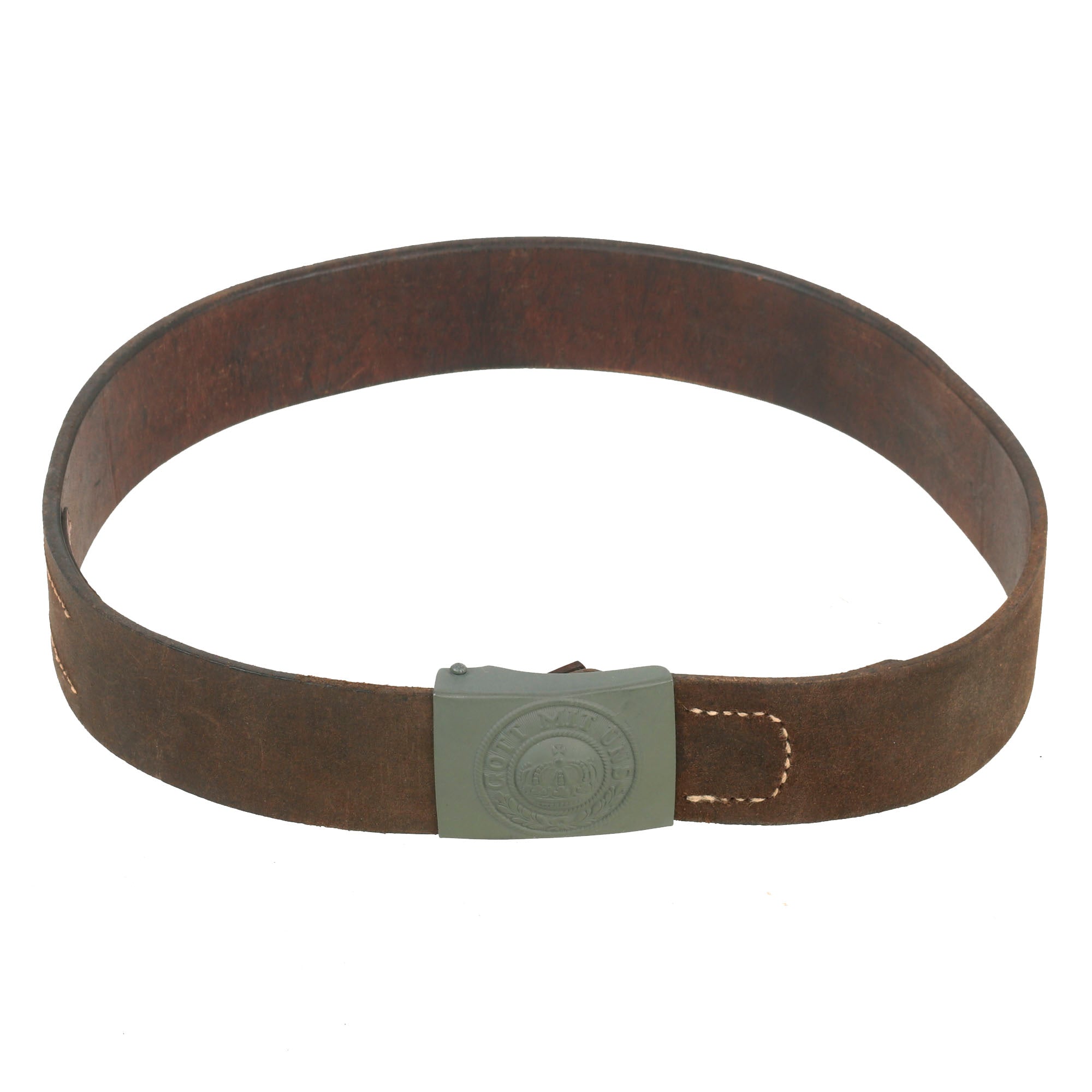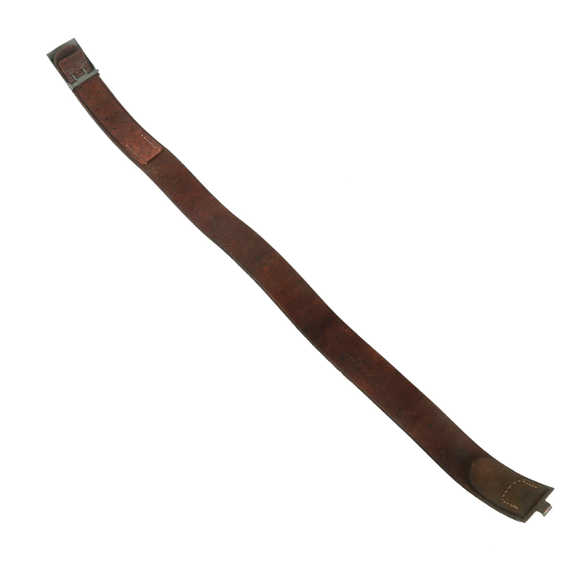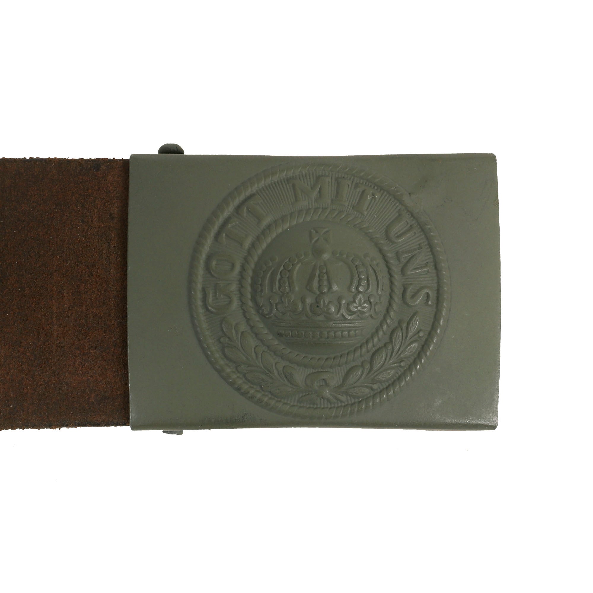 Original Item: Only One Available. This is a very nice WWI Imperial German Waist Belt, with the correct M1915 Prussian Steel Belt Buckle (Koppelschloß). This buckle features brass construction, with a 45mm, slightly convex, stamped metal box buckle. This features the Prussian Crown, encompassed by a dual rope-like border within which, against a ribbed background, is the Prussian motto GOTT MIT UNS (God [is] With Us), and a spray of laurels. To the reverse is its welded-on buckle catch, and a metal prong bar with dual prongs, for the belt’s retaining tongue, with the original leather pull tab.