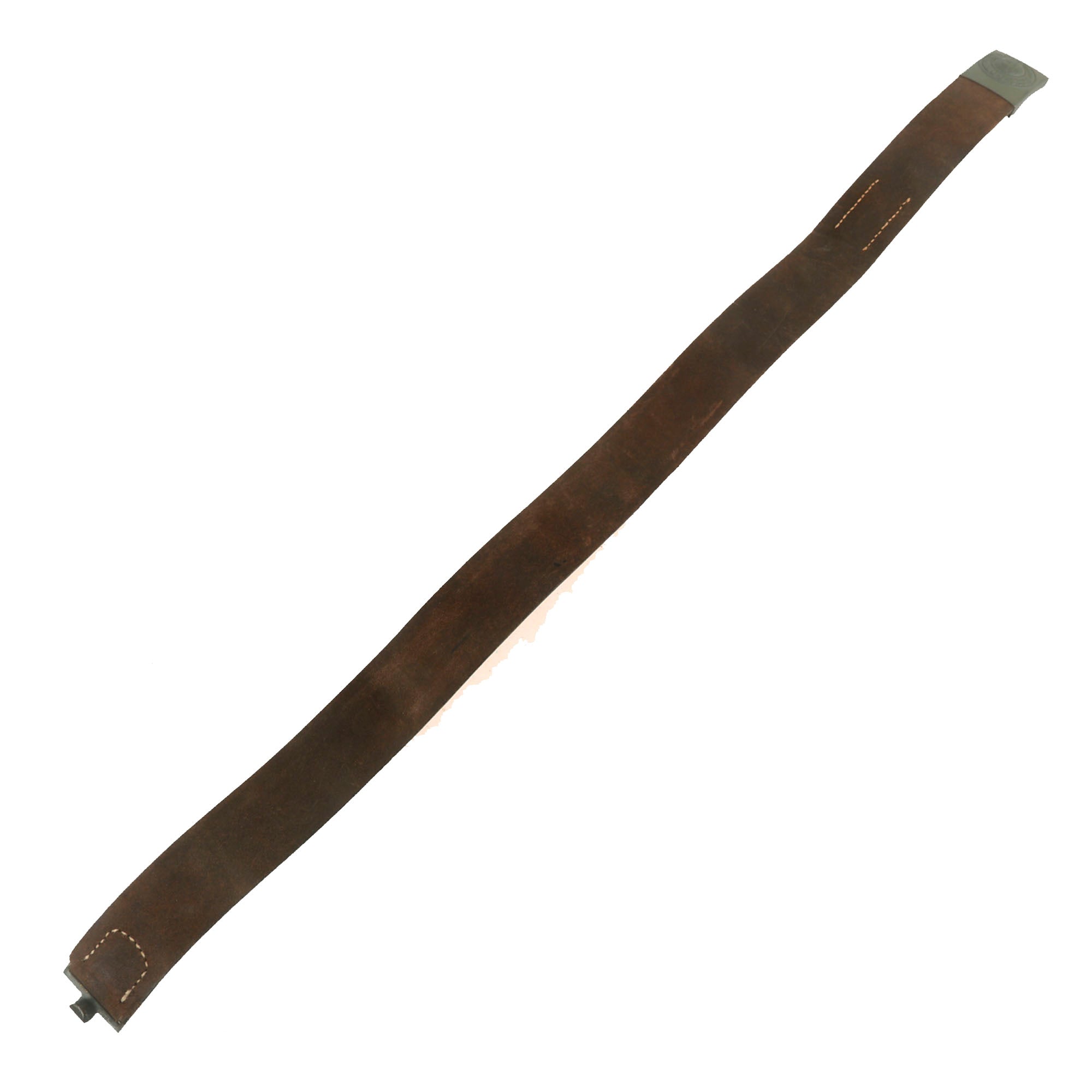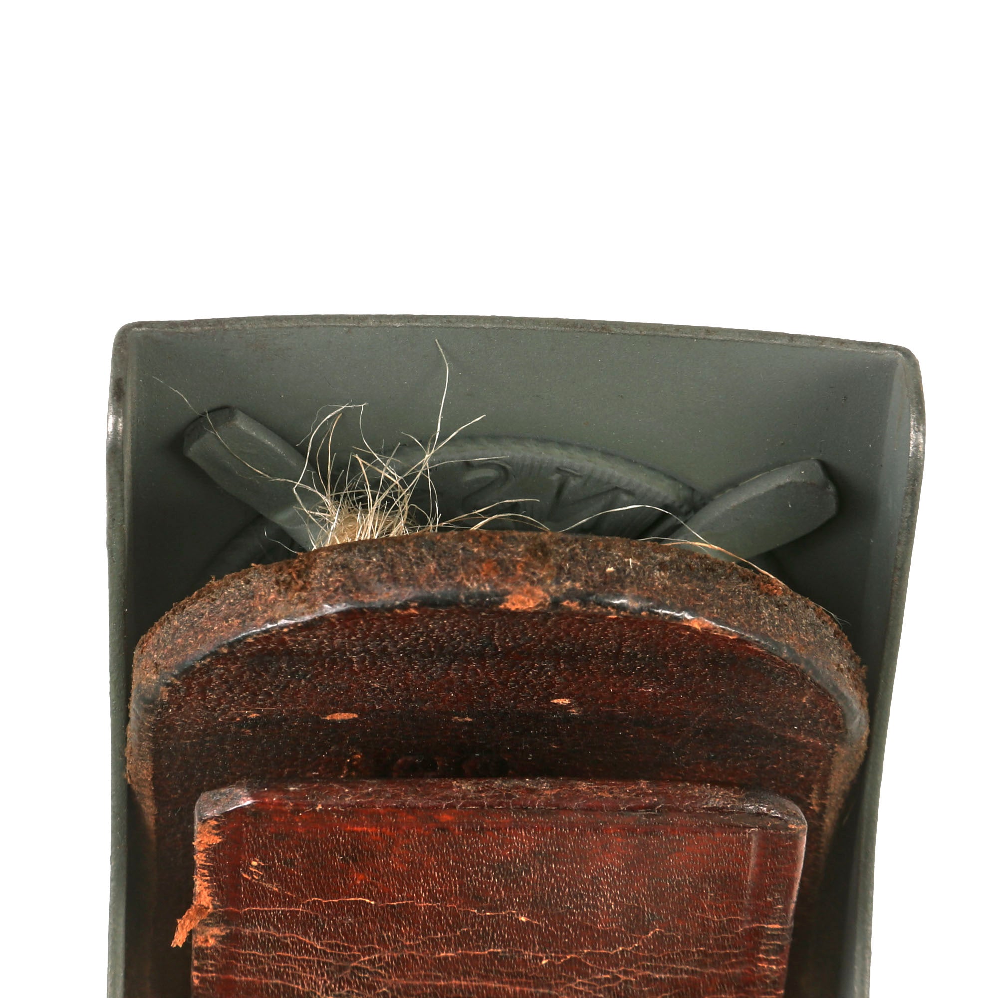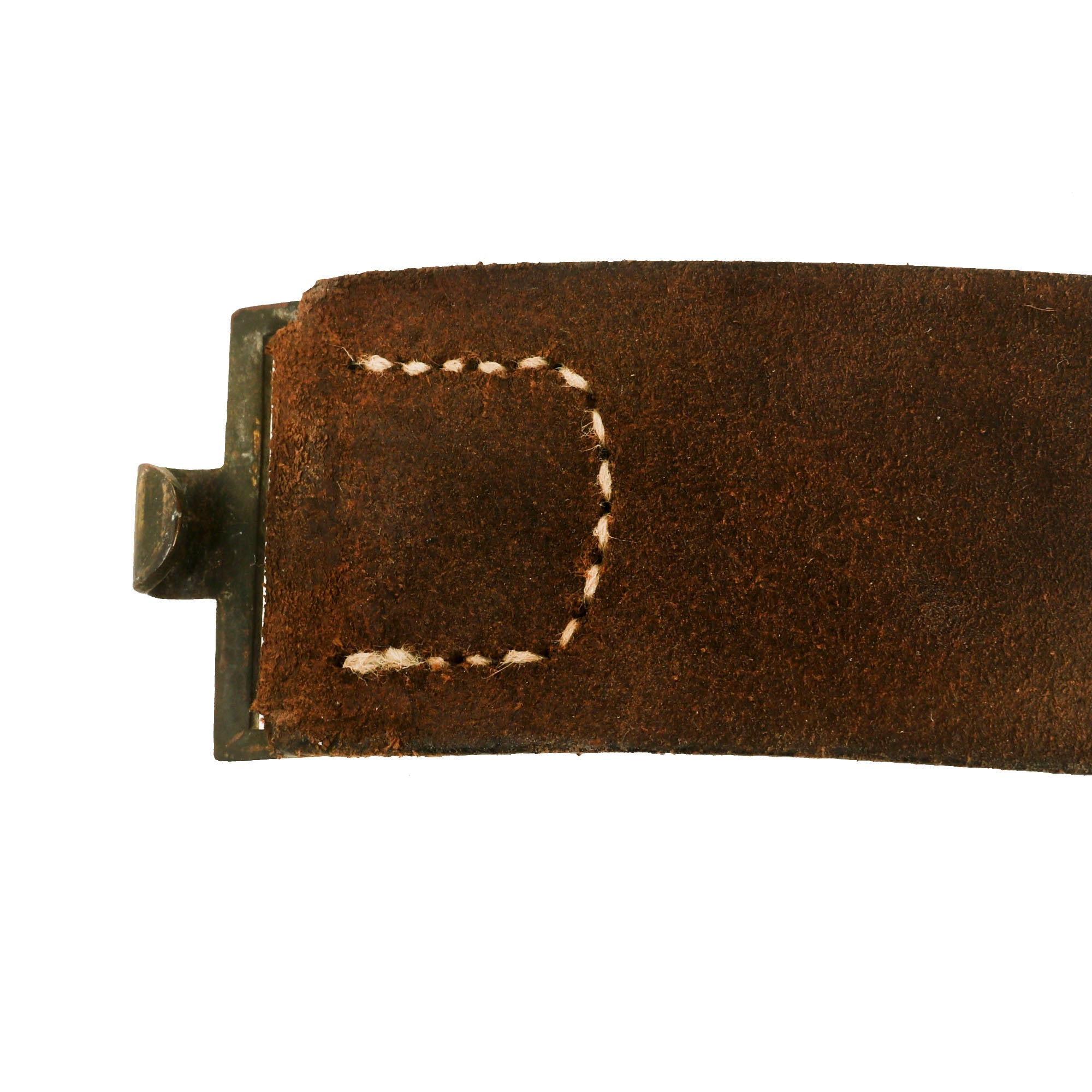 The buckle is in amazing unissued condition, with none of the paint missing. We have seen similar unissued buckles and they are exactly like this. A very attractive display piece that still retains most of the detail on the insignia. The leather tab is good but worn condition. Unfortunately any stamps that were present on the leather are no longer present.