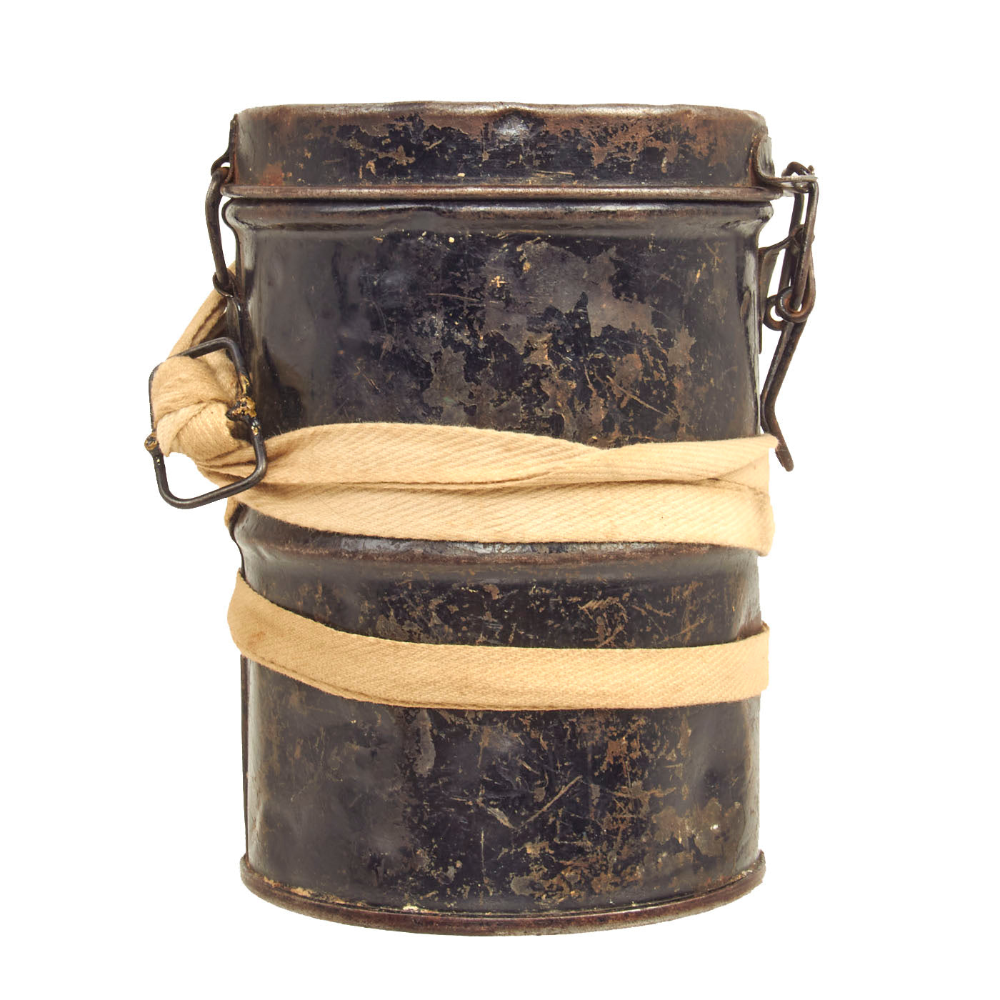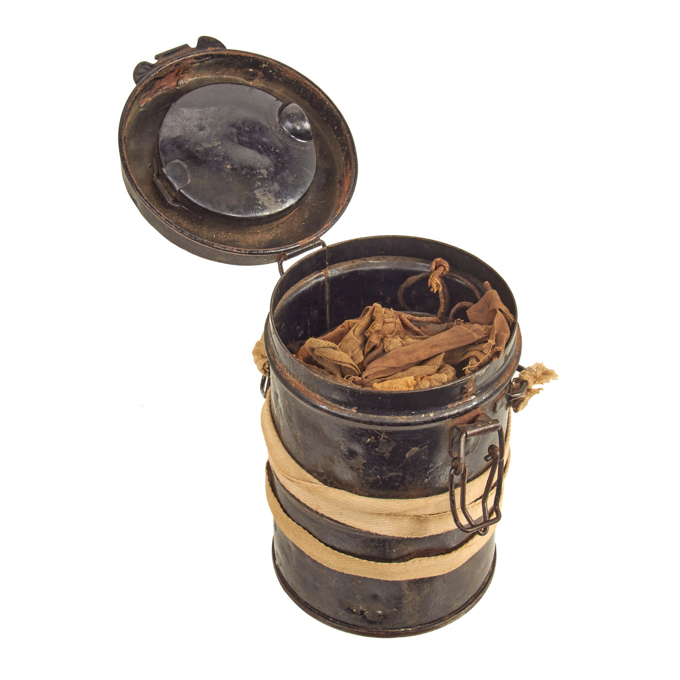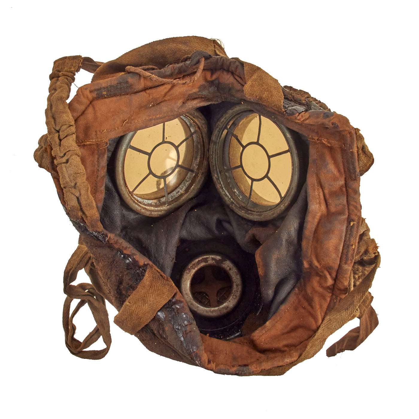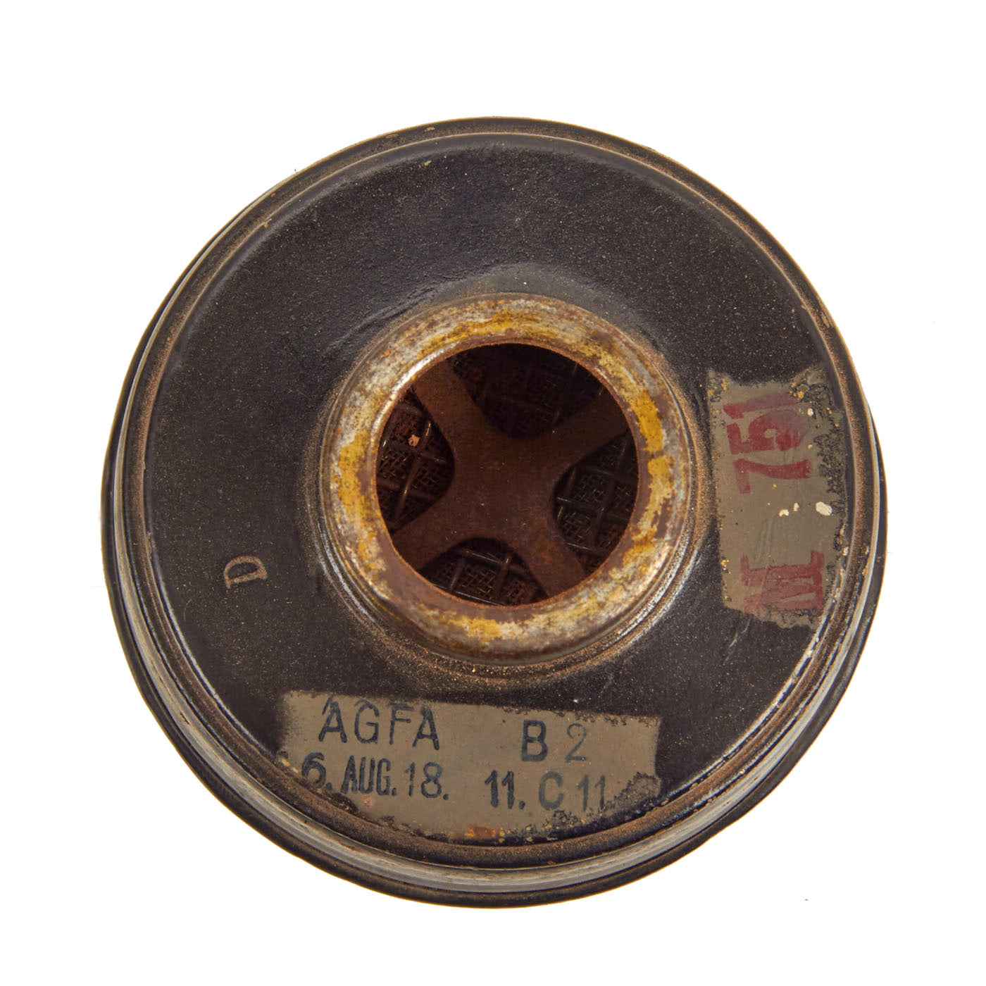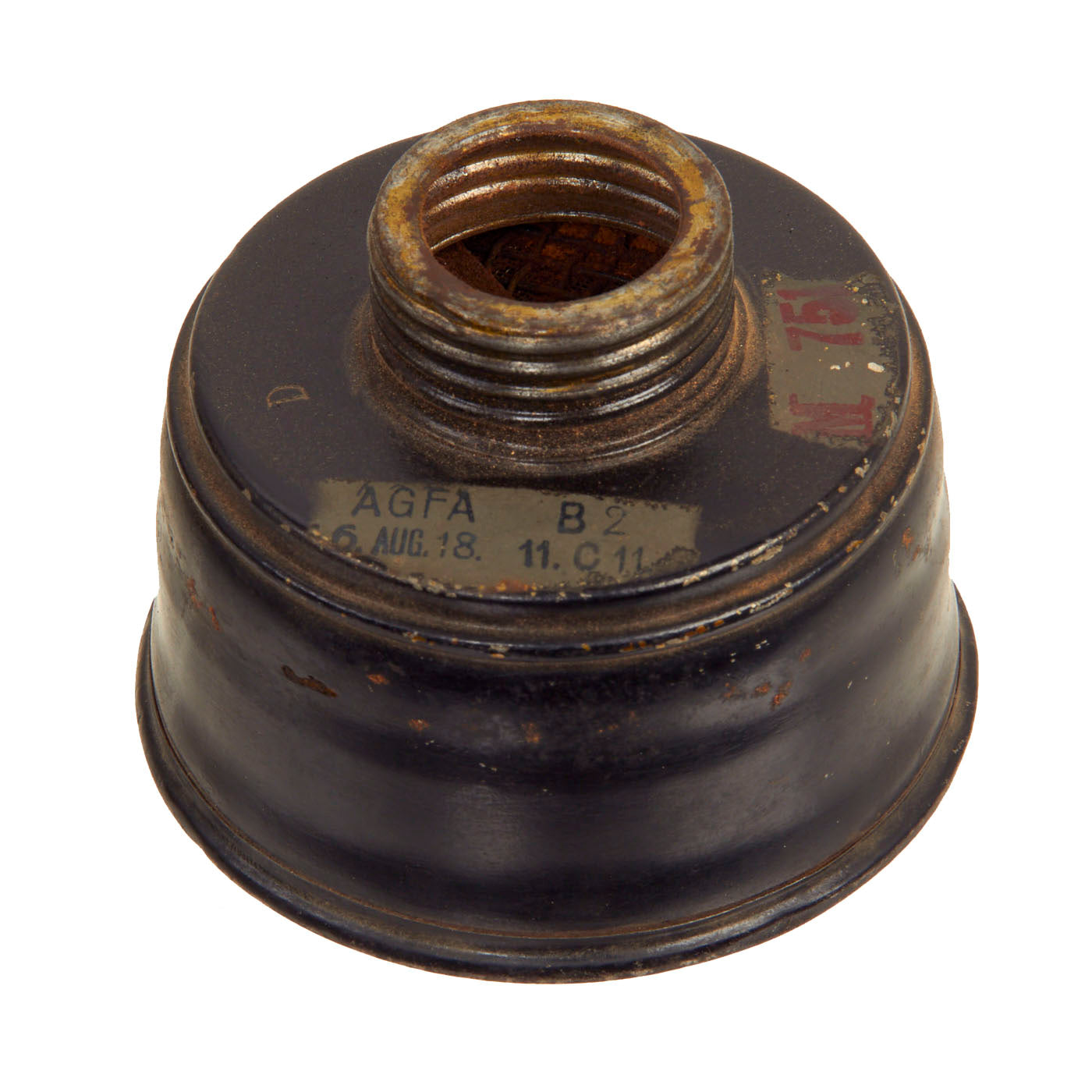 Original Item: Only One Available. This is an original WWI German issue M-1917 Gas Mask (Lederschutzmaske). The mask is constructed of leather (still soft) with canvas straps (one strap is torn, unfortunately). Metal eye guards are still intact and complete with original lenses. The filter is nicely marked and ink stamped with date 6. AUG.18 (6 August 1918) along with manufacture stamps and inspector markings. The carry can is in very good condition with much original paint remaining. The inside of the can has the original instruction label in the base of the interior of the can.