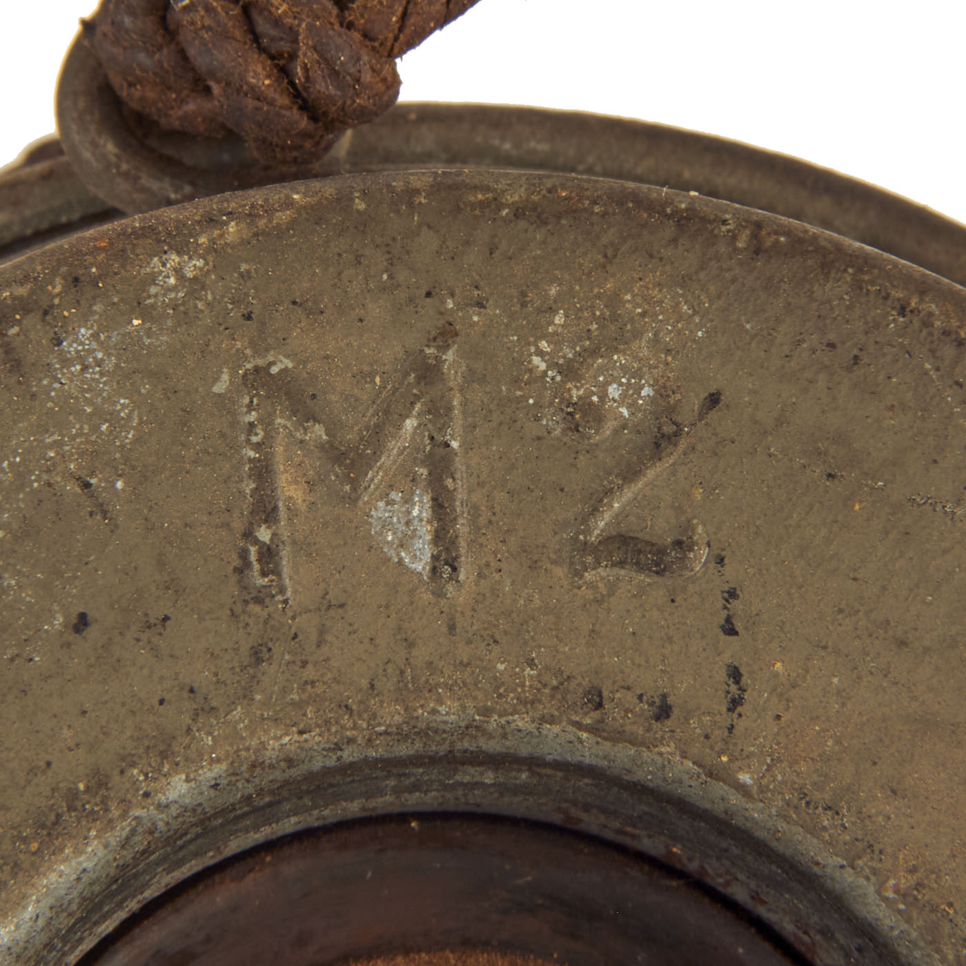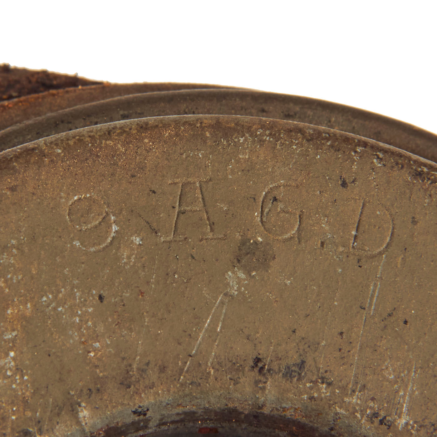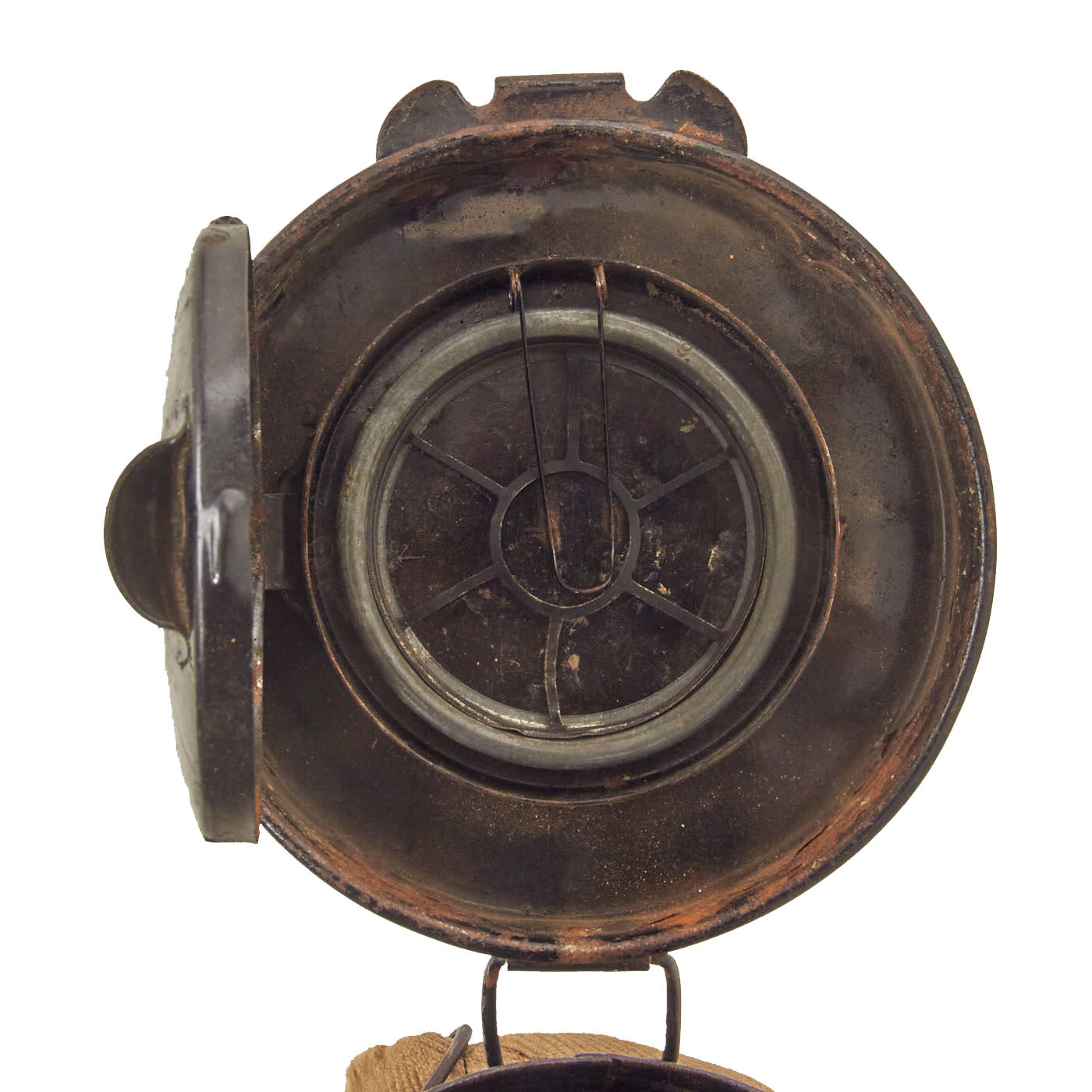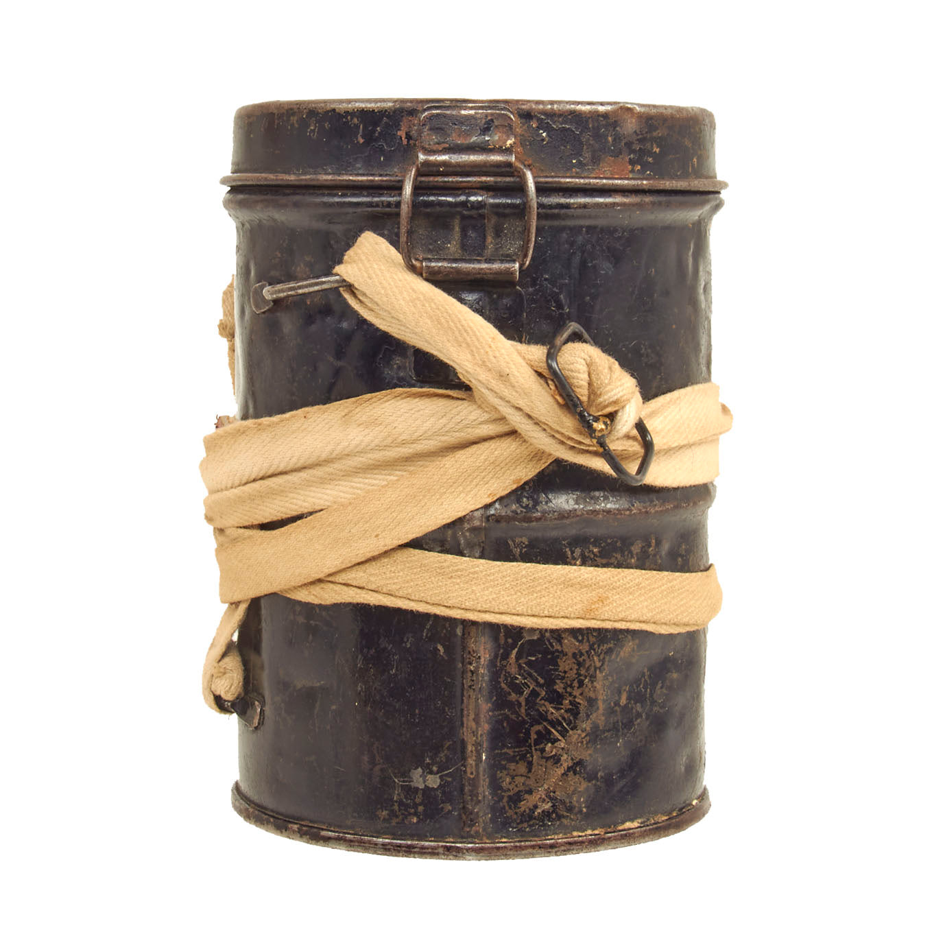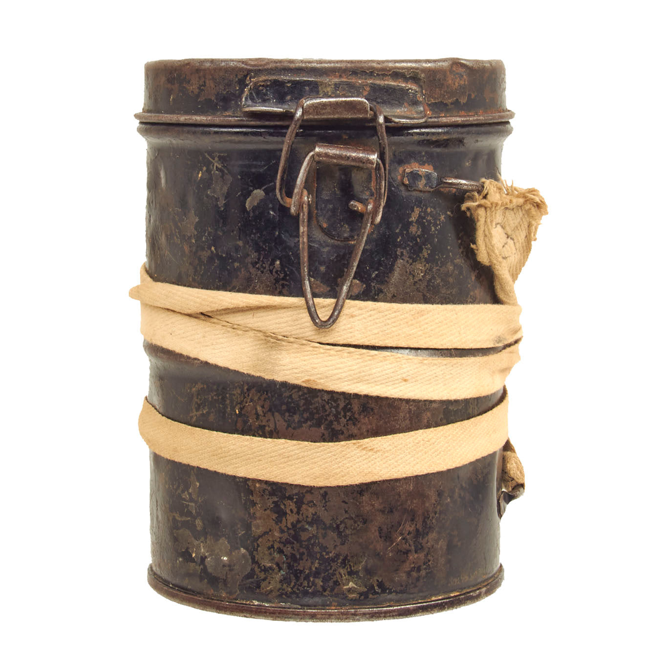 Original Item: Only One Available. This is an original WWI German issue M-1917 Gas Mask (Lederschutzmaske). The mask is constructed of leather (still soft) with canvas straps (one strap is torn, unfortunately). Metal eye guards are still intact and complete with original lenses. The filter is nicely marked and ink stamped with date 6. AUG.18 (6 August 1918) along with manufacture stamps and inspector markings. The carry can is in very good condition with much original paint remaining. The inside of the can has the original instruction label in the base of the interior of the can.