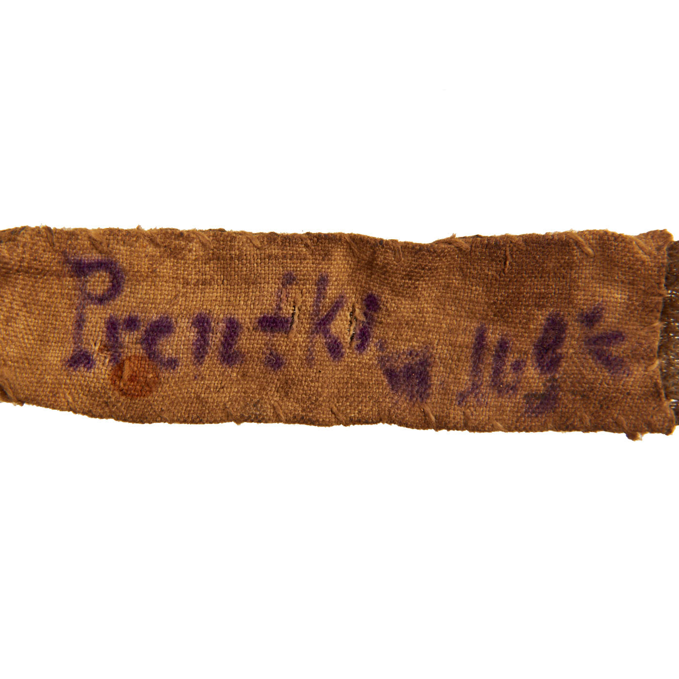The neck strap of the mask is named to “PRENTKI” with the initials “M.G.K.” which stands for Maschinengewher Kompanie (Machine Gun Company).