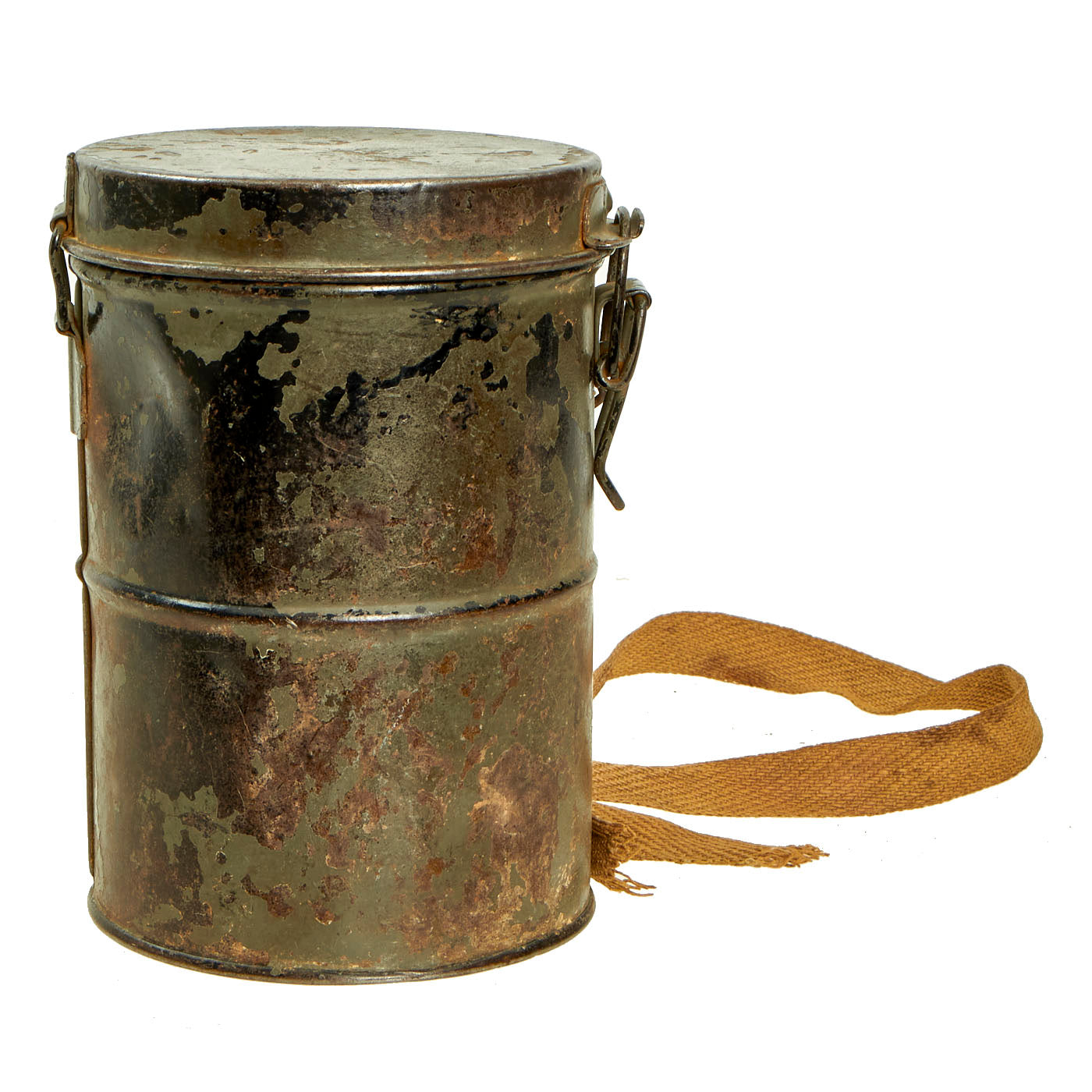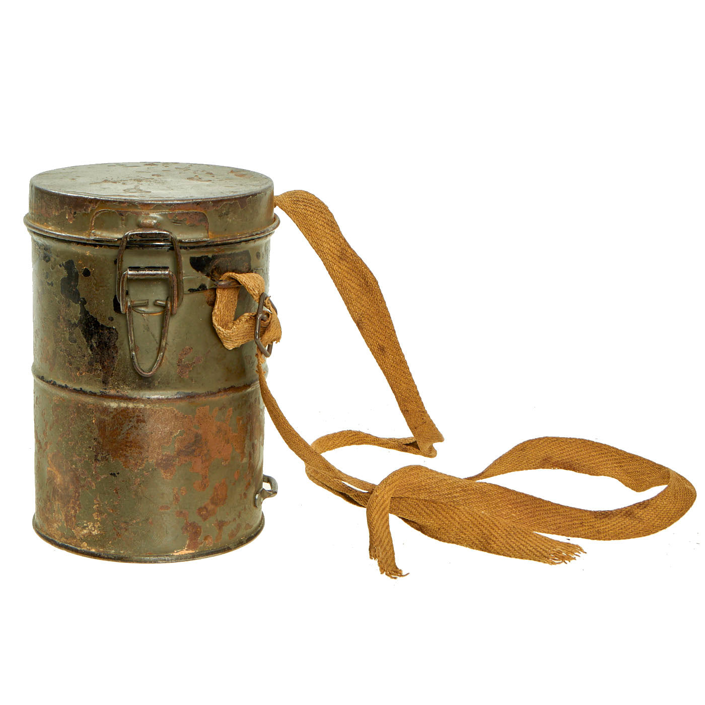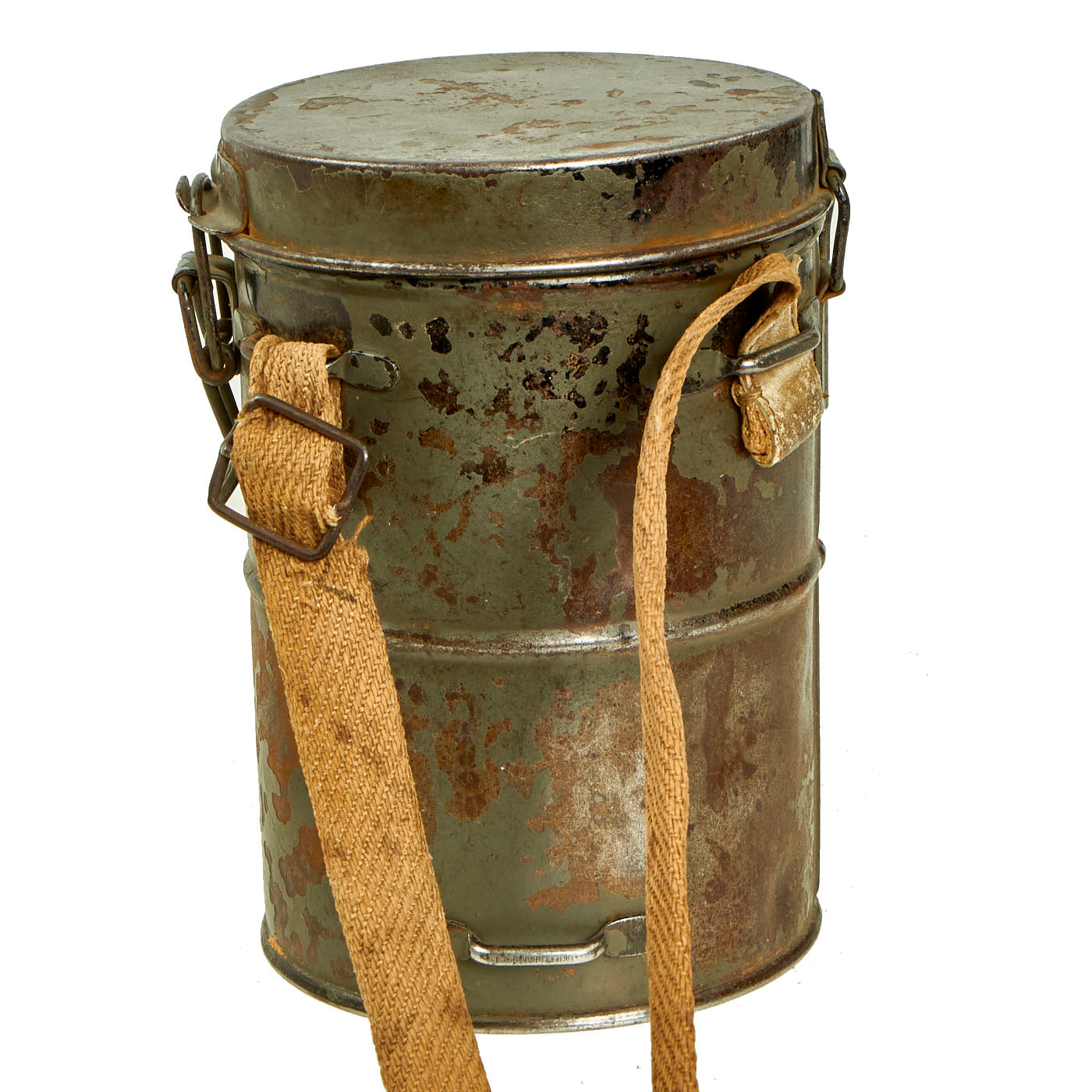 The carry can is in very good condition with much original paint remaining with the original paper cloth strap still present. There is denting present, consistent with everyday wear and use. The spare lens compartment has the lens insert packets inside, with a working hinge. The lid of the canister fits great, and has a fully intact and functional closure latch. The bottom of the can has a faint name written on it but unfortunately we cannot make it out.
