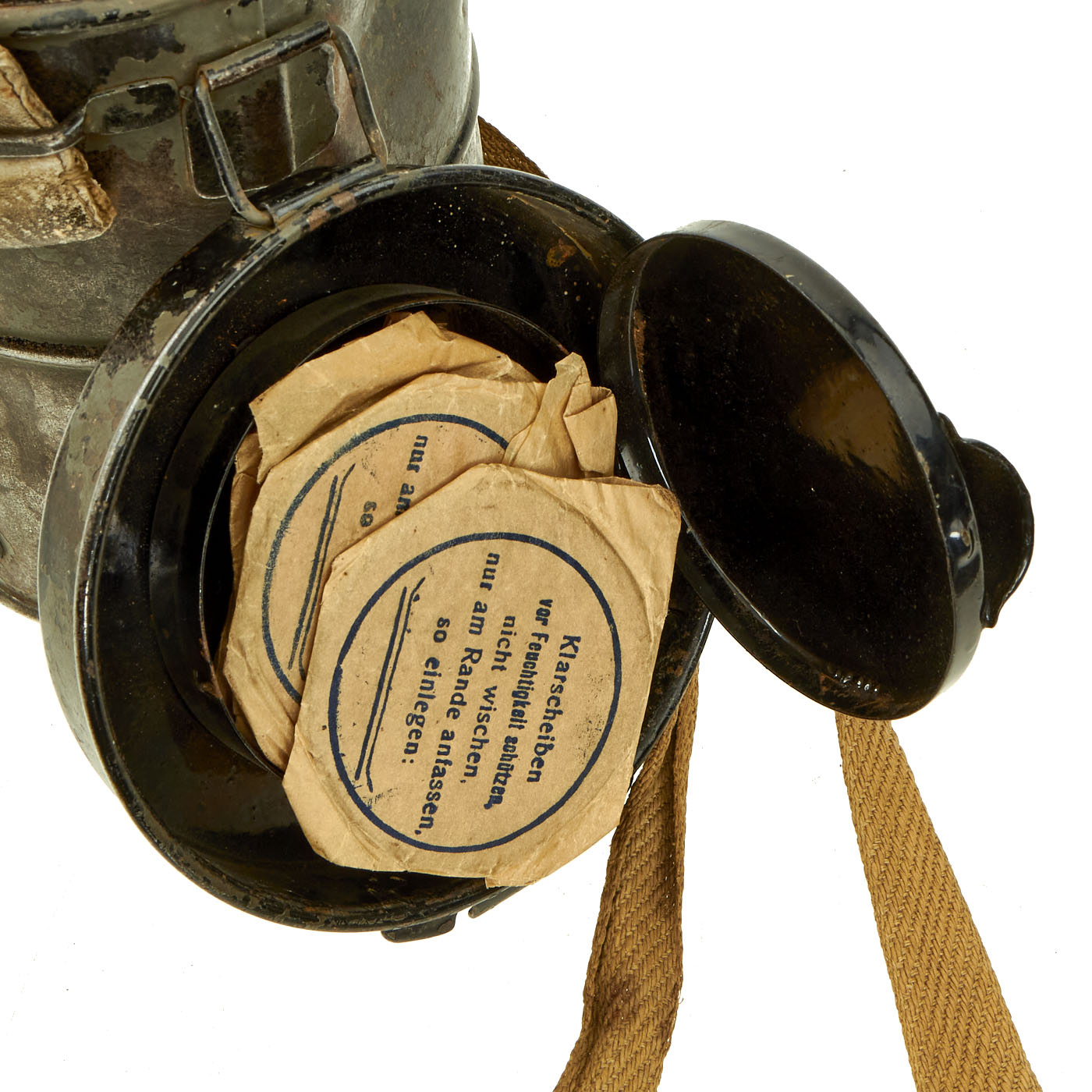 The lid compartment contains 4 Packets of spare lens inserts, which contains 2 lenses. The top of the filter is ink stamped with date marking AG B1 / 2. AUG. 18 11.C.11. It is in very good condition, with light wear.