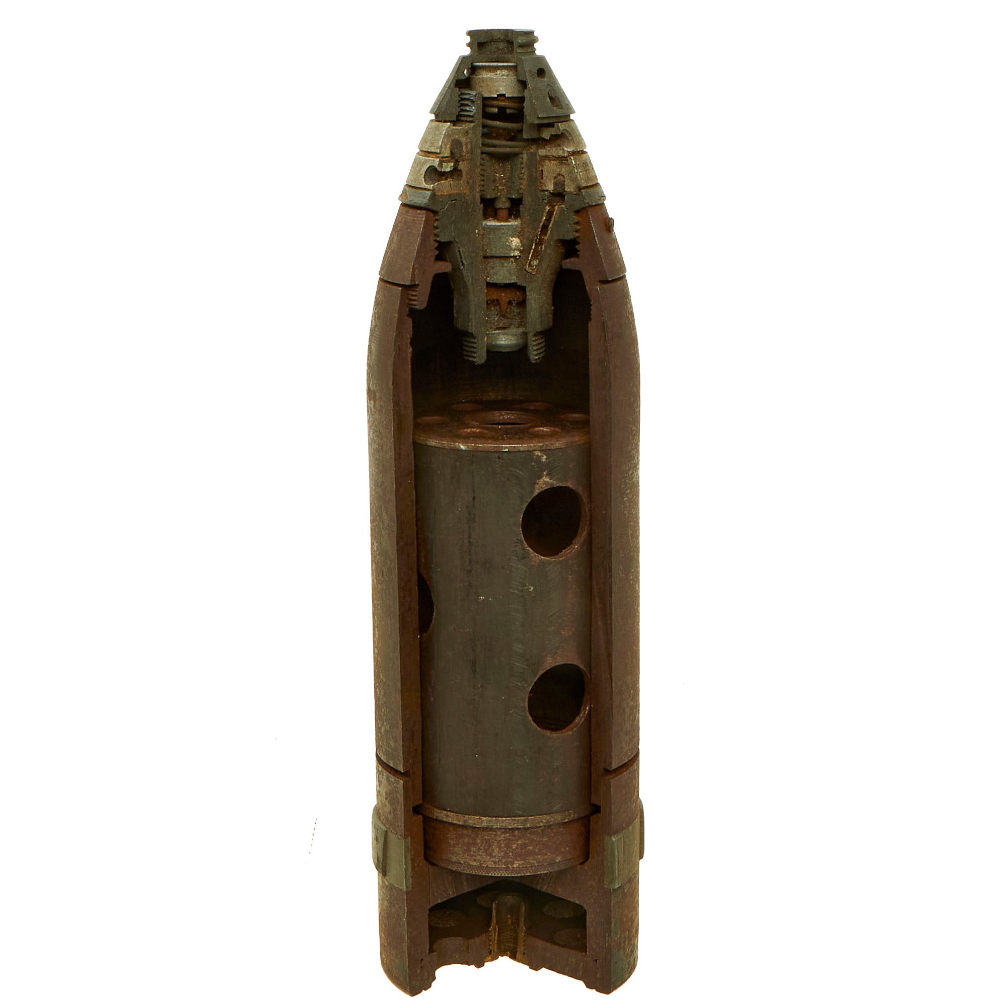 Minenwerfer Trench Mortar. It measures 10 1/2 tall and just under 3 inches wide, and has been cutaway to be used as a recognition/training aid and was period done. The top has an original I.M.W.Zdr.2 fuse.
