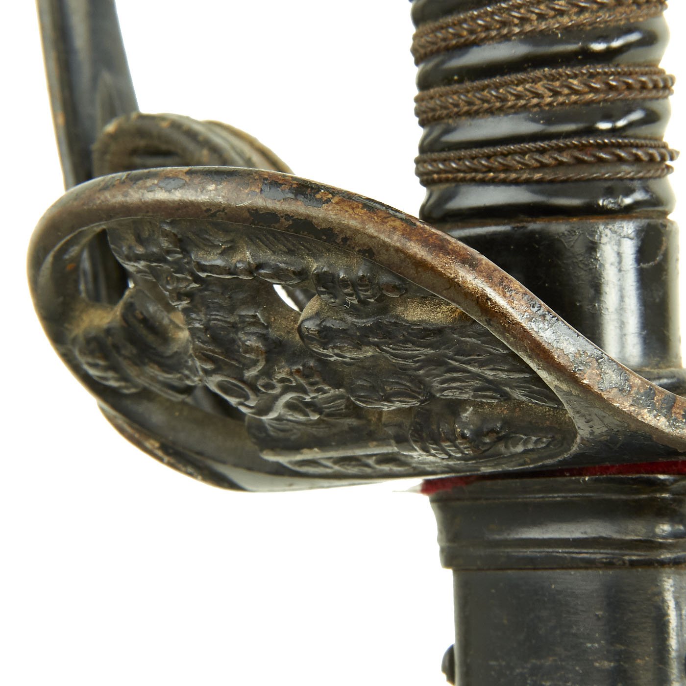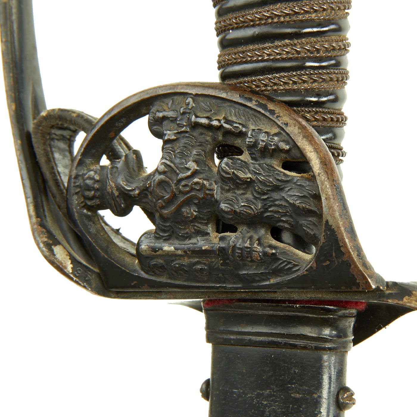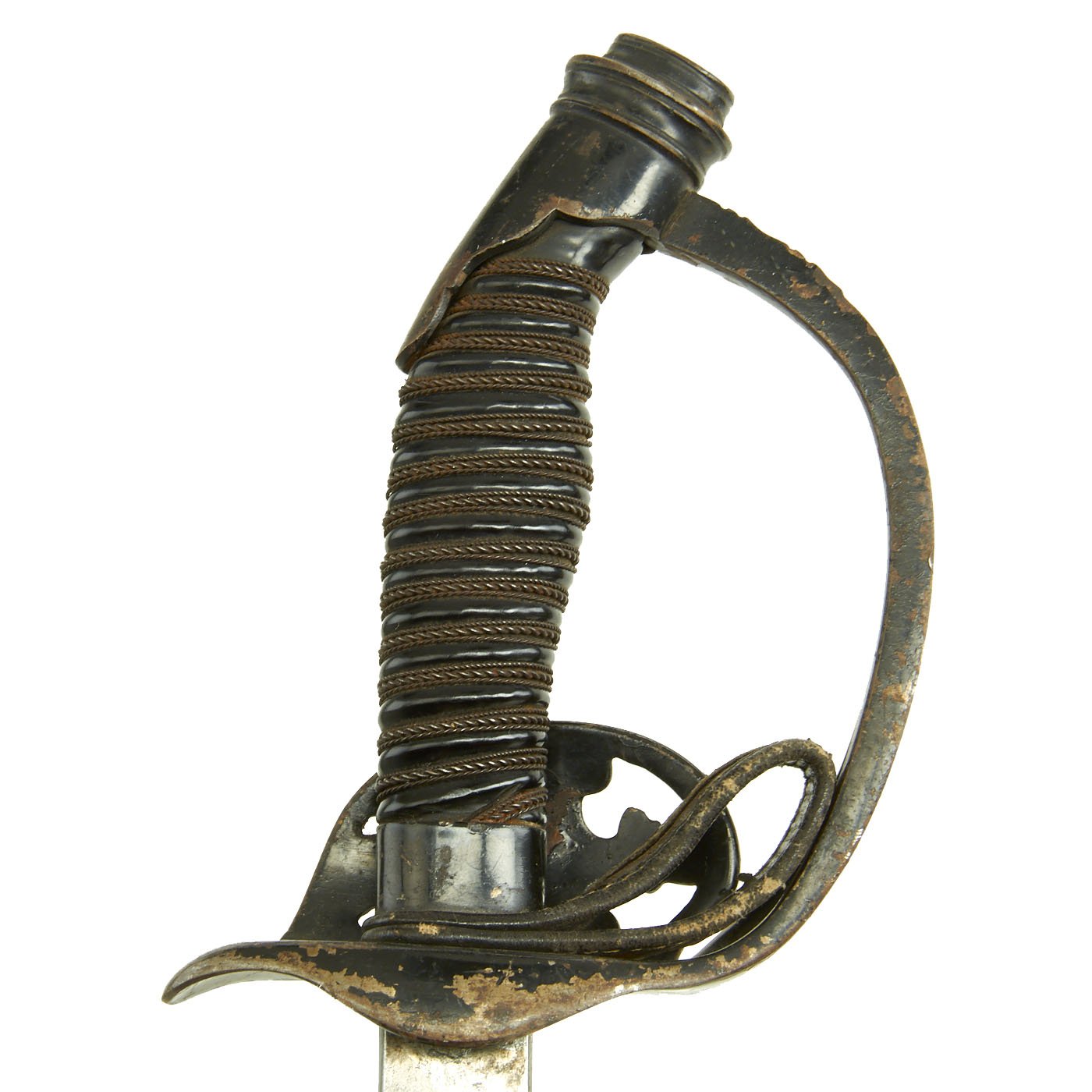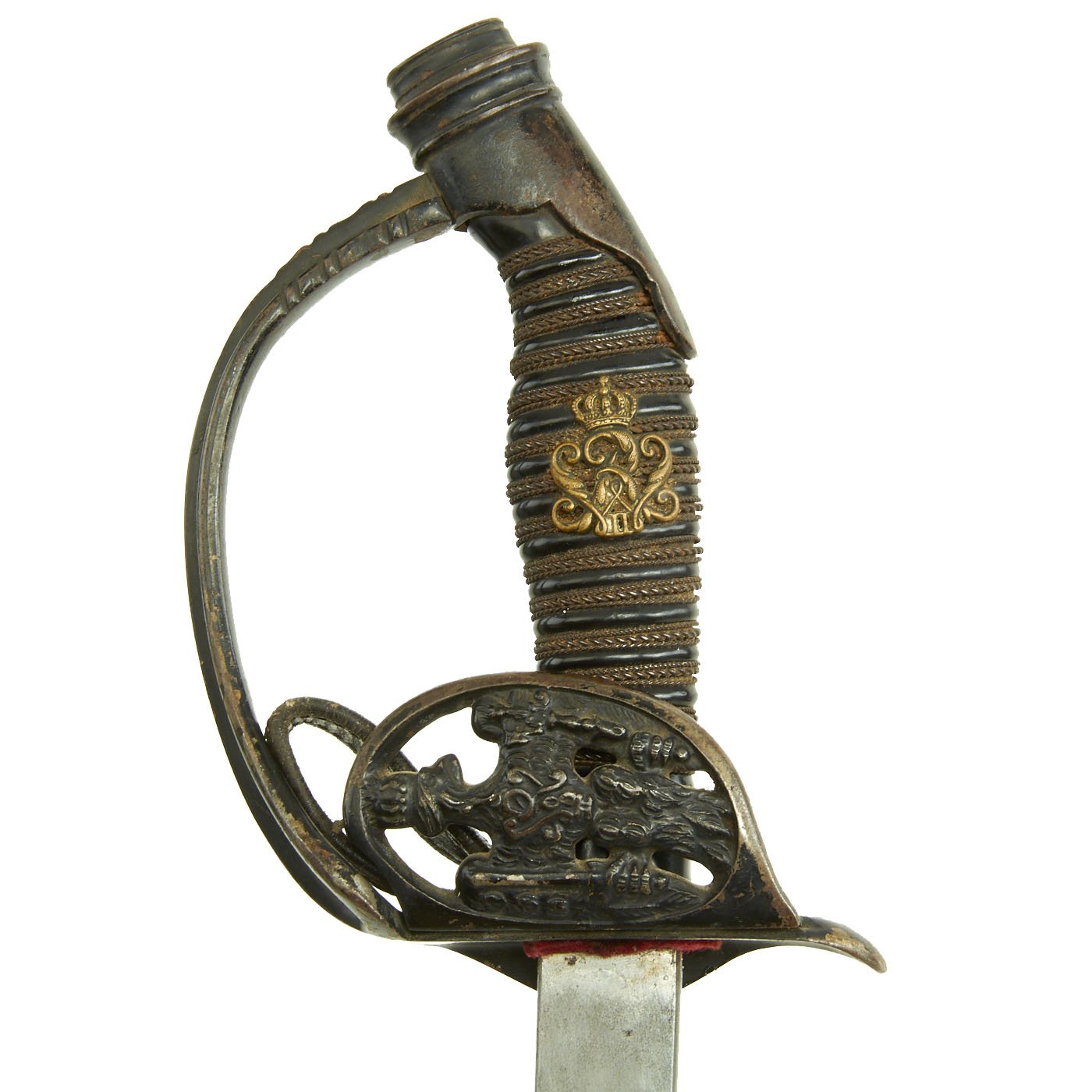 Original Item: Only One Available. This is a very nice WWI Imperial German Model 1889 Infantry Officer sword and scabbard, made by Pack, Ohliger & Co. GmbH of Solingen, offered in good condition. The D shape fold-away guard with the Imperial German eagle of Kaiser Wilhelm II has a black finish to it. The grip is brass wire bound over a celluloid base, with a brass cypher of the Kaiser in the center. The celluloid is in excellent shape. This model of sword has a leather forefinger loop on the inside of the guard, and has good stitching and condition of the leather.