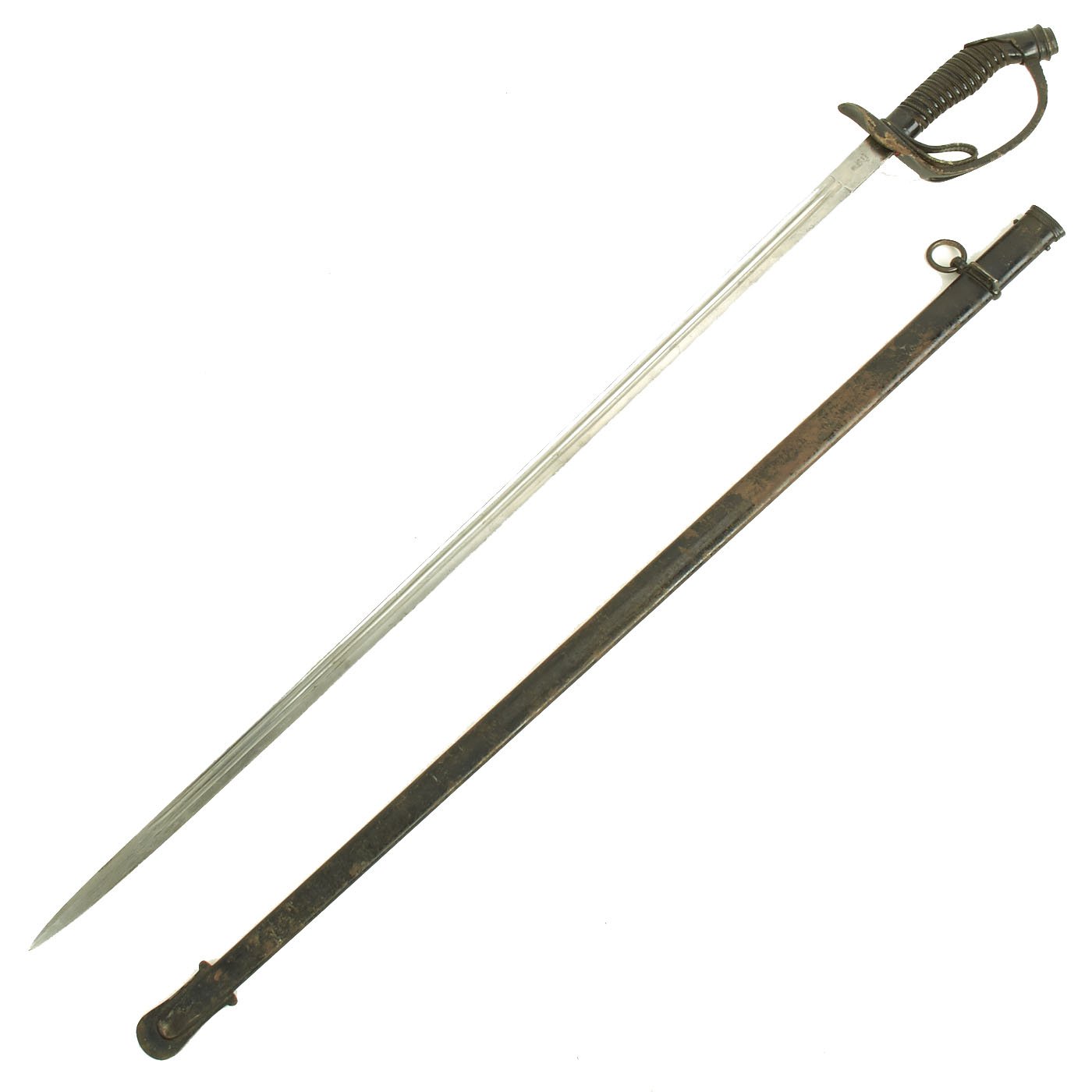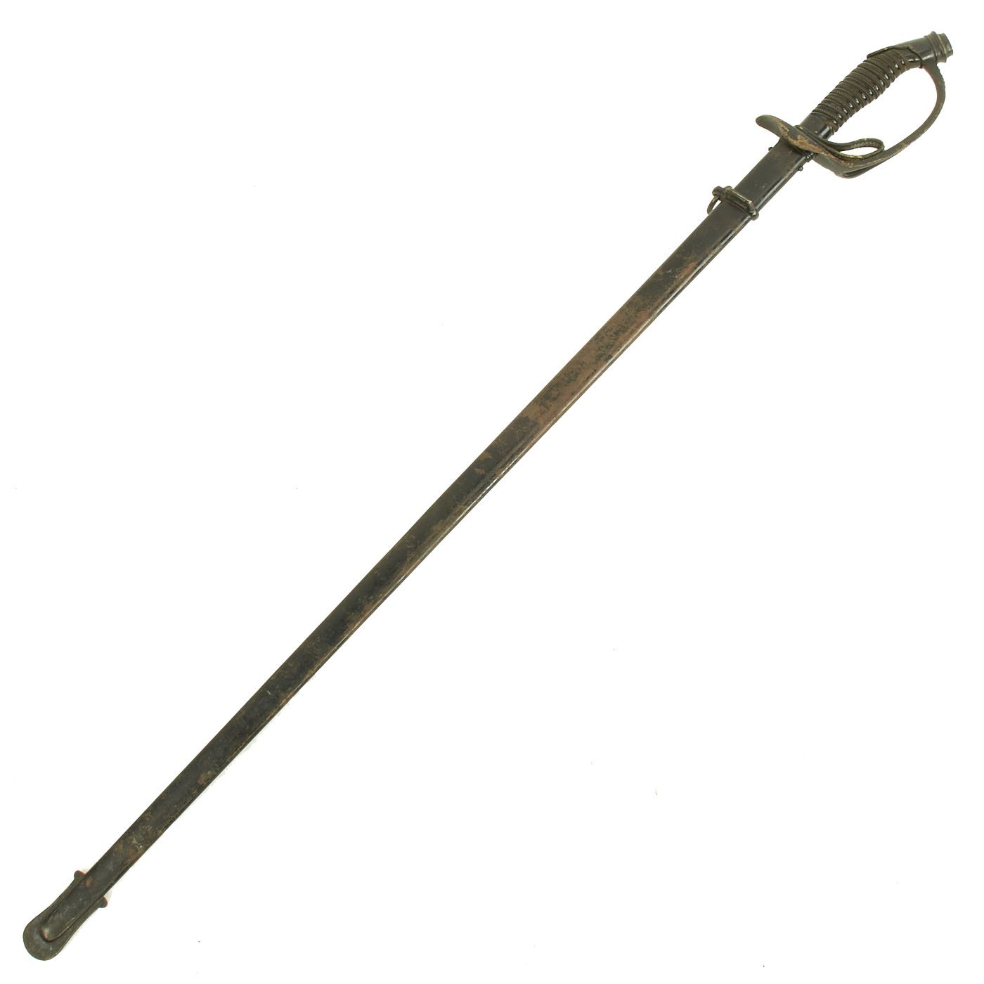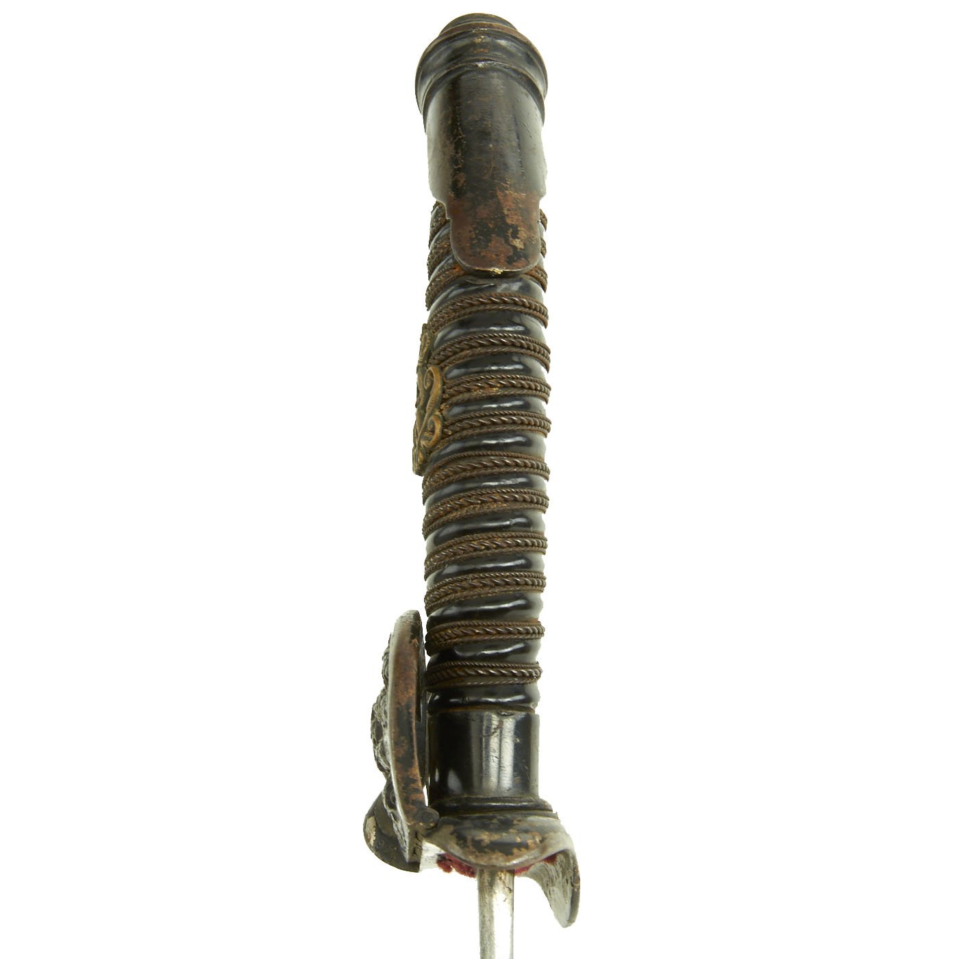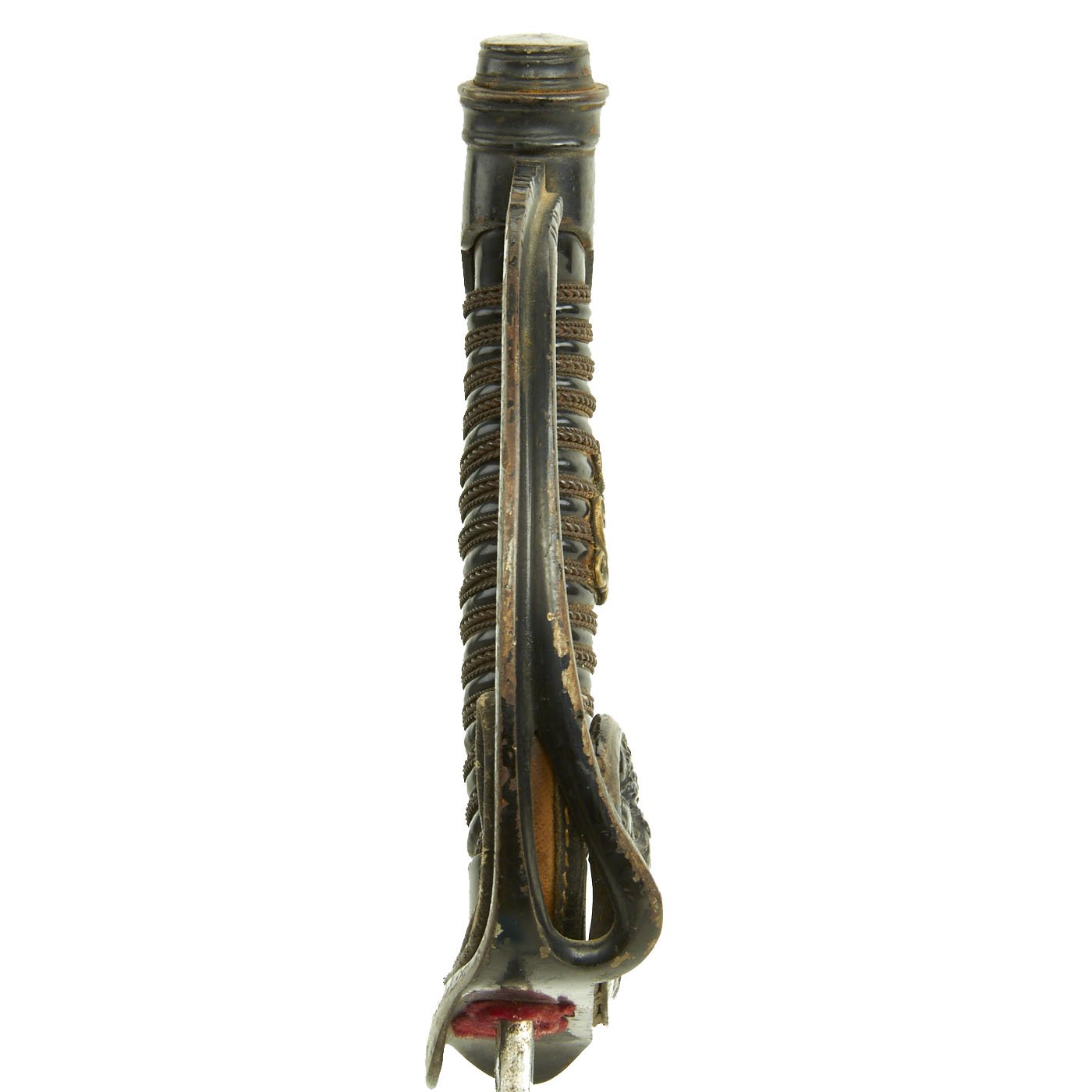 Original Item: Only One Available. This is a very nice WWI Imperial German Model 1889 Infantry Officer sword and scabbard, made by Pack, Ohliger & Co. GmbH of Solingen, offered in good condition. The D shape fold-away guard with the Imperial German eagle of Kaiser Wilhelm II has a black finish to it. The grip is brass wire bound over a celluloid base, with a brass cypher of the Kaiser in the center. The celluloid is in excellent shape. This model of sword has a leather forefinger loop on the inside of the guard, and has good stitching and condition of the leather.