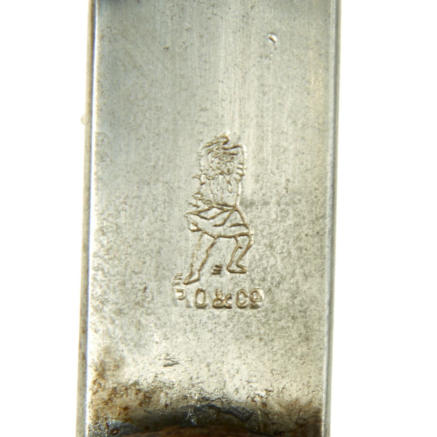 The sword ricasso is stamped with the trademark "Young Siegfried Wielding a Hammer" logo over P. O & Co., the markings used by Pack, Ohliger & Co. GmbH, Waffen - und Stahlwarenfabrik of Solingen, the legendary "City of Blades" in western Germany. This company was founded in 1910 by Friedrich Pack and Robert Ohliger and manufactured weapons and Steelware during the WWI Period. The company ceased to exist in 1922 when Ohliger left, and the company was taken over by Pack's son Ernst and his sons, forming Ernst Pack & Sohne, who continued to use the same "Young Siegfried" logo. This puts the sword FIRMLY in the WWI period. For more information please see J. Anthony Carter's find work GERMAN SWORD AND KNIFE MAKERS.