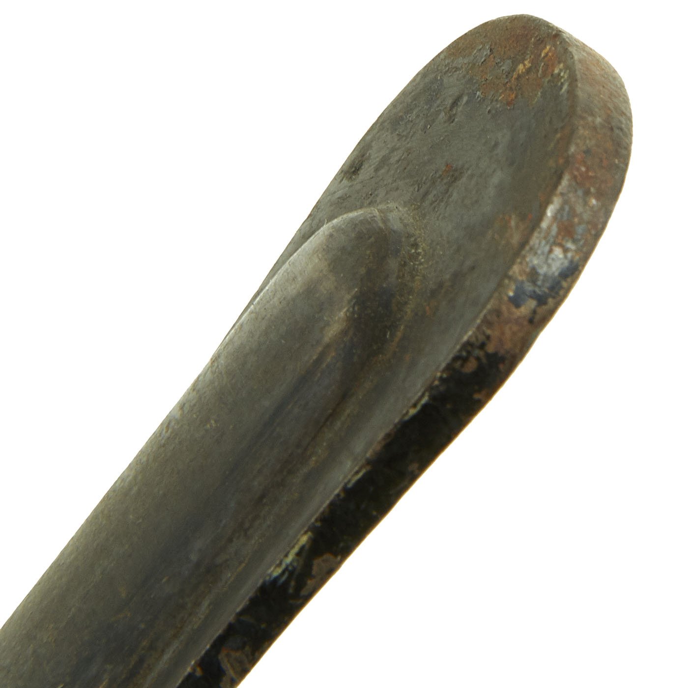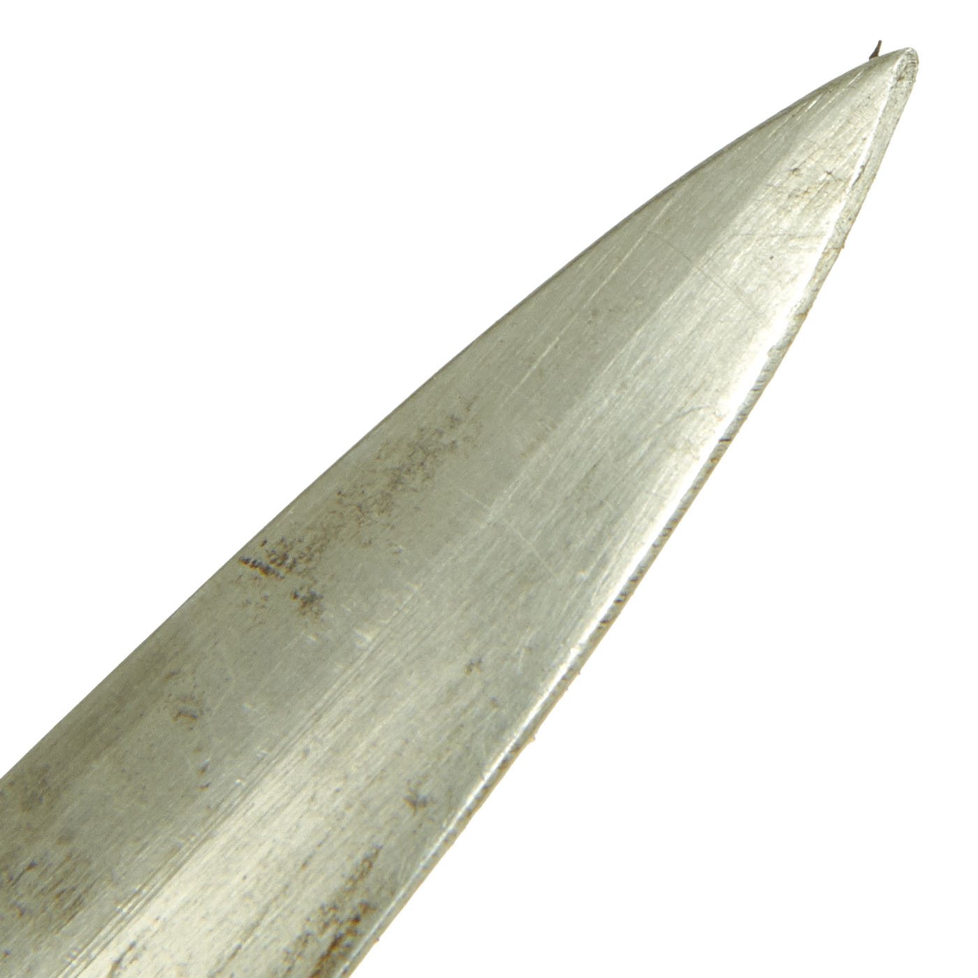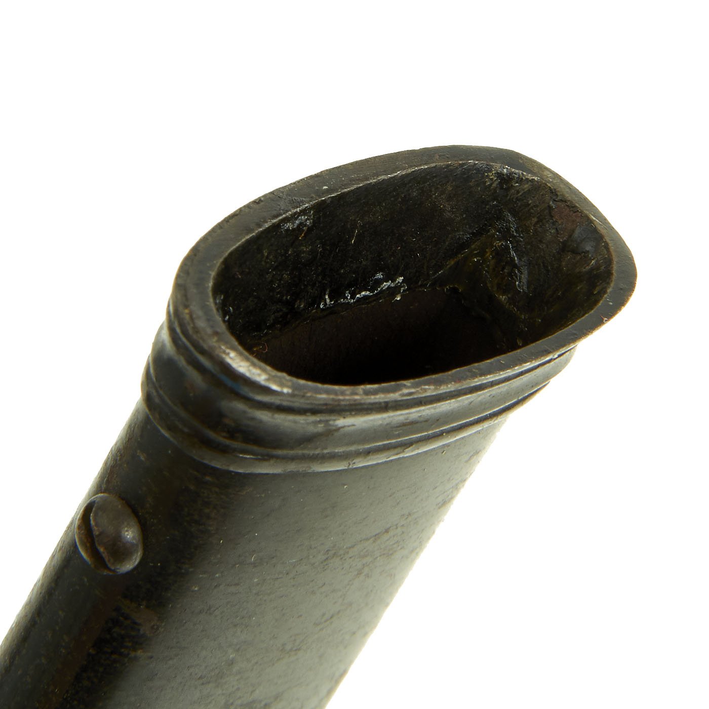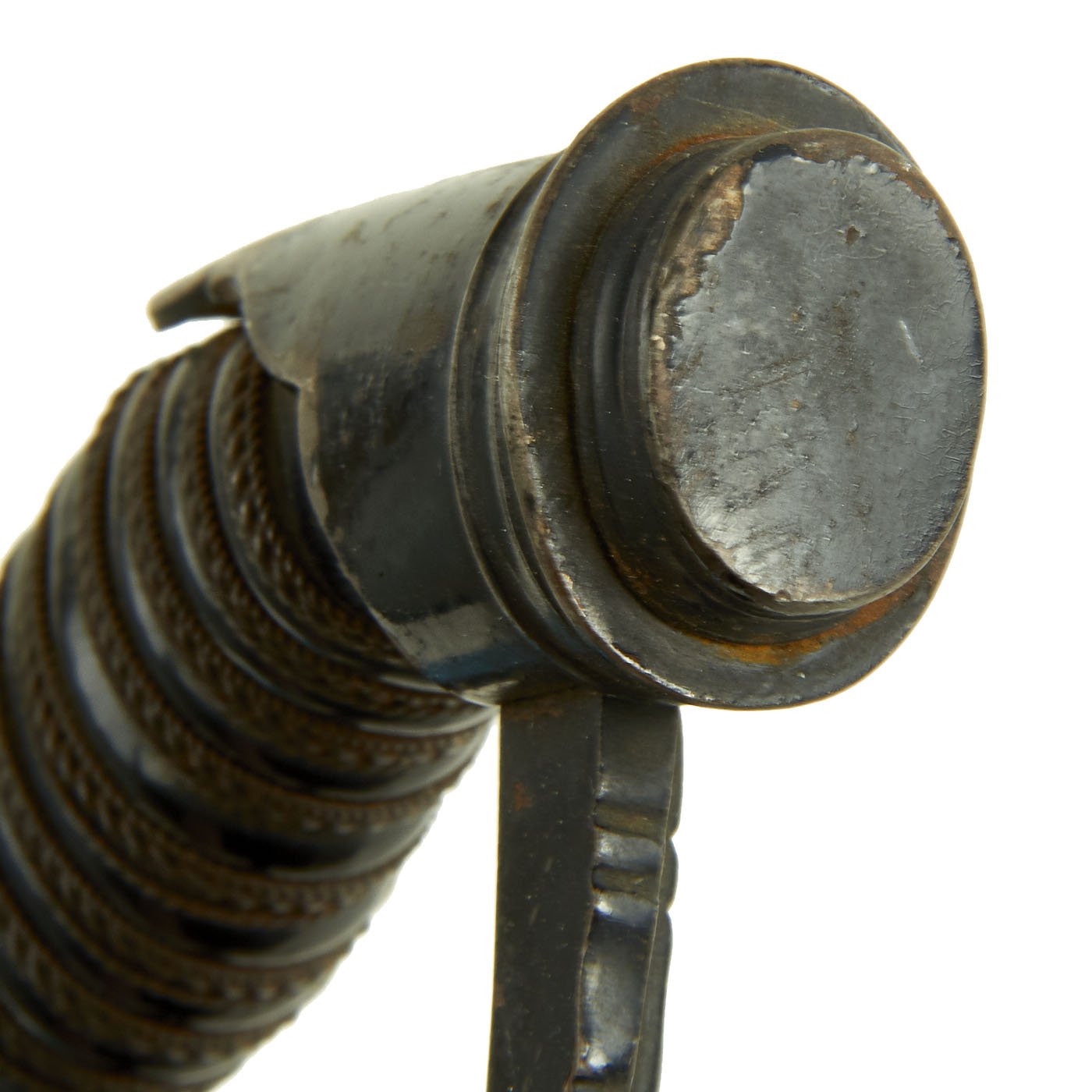 The steel scabbard has a single hanging ring, as the second fitting was for a hook on the hanger. It has the standard black enamel finish, which has worn off in some areas in the middle, and the underlying steel has oxidized. The scabbard is mostly straight, though it does have two dents on one side in the middle which do not interfere with placing the blade in the scabbard. The blade does move slightly in the scabbard
