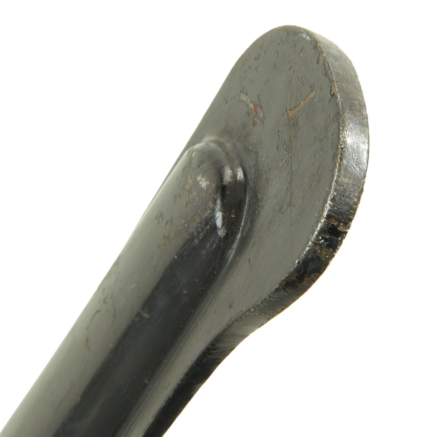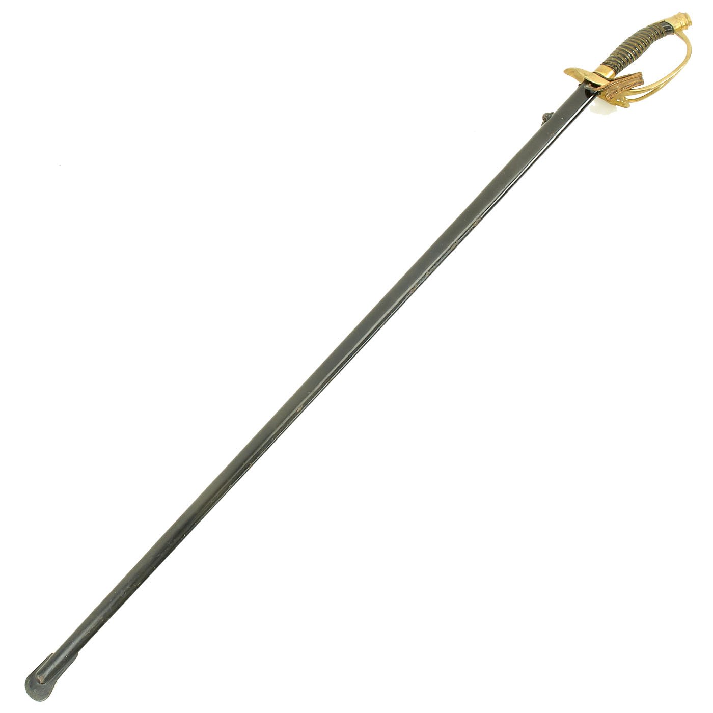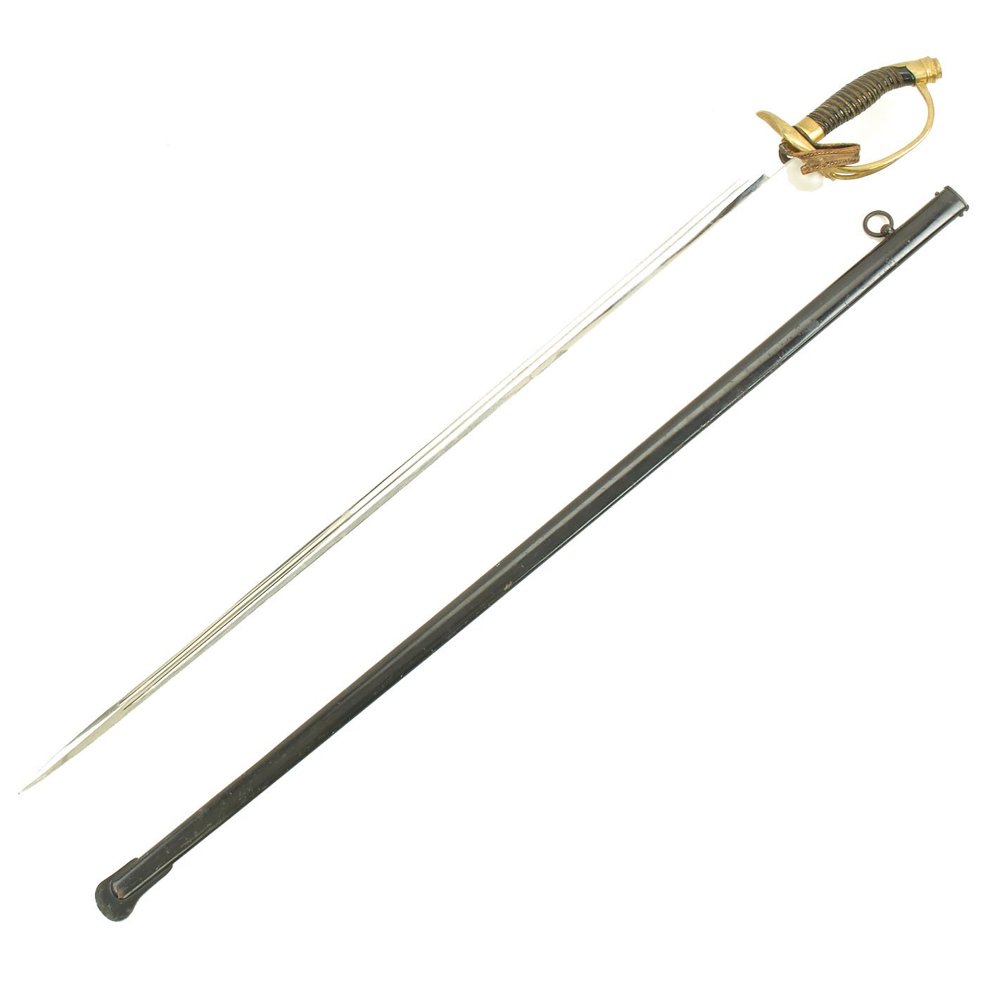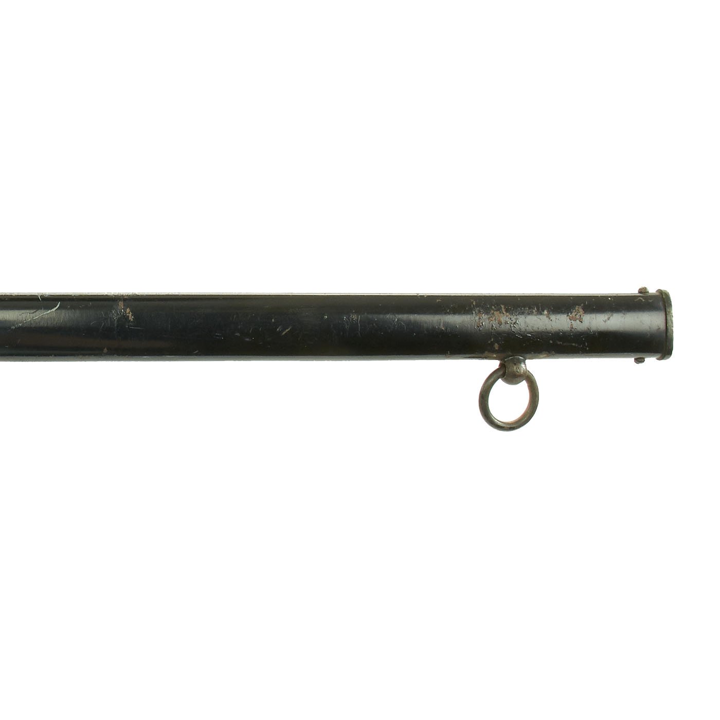 The steel scabbard has a single hanging ring, as was standard. It has a very nice black enamel finish, which has flaked off in some areas, and the underlying steel has oxidized. The scabbard body is fully straight, with no dents we can see or feel.