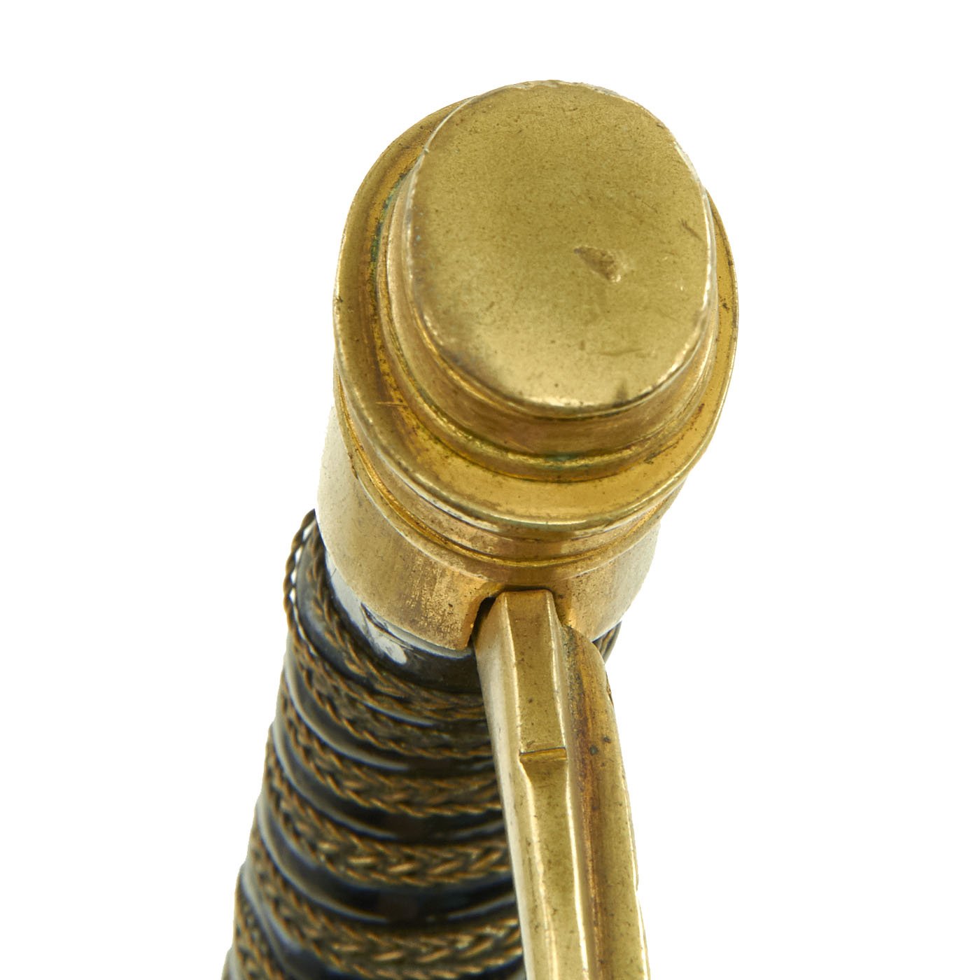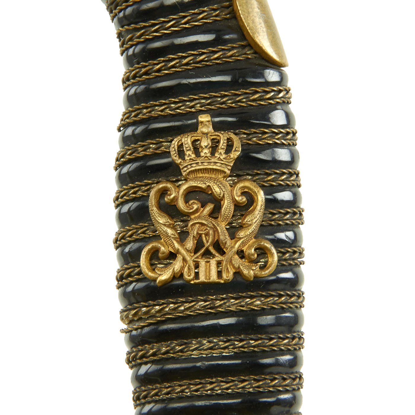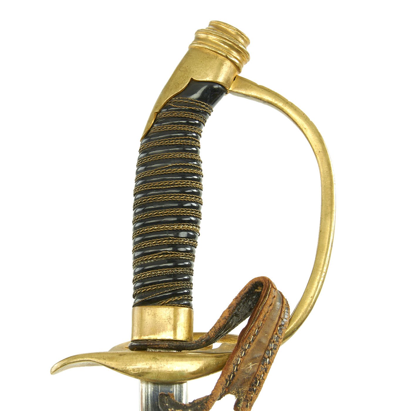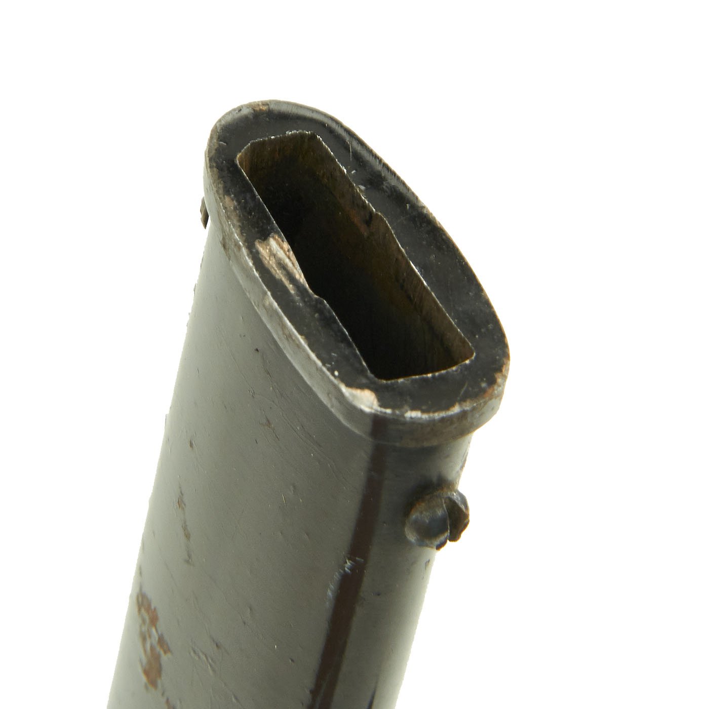 The steel scabbard has a single hanging ring, as was standard. It has a very nice black enamel finish, which has flaked off in some areas, and the underlying steel has oxidized. The scabbard body is fully straight, with no dents we can see or feel.