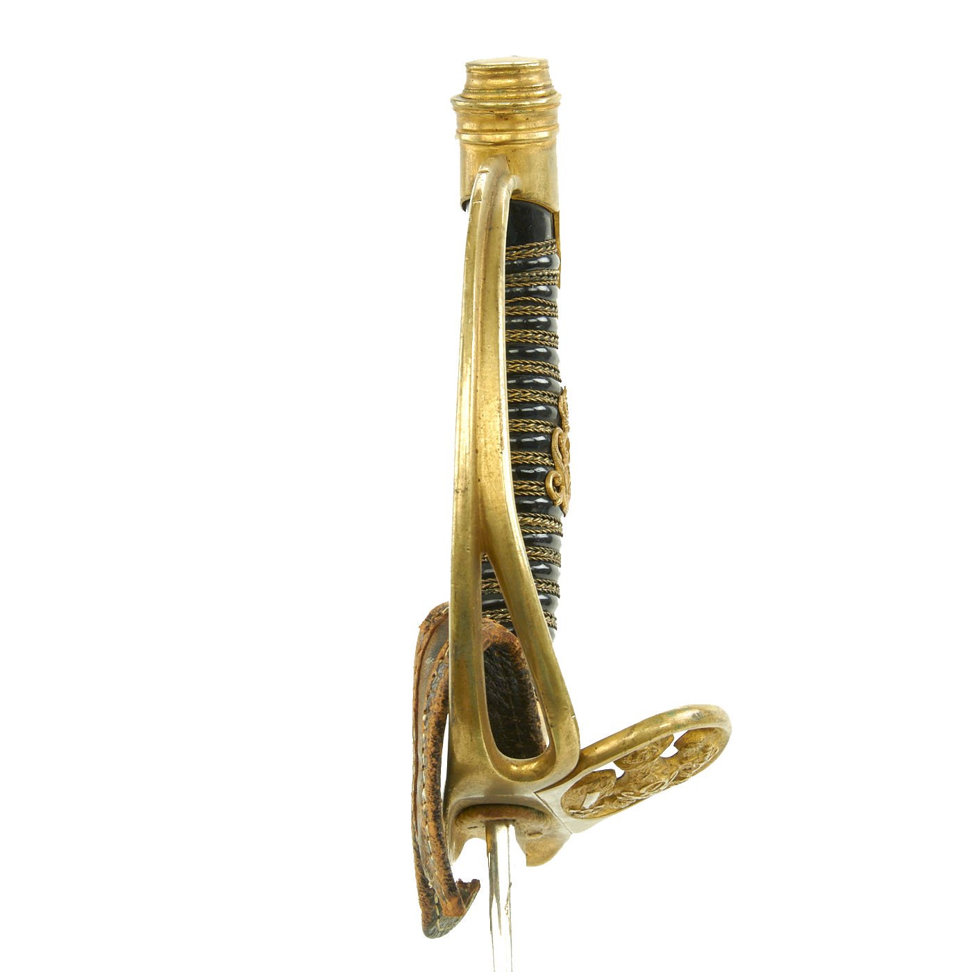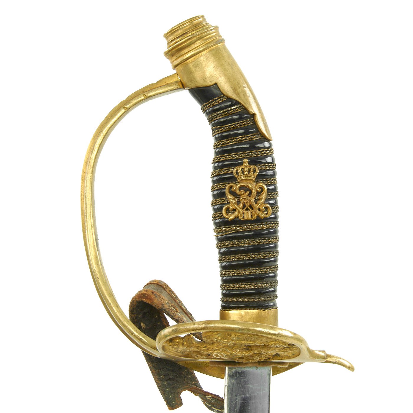 Original Item: Only One Available. This is a wonderful condition Imperial German Model 1889 Infantry Officer sword and scabbard, with a very nice nickel plated blade. The hilt is a gilded brass D shape fold away guard with the Imperial German eagle of Kaiser Wilhelm II. The grip is triple twisted brass wire bound over black celluloid, with a brass cypher of the Kaiser in the center. The grip is in very good condition, and still tight to the tang. This example also still retains the leather "finger loop" directly under the cross guard, though it has partially torn away on one end.