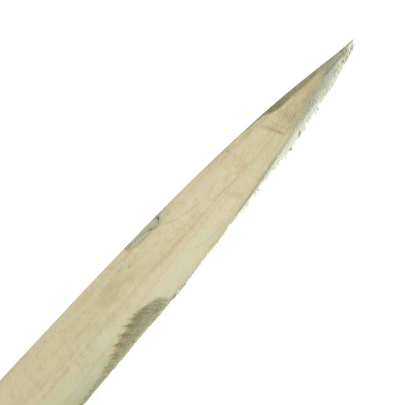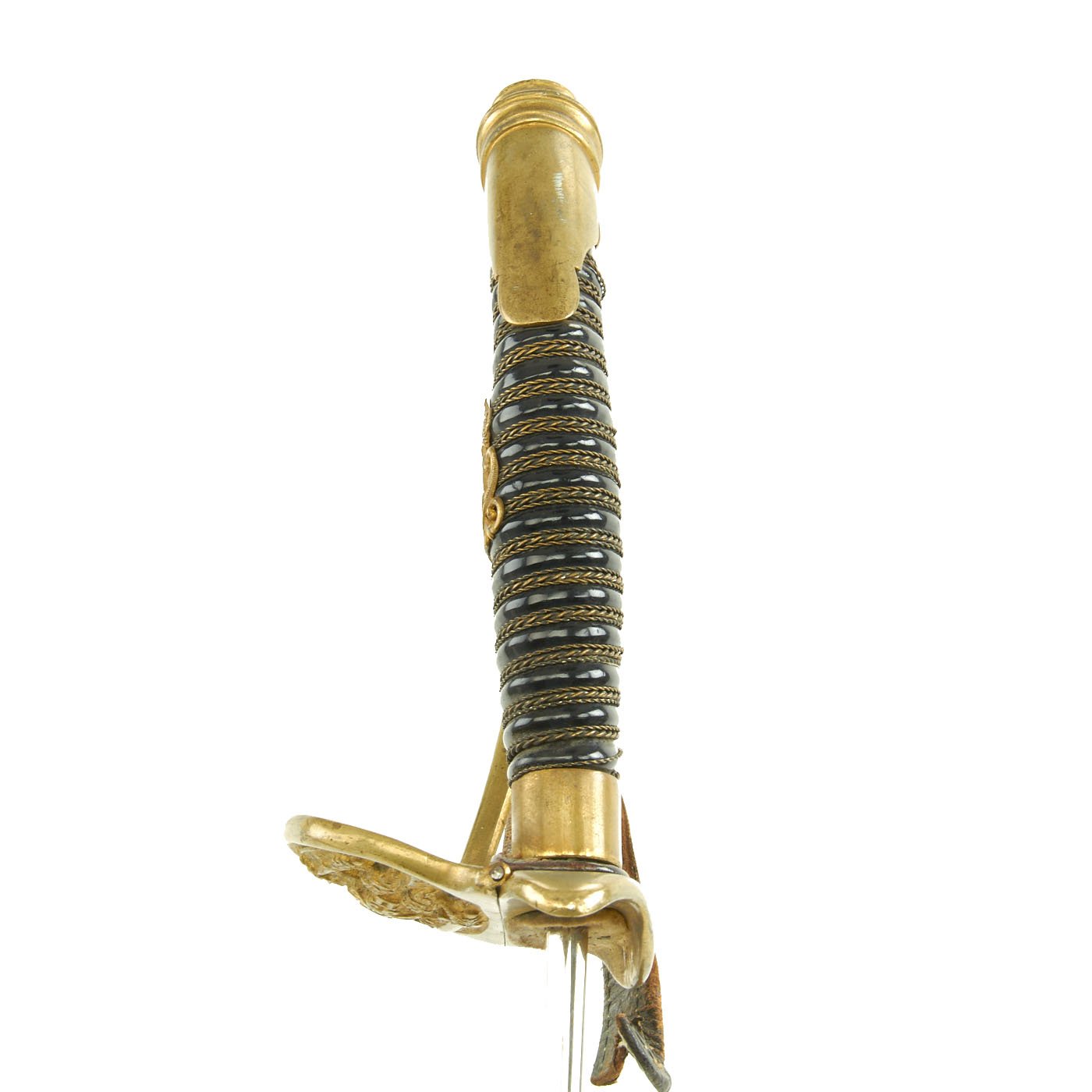 The nickel plated straight blade is in very good condition and has a double fuller on each side and is 32 inches from the spear point to the hilt. The nickel plate is retained very well, however unfortunately some person, not understanding that this is a dress blade, decided to sharpen the edge, which is a shame. These were never intended for actual use. Overall length of the sword is 38 inches. A white buff felt washer is fitted to the blade where it meets the guard, now somewhat stained. There is no maker marking on the blade ricasso, but this was not uncommon, as often unmarked raw blades were purchased by retailers, and then custom fit for the purchaser.