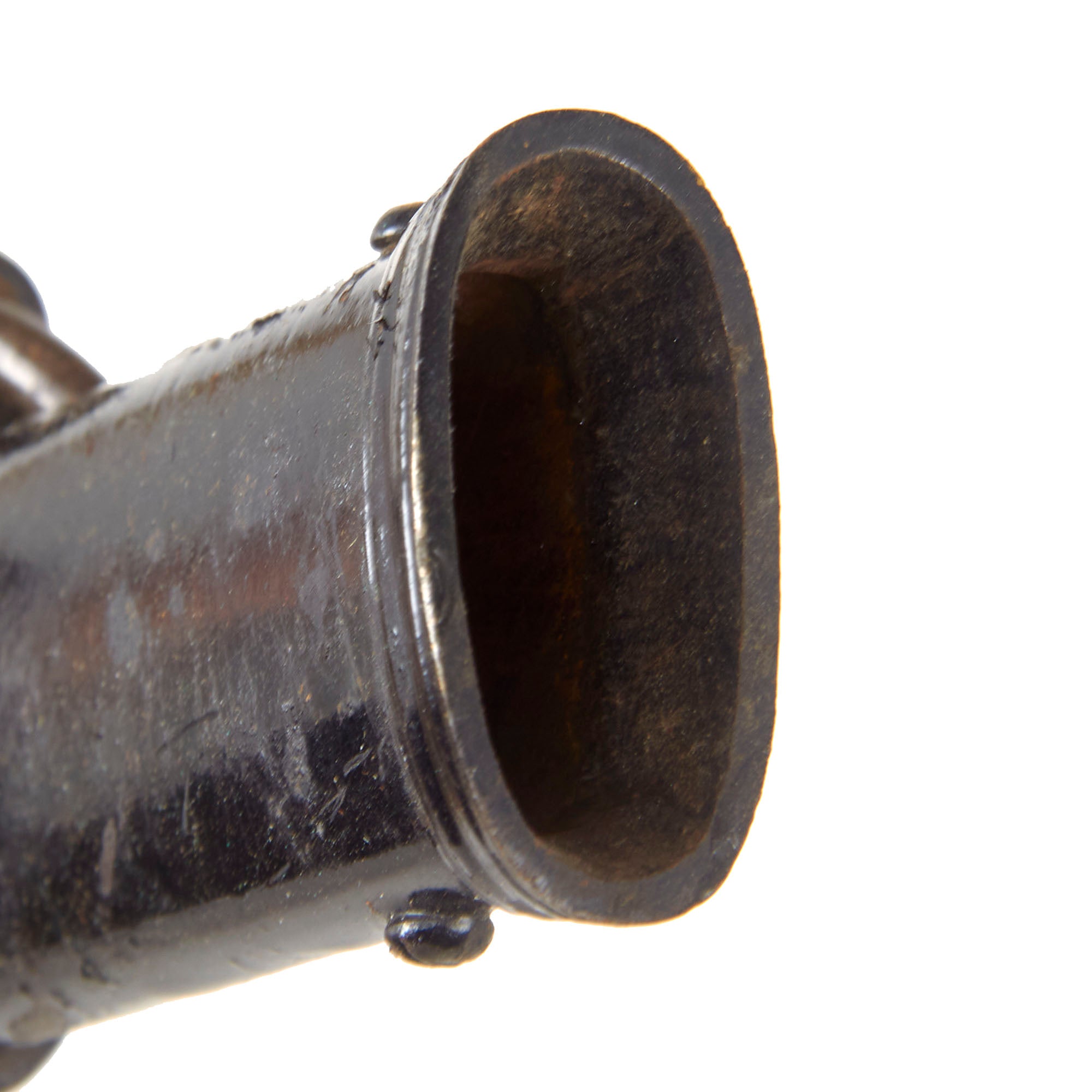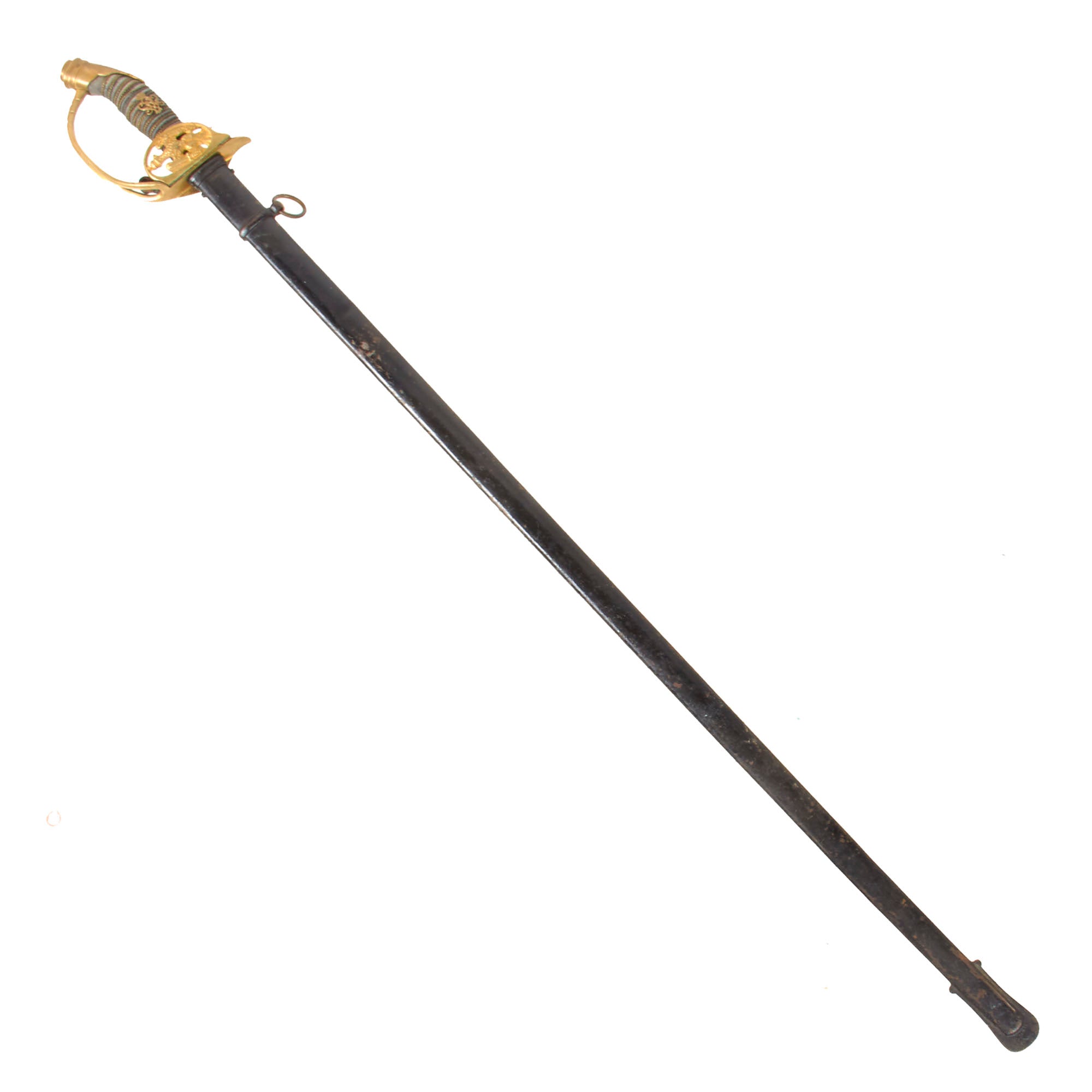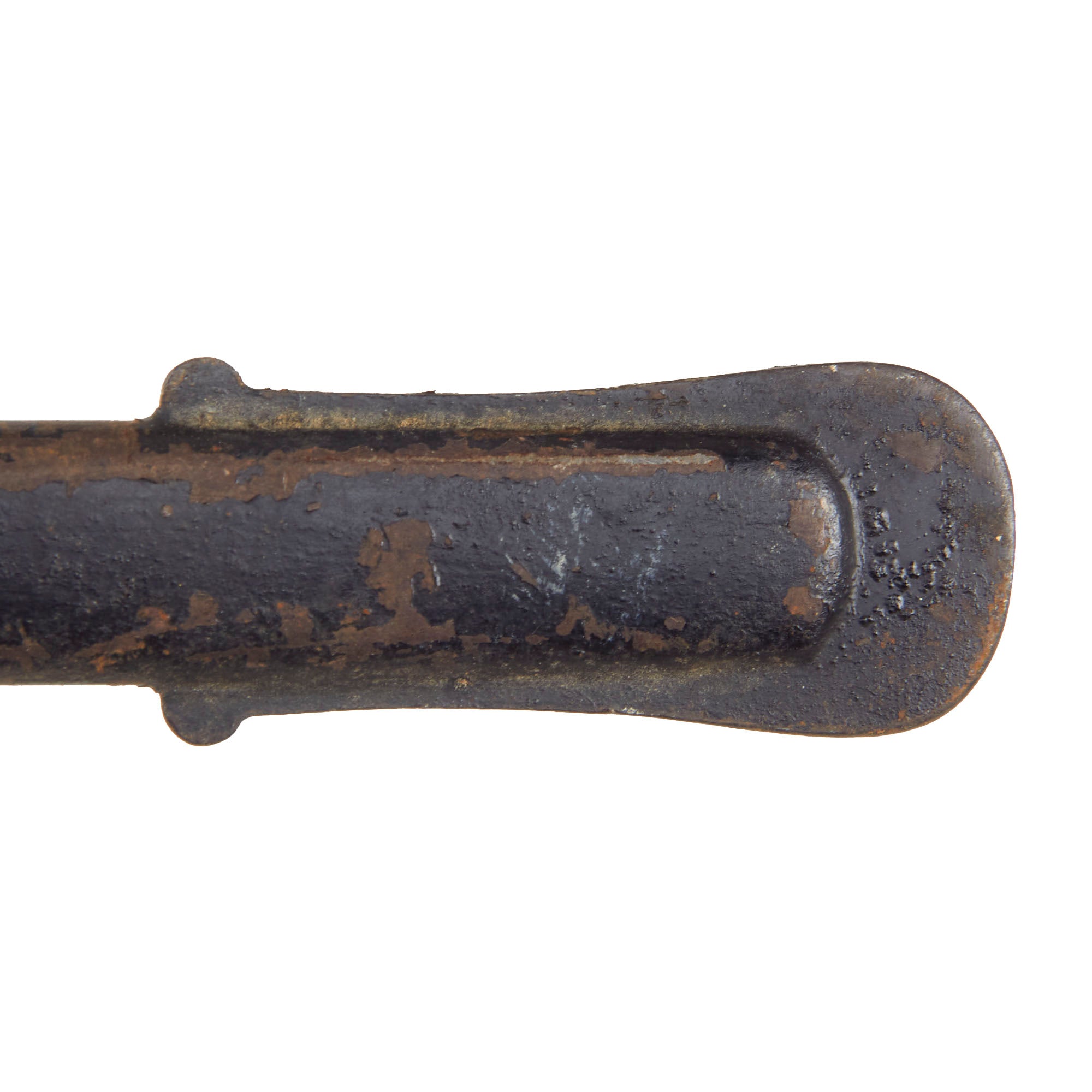 The steel scabbard has a single hanging ring, as the second fitting was for a hook on the hanger. It has the standard black enamel finish, which has worn off in some areas, and the underlying steel has oxidized. The scabbard has some moderate denting but nothing that hinders sheathing.