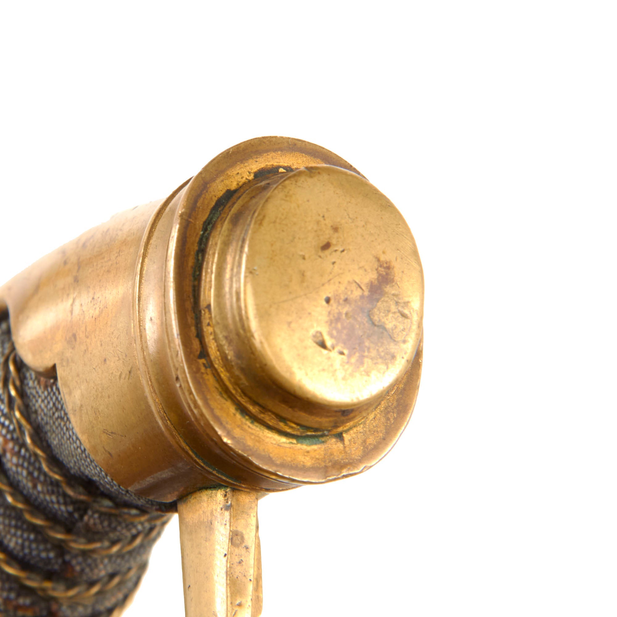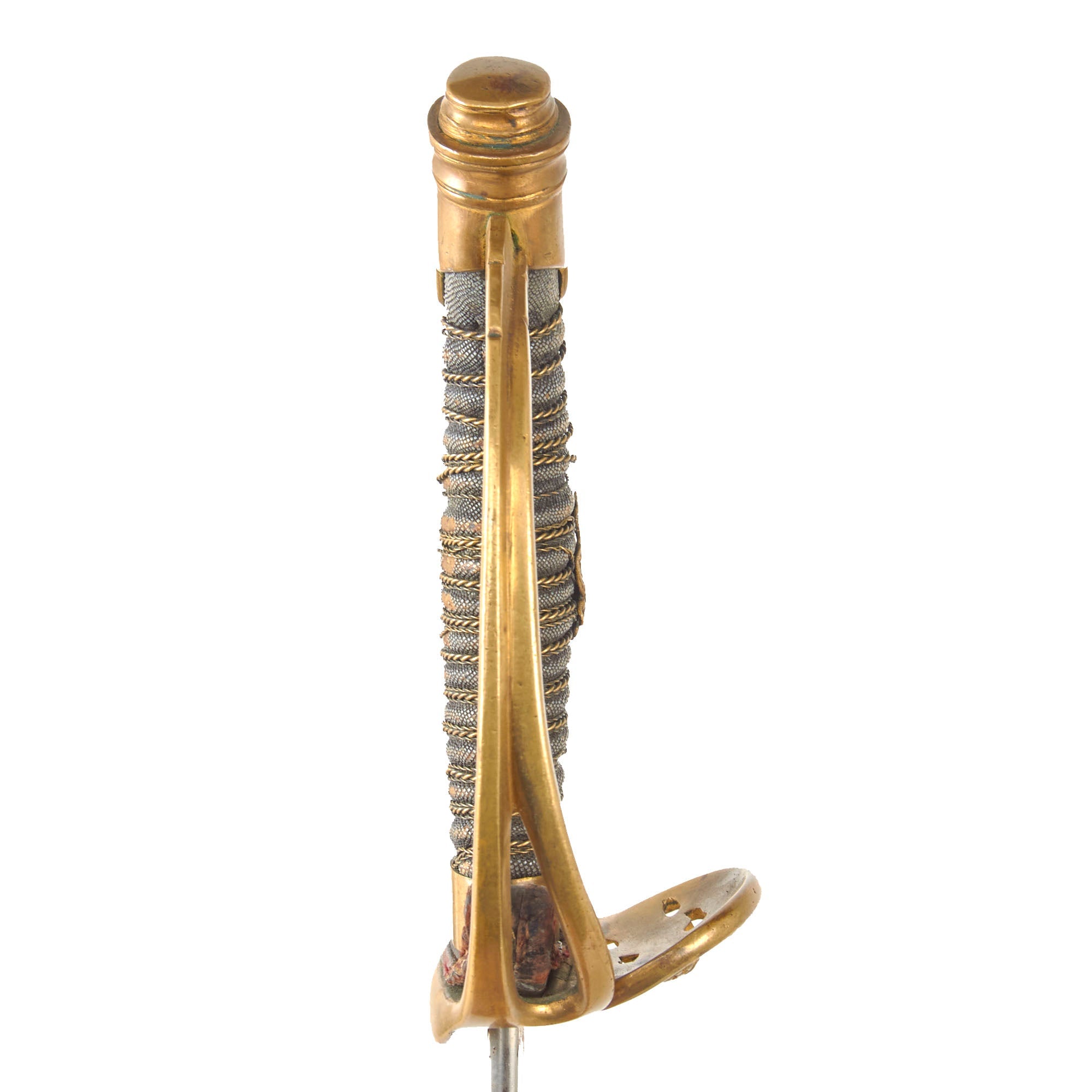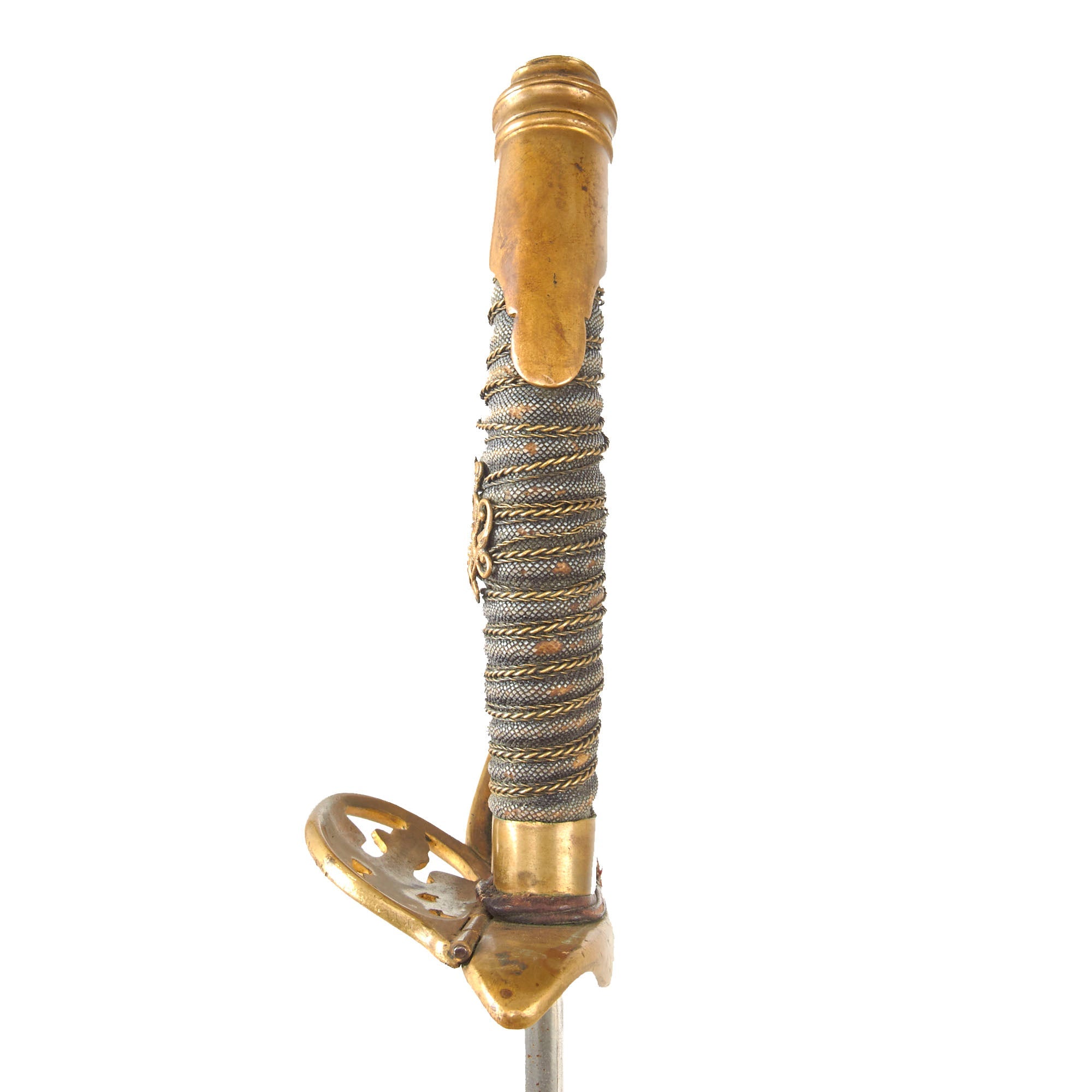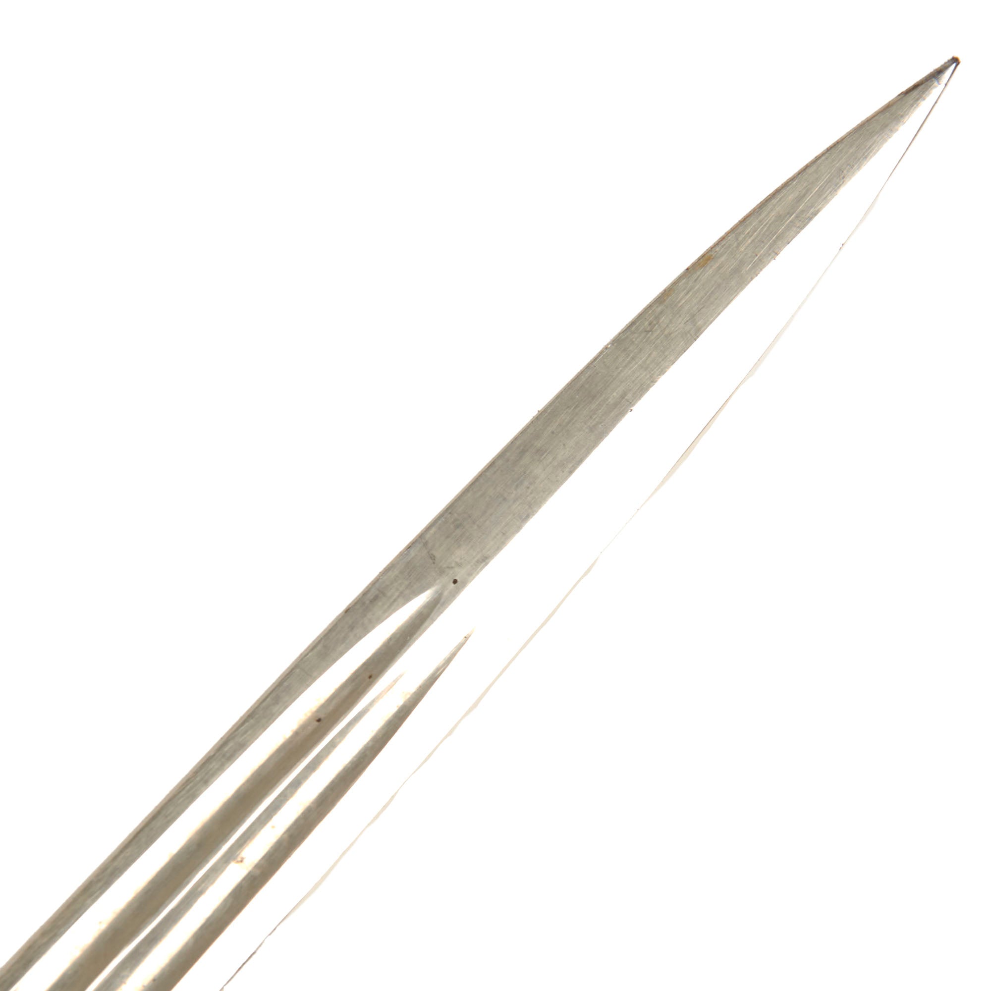 The nickel plated straight blade is in very good condition and has a double fuller on each side and is 34⅛” from the spear point to the hilt. The nickel plate is retained very well. Overall length of the sword is 40⅛”.