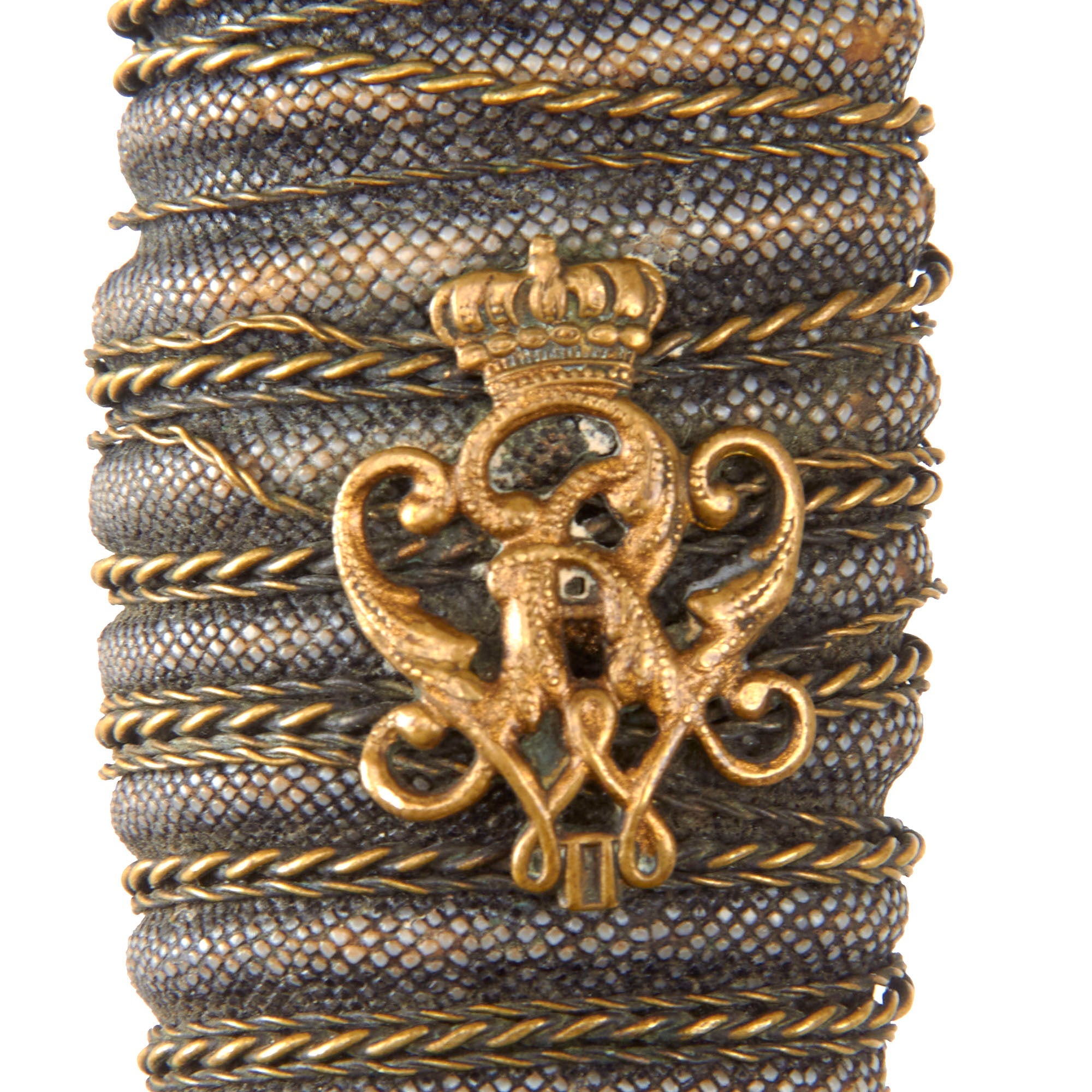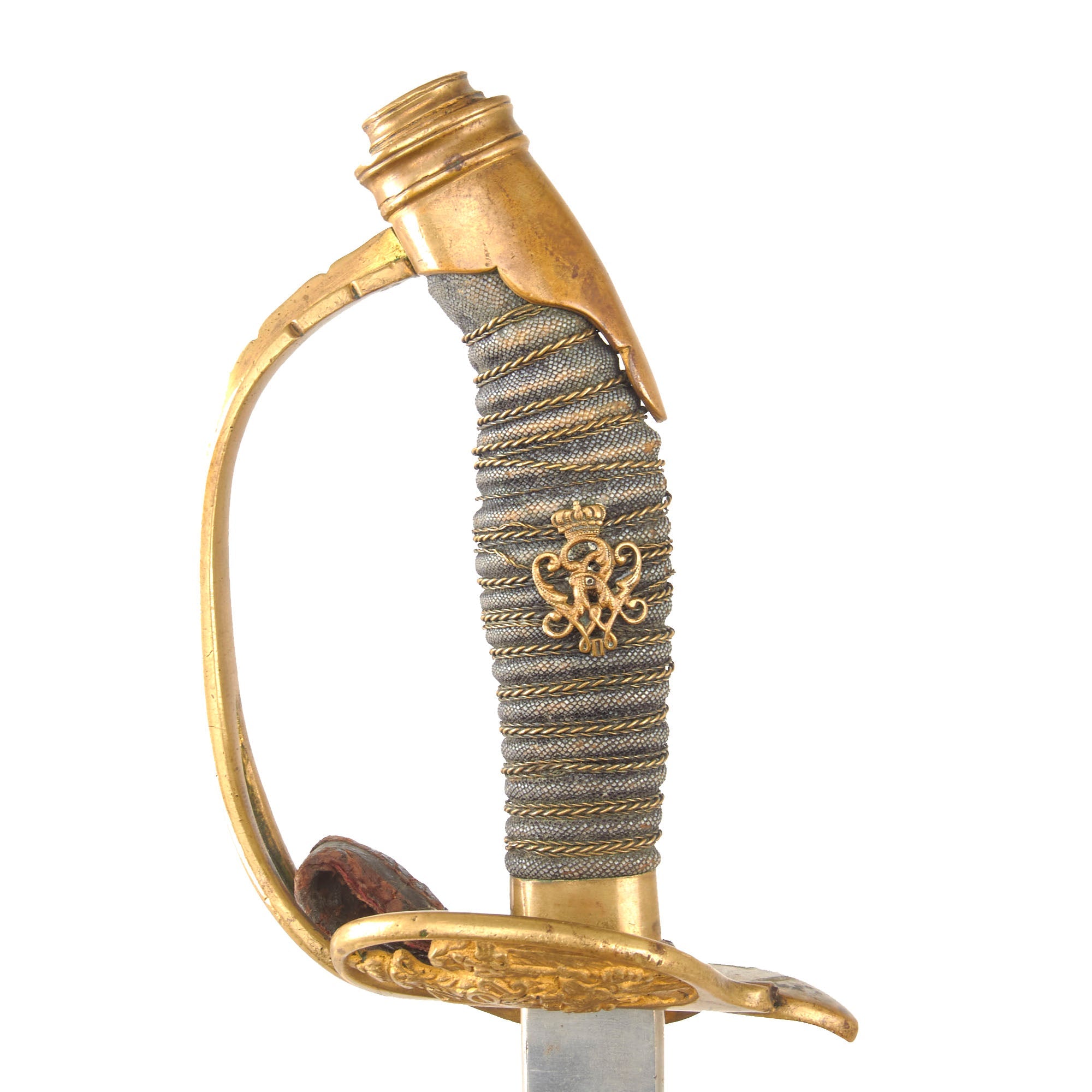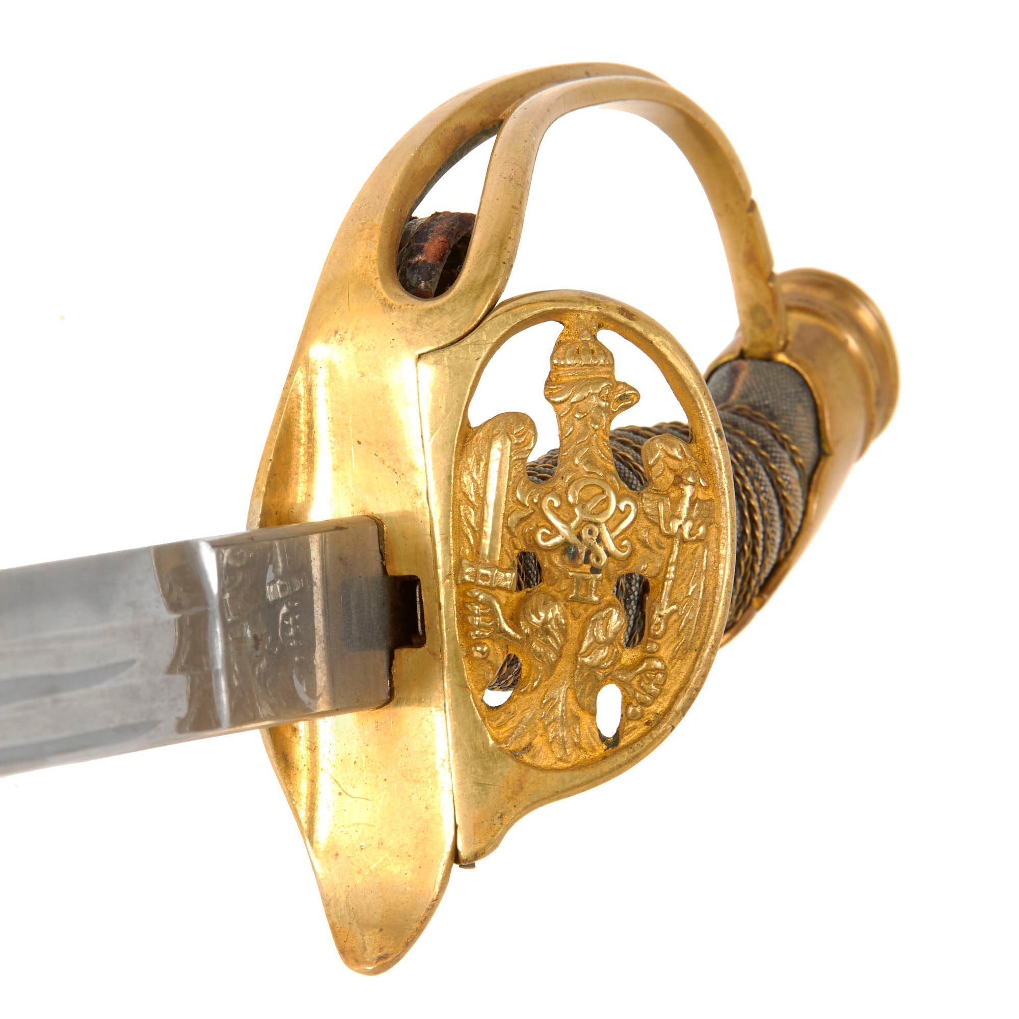 Original Item: Only One Available. This is a great condition Imperial German Model 1889 Infantry Officer sword and scabbard, by the legendary Solingen-based firm of Carl Eickhorn. The hilt is a gilded brass D shape fold away guard with the Imperial German eagle of Kaiser Wilhelm II. The grip is brass wire bound over sharkskin with a brass cypher of the Kaiser in the center. The wire has come a bit loose however. This model of sword would often have a leather fore finger loop on the inside of the guard, and this example still retains that loop!