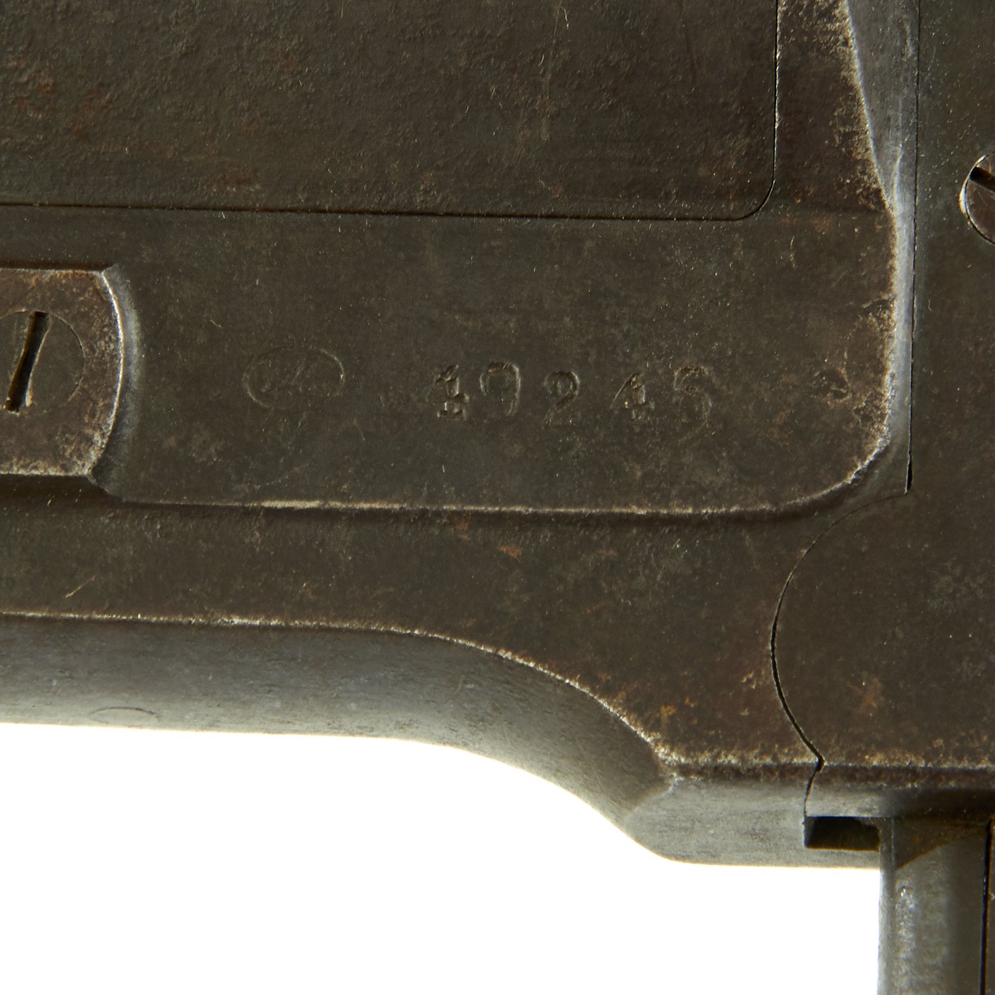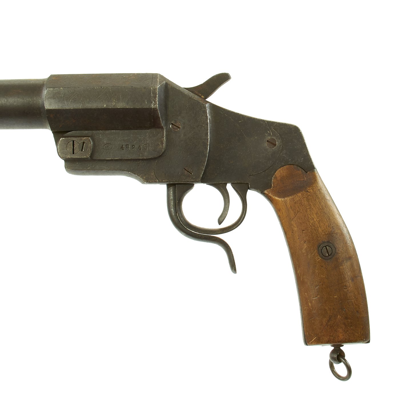 Original Item: Only One Available. Very good condition WWI Imperial German Model 1894 Hebel flare pistol in the standard 26.5mm caliber with a 9 inch barrel. Left side of frame is maker marked with "M" in an oval, a mark that we have not been able to identify. Next to this is serial number 49246. and the bottom of the barrel is marked 9246, so it has not been swapped out. There are also several small proof marks on the right side of the frame and barrel, including the German Imperial Eagle, and Crown over B for Beschuss = proof load fired. It is also marked with a 4 in a circle (4-Bore) for the flare size.