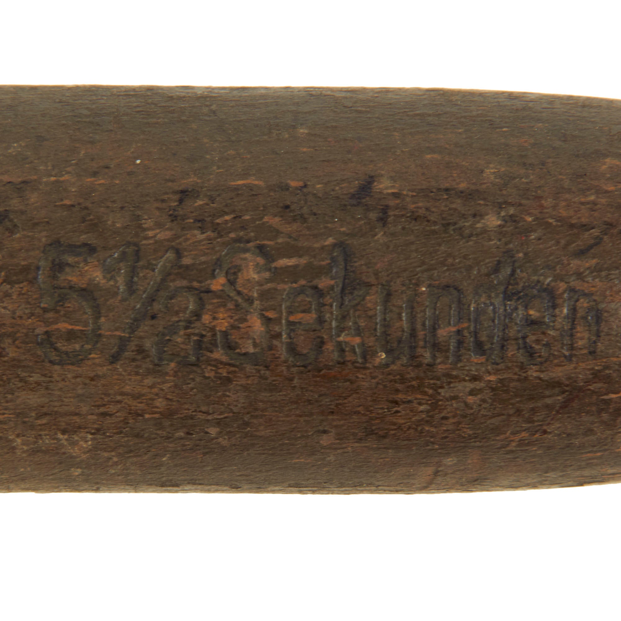 One side of the stick is very faintly marked 5 1/2 Sekunde, indicating that the fuse is a 5 1/2 Second delay. The other side of the handle is very faintly marked Üb. Sthdgr. Bz,