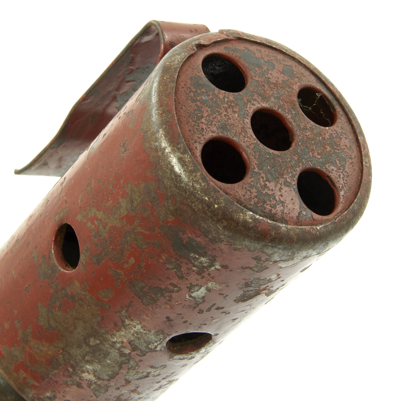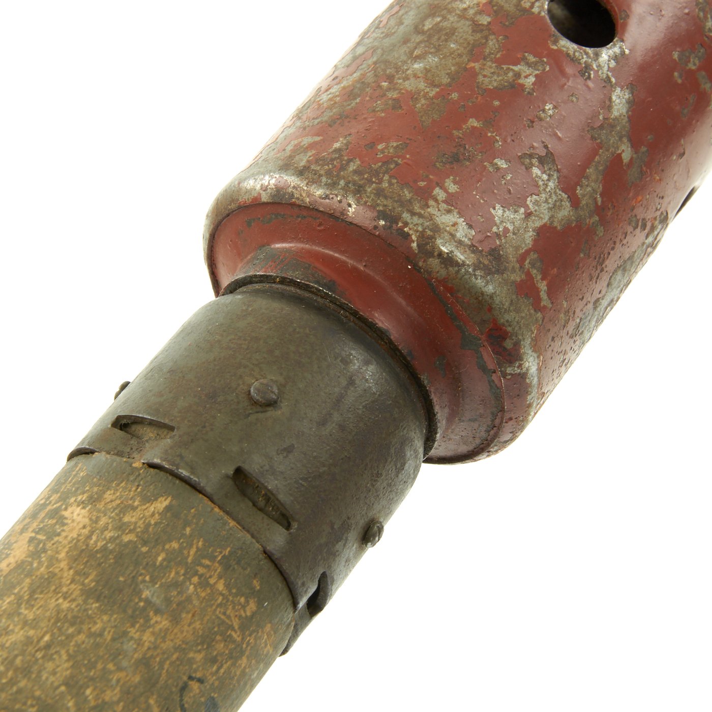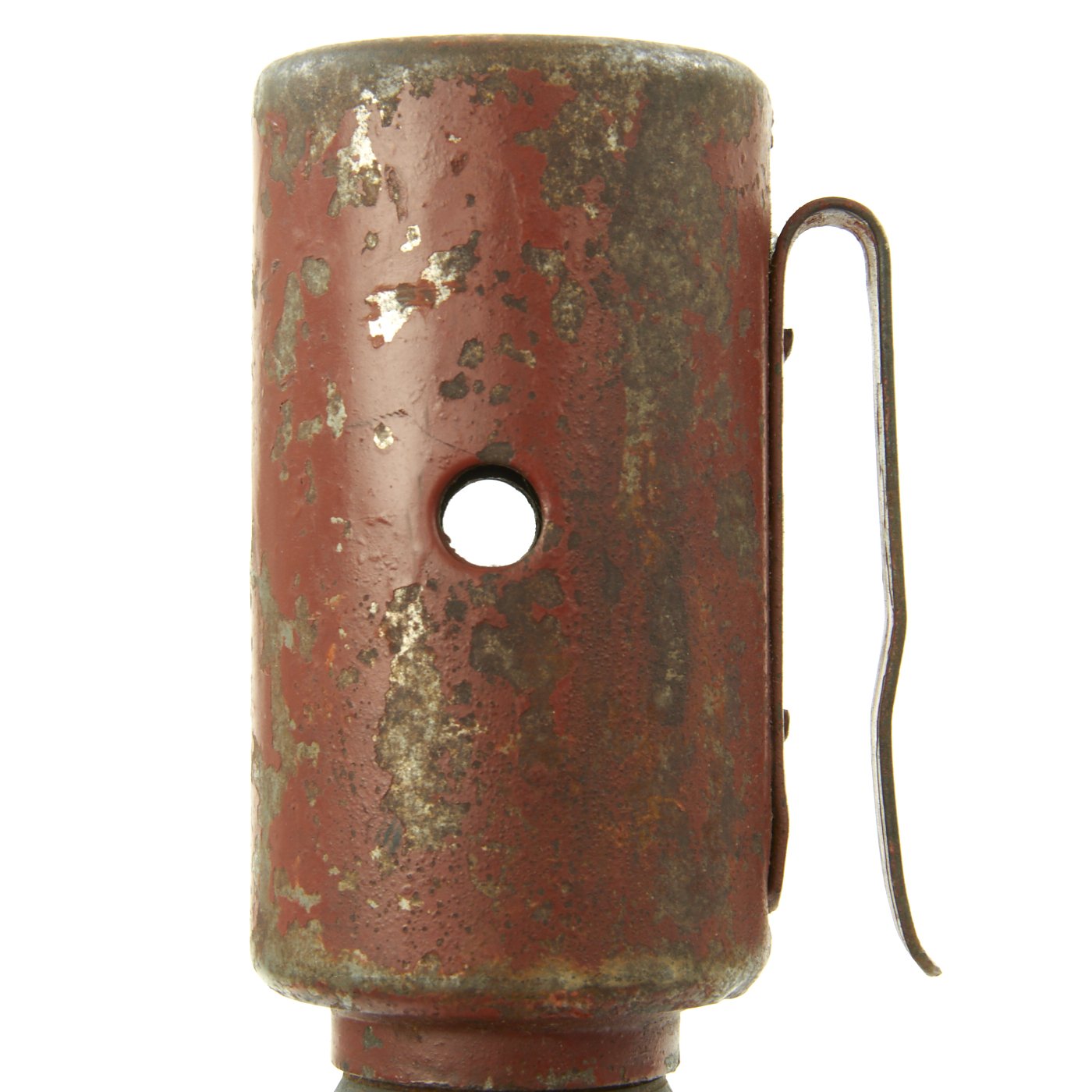 This very nice example was recently acquired from a large ordnance collection in the U.S.. The bottom cap unscrews to reveal the original cavity, though original porcelain bead and pull string are unfortunately missing. It still retains a large amount of the original red paint on the inert vented warhead, even on the belt loop and top. These dummy grenades had a small charge inside that would indicate "detonation" after being thrown, and were vented so this could be heard (and so they could be reused). The head is also made from thick steel, to simulate the weight of a real grenade.