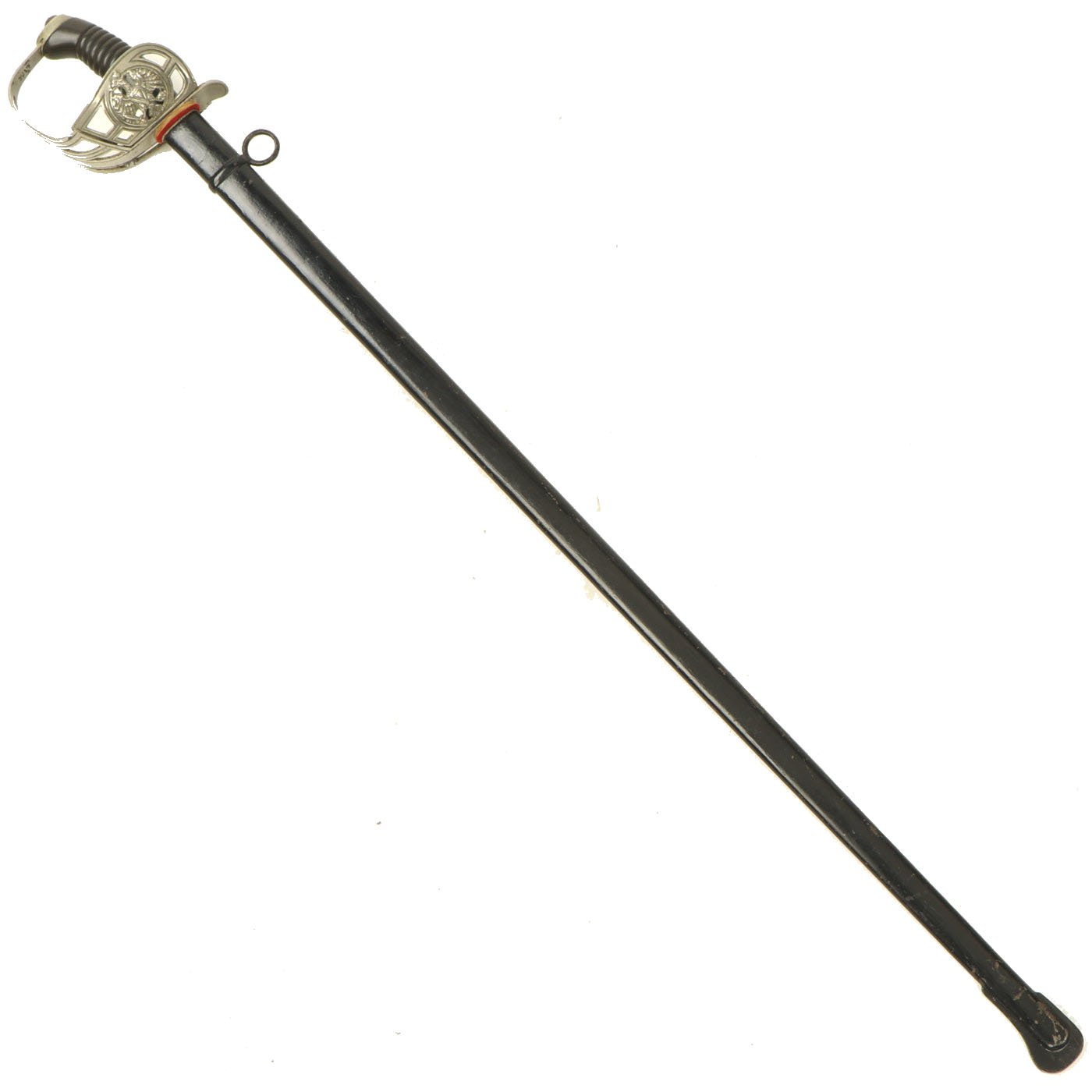The black enamel painted scabbard is standard issue for this sword type, and does look to have been repainted at least once. It does not show any major damage however, and still has the throat intact. It still has the hanger ring, as well as the rectangular hole where it could be hooked to the belt when in close quarters. This was a sword to wear to formal or parade occasions, and the owner very well couldn't have it hitting other people.