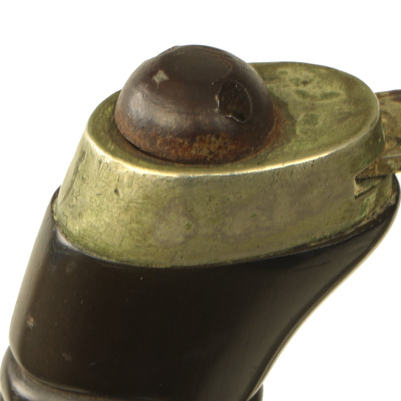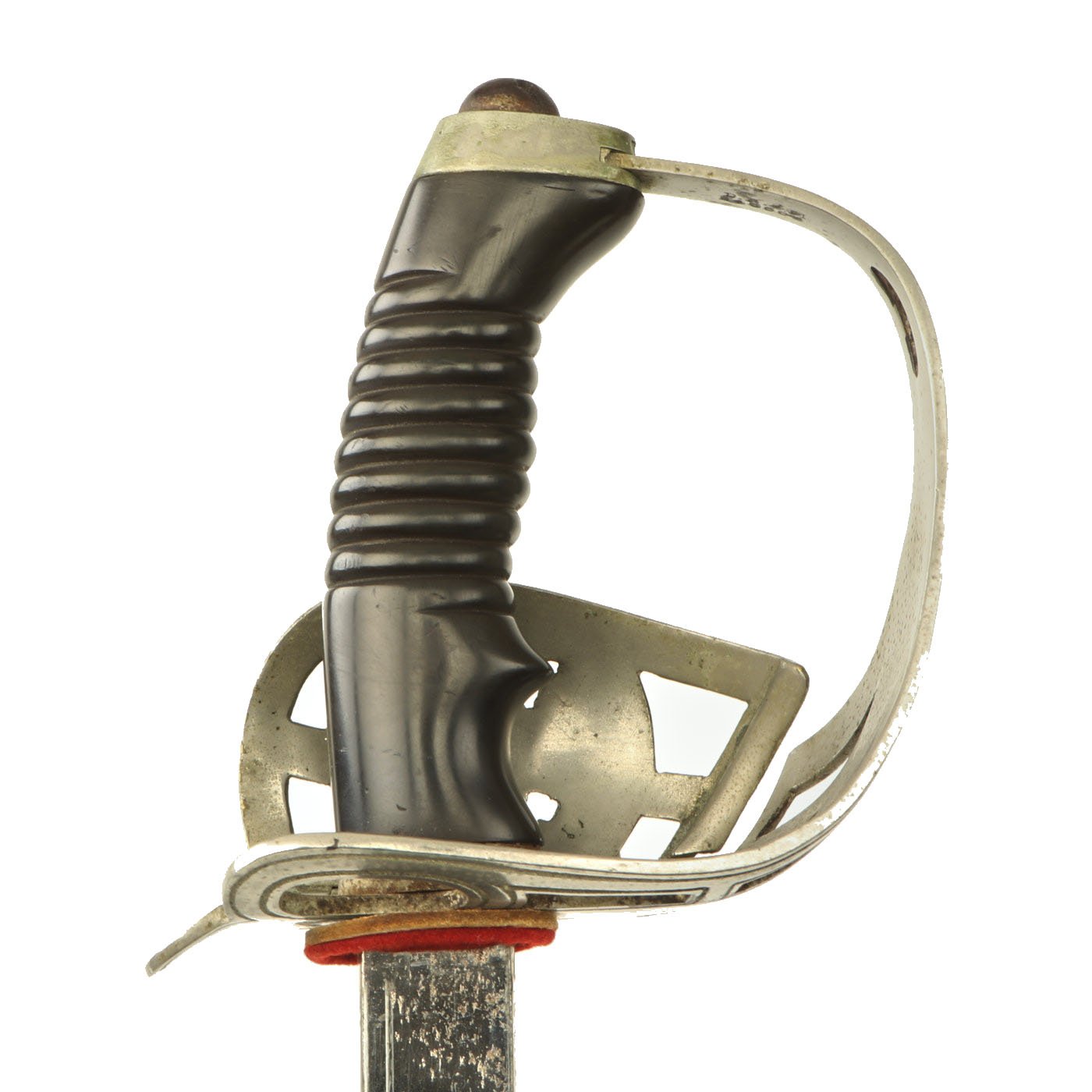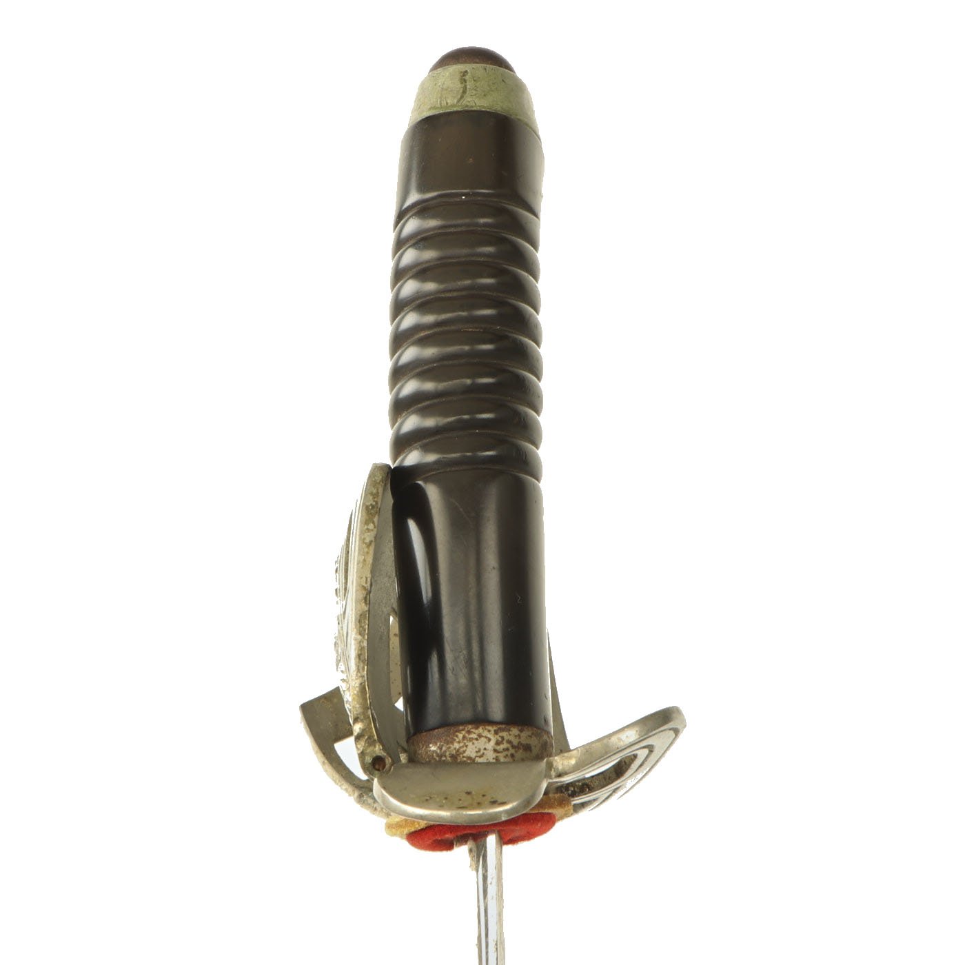 The guard is partly "fold-away", and that portion also bears the Prussian Eagle on it, with the shield of the House of Hohenzollern on the chest. The grip is molded bakelite or gutta percha, and is in very good shape, with little wear, and no cracks or chips. Both the leather and red felt blade buffers are still present, and in good shape.