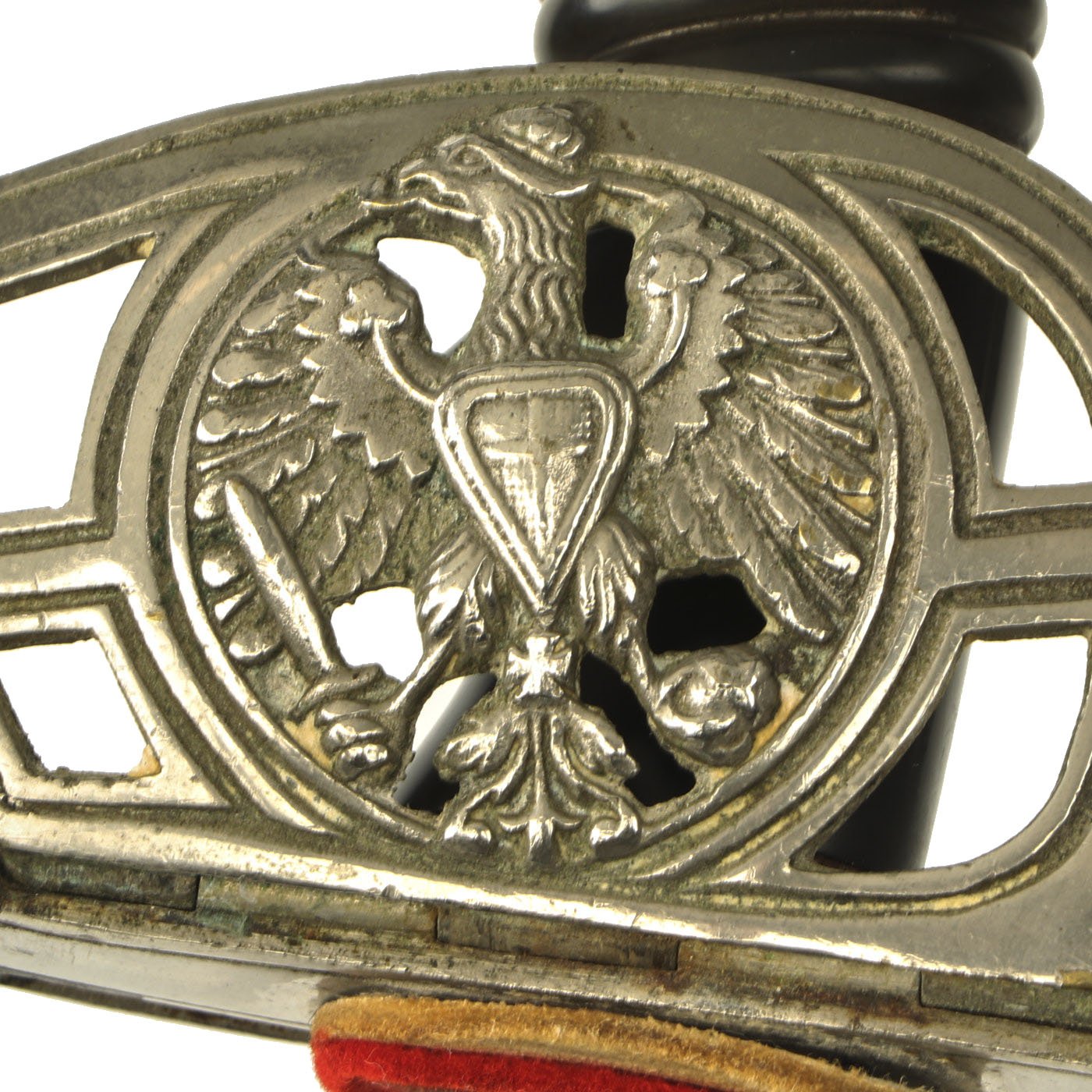 Original Item: Only One Available. This is a beautiful classic Nickel-Plated Imperial German WWI Presentation sword, named to a member of the Life Guard Hussars Regiment. It conforms to the Model 1889 standard quite well, with a straight thrusting blade, and a basket hilt guard. The presentation version is of course quite less robust than the cavalry issue, and these were privately purchased, so there is no acceptance marking on the spine.