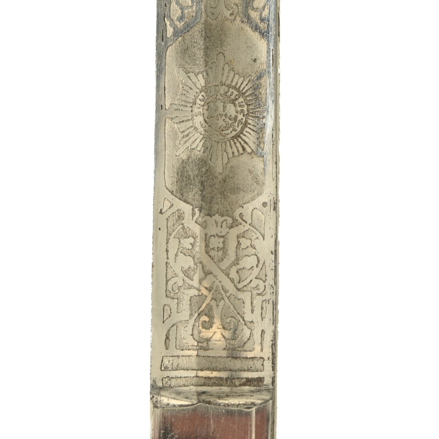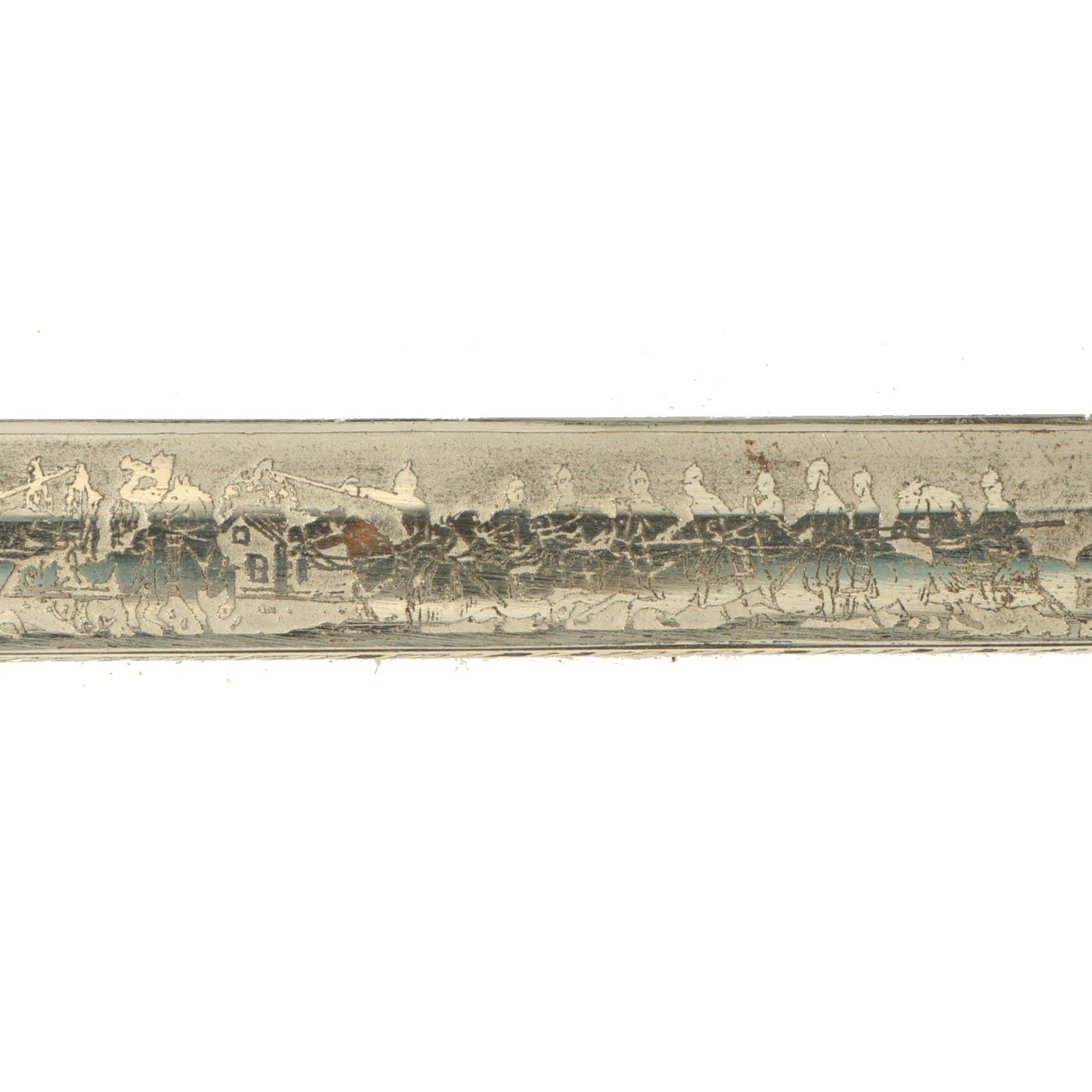 The 33 inch blade of this example is in excellent condition, with just a few scratches and areas of oxidation where the plating has flaked. It has an incredible triple-etched design, meaning it is on both sides as well as the spine of the blade. The designs have the typical borders and floral designs, but also lots of images of horses, as hussars are a type of cavalry. The left side has a large panel showing a cavalry engagement between two different mounted forces, possibly from the Franco-Prussian War. There is also the insignia of the Order of the Black Eagle, used by the Guard Regiments of the German Empire, with the motto SUUM CUIQUE ("may all get their due") visible.