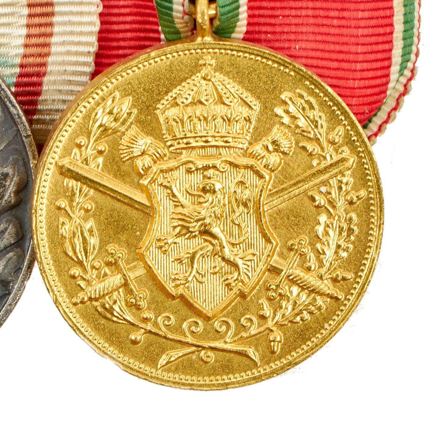 -Hungarian/Bulgarian European War Commemorative Medal: The Bulgarian European War Commemorative Medal was instituted in 1933, and was available to all WWI veterans including military personnel, non-combatants like medical personnel and civilian officials and next-of-kin. Allied veterans were eligible. The ribbon on this example indicates it was awarded to a combatant. Non-combatant ribbons were the same except with a white stripe down the middle, and next-of-kin medal ribbons had a black mourning stripe in the center.