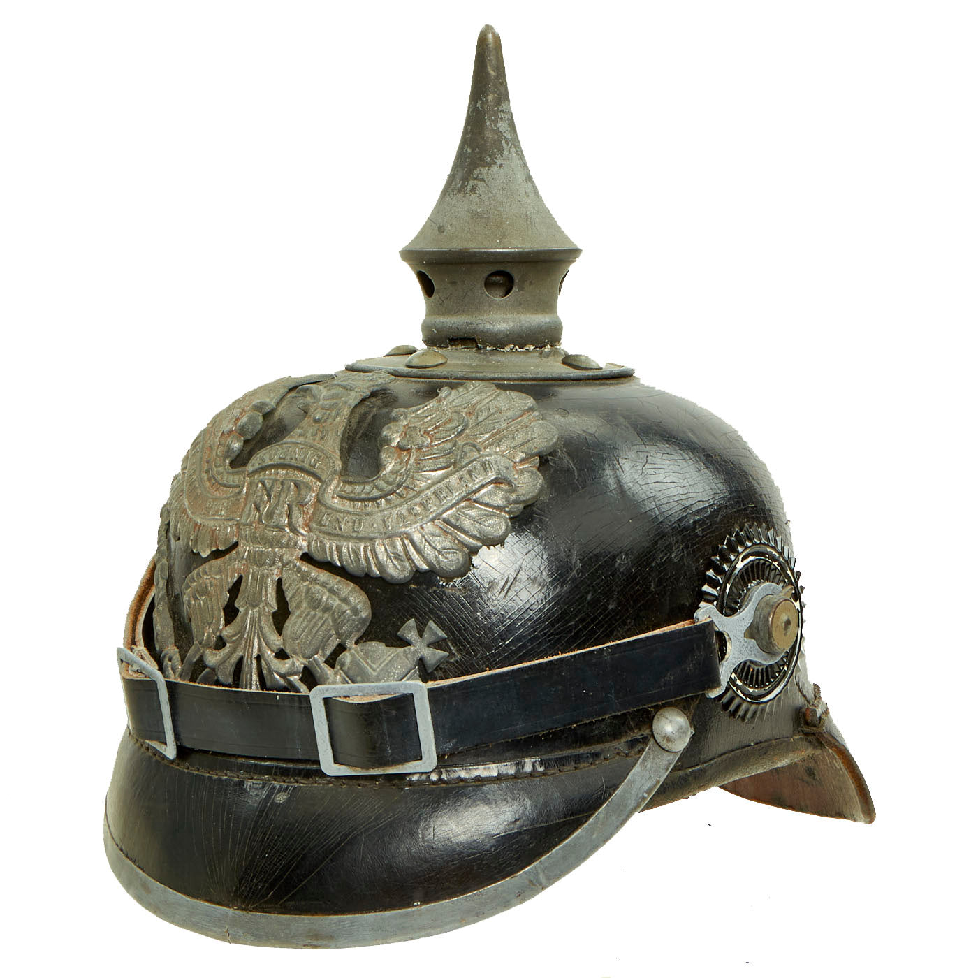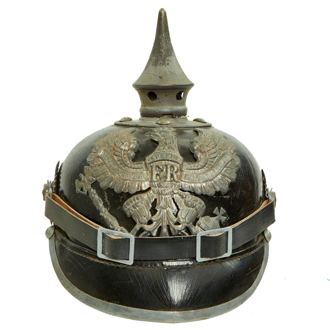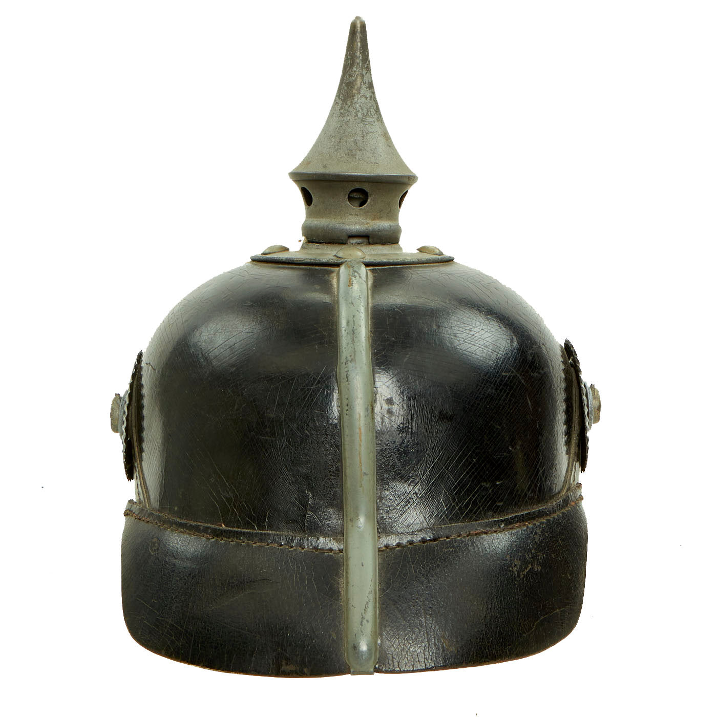 This helmet features an oxide plated steel frontplate (wappen), and the crown of this leather helmet displays a vented enlisted removable spike mounted on a steel baseplate, which still correctly comes off. The spine is interesting in that it does not have a vent, as most do.