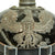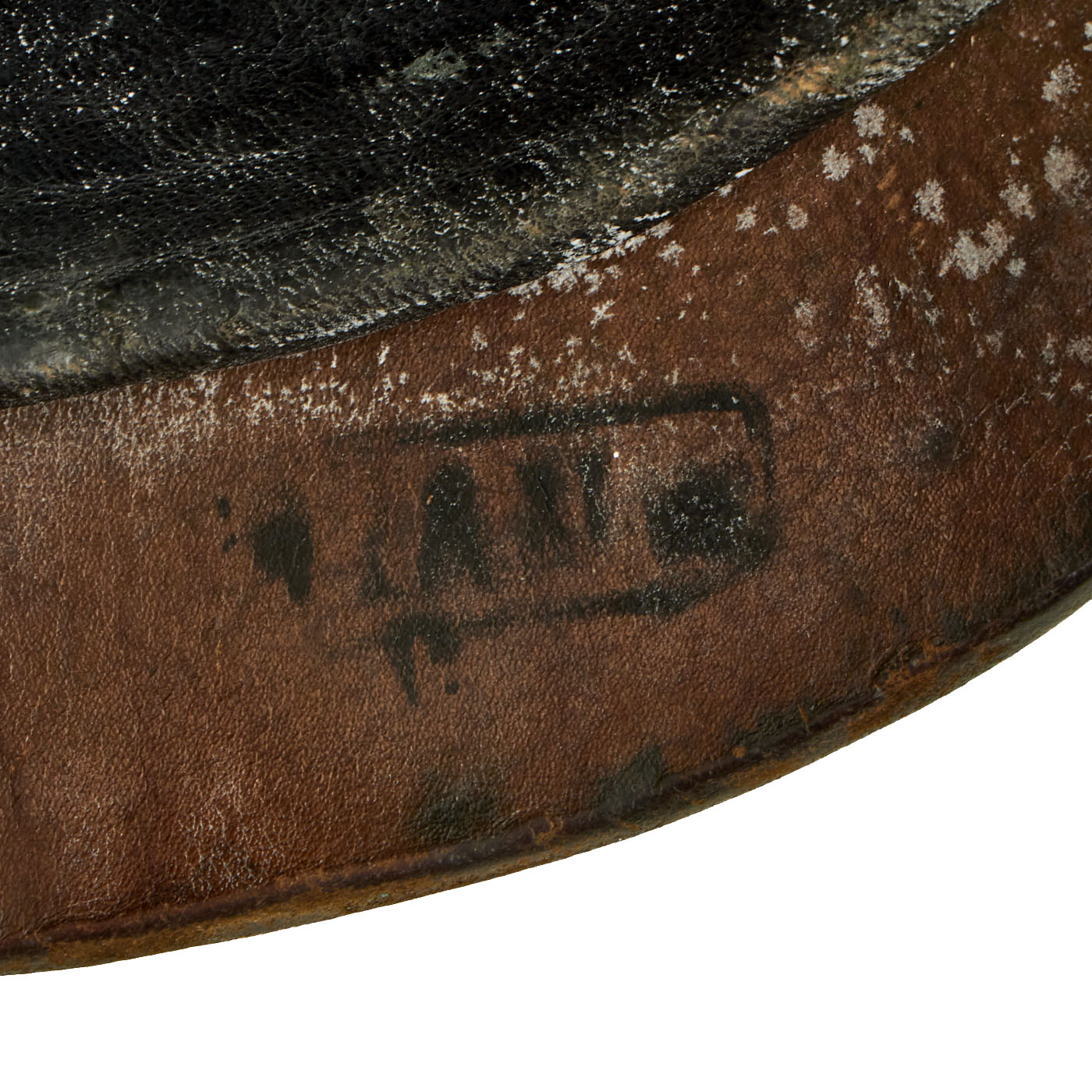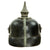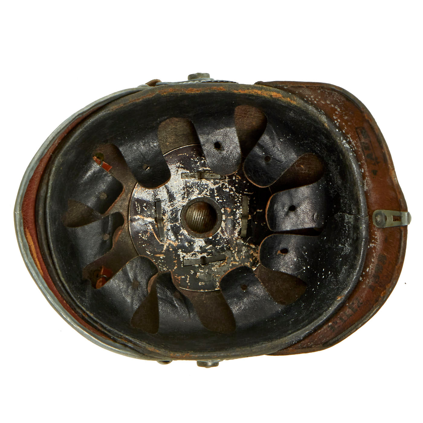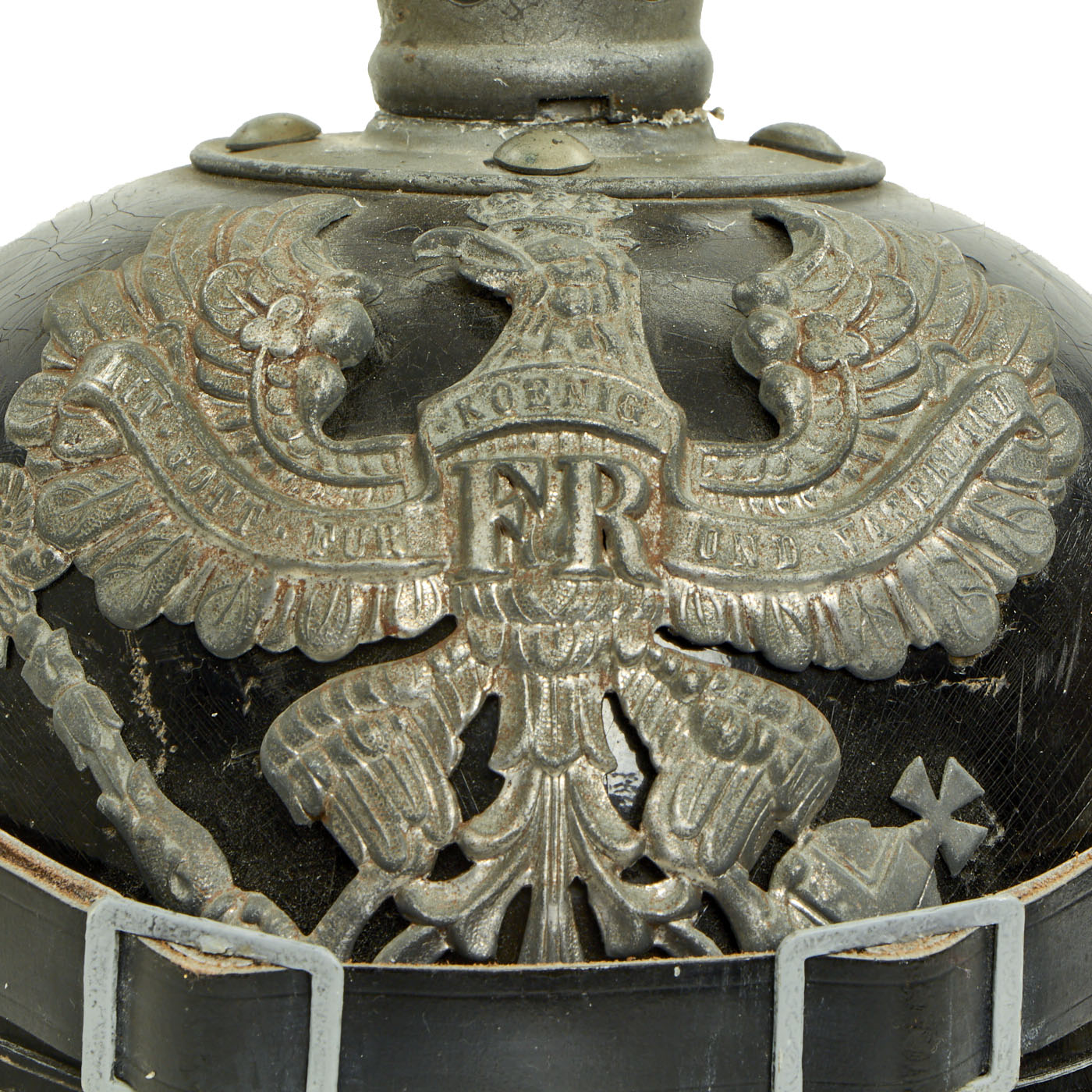 This helmet features an oxide plated steel frontplate (wappen), and the crown of this leather helmet displays a vented enlisted removable spike mounted on a steel baseplate, which still correctly comes off. The spine is interesting in that it does not have a vent, as most do.