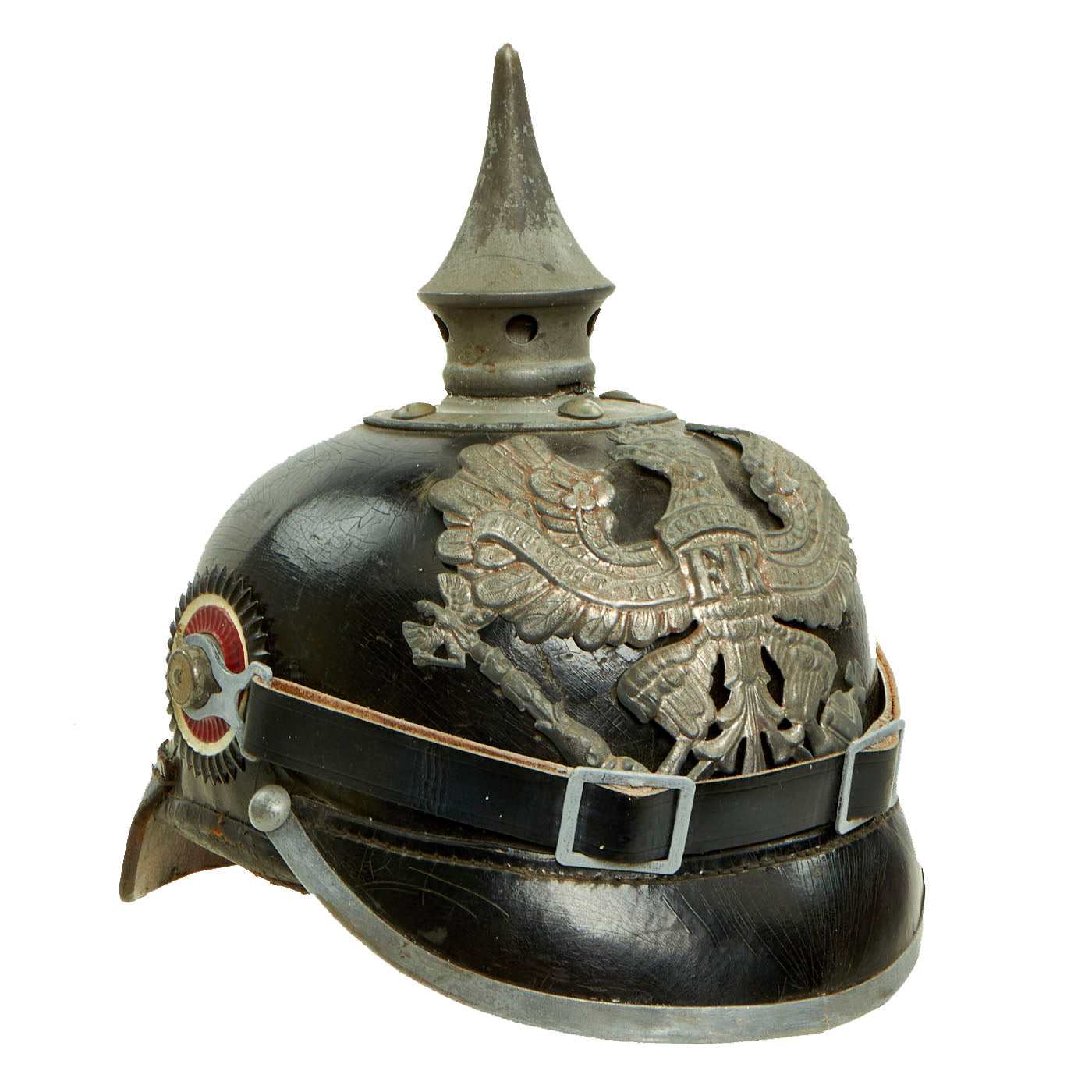 It is complete with original Prussian (black and white) and German National Colors (red white and black) Kokarden (cockades) around the chin strap lugs. In 1897 the new Reichs-Kokarde in Red-White-Black was introduced for all ranks to commemorate the 100th anniversary of the birth of Kaiser Wilhelm 1st. The Reichs-Kokarde was to be worn on the right side of the helmet, and the state Kokarde was moved to the left, as on this helmet. The attached chinstrap is a newer replacement, which completes the outward appearance of this particular example.