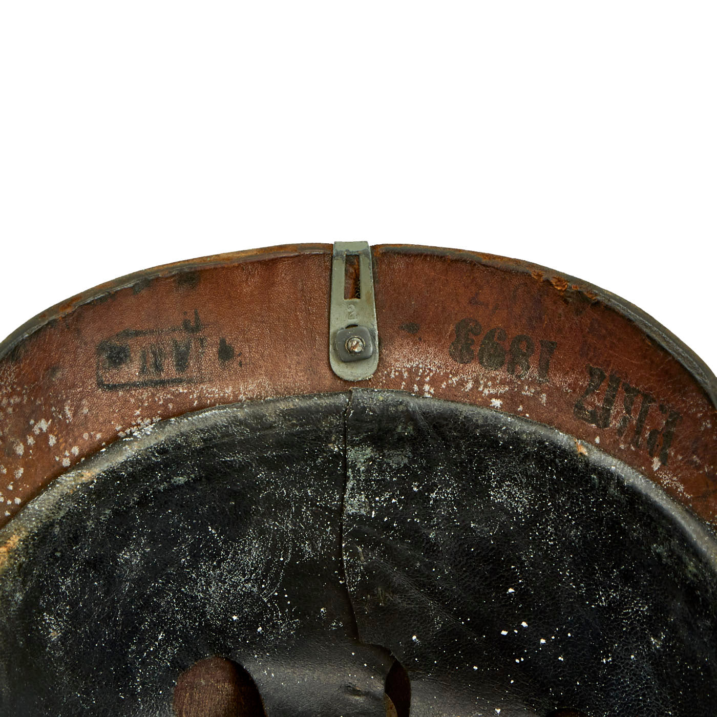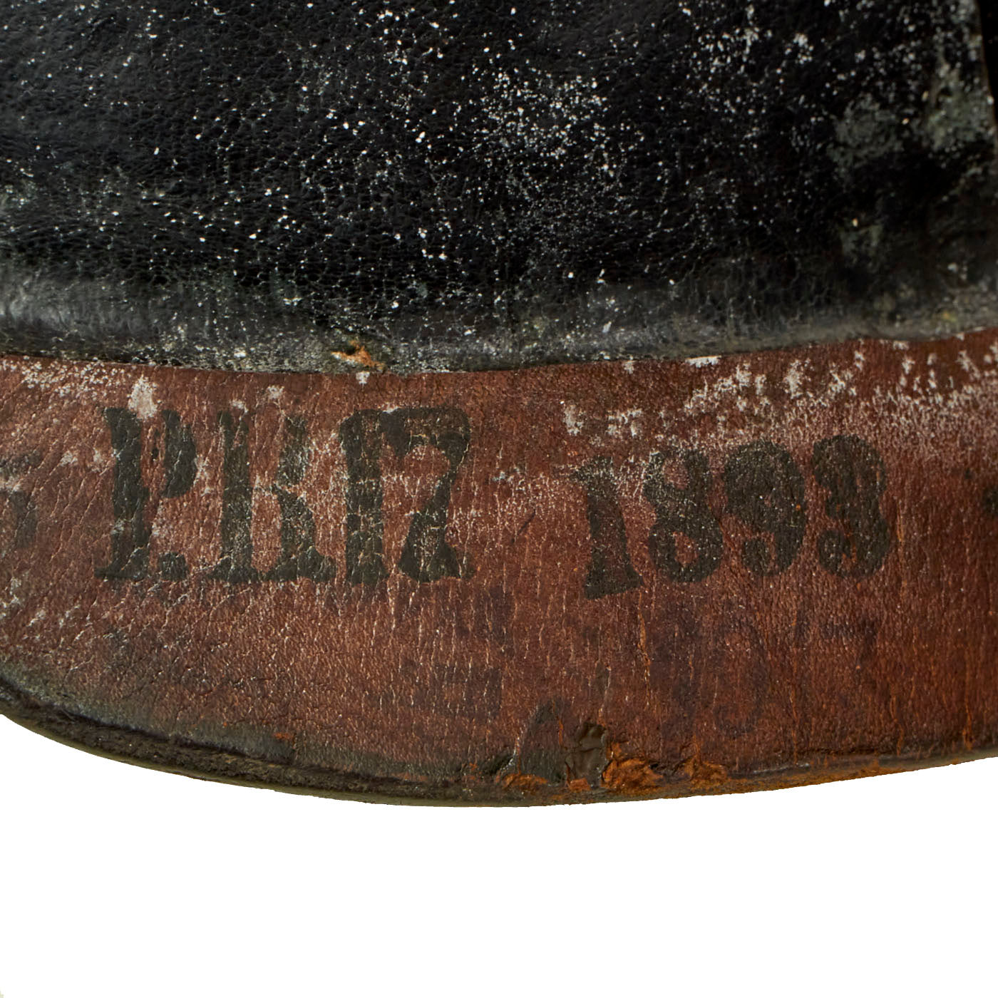 The original liner is present and in exceptional condition. The liner is in beautiful condition and is still soft, retaining its original black leather finish. The helmet is marked with a depot stamp: , size marking 55, Unit marking P.R.17 (17th Pioneer Regiment), and 1893 and 1917 dates. This is an interesting helmet in that this helmet shows evidence of being an older model helmet which was updated to 1915 specifications at a depot in 1917.
