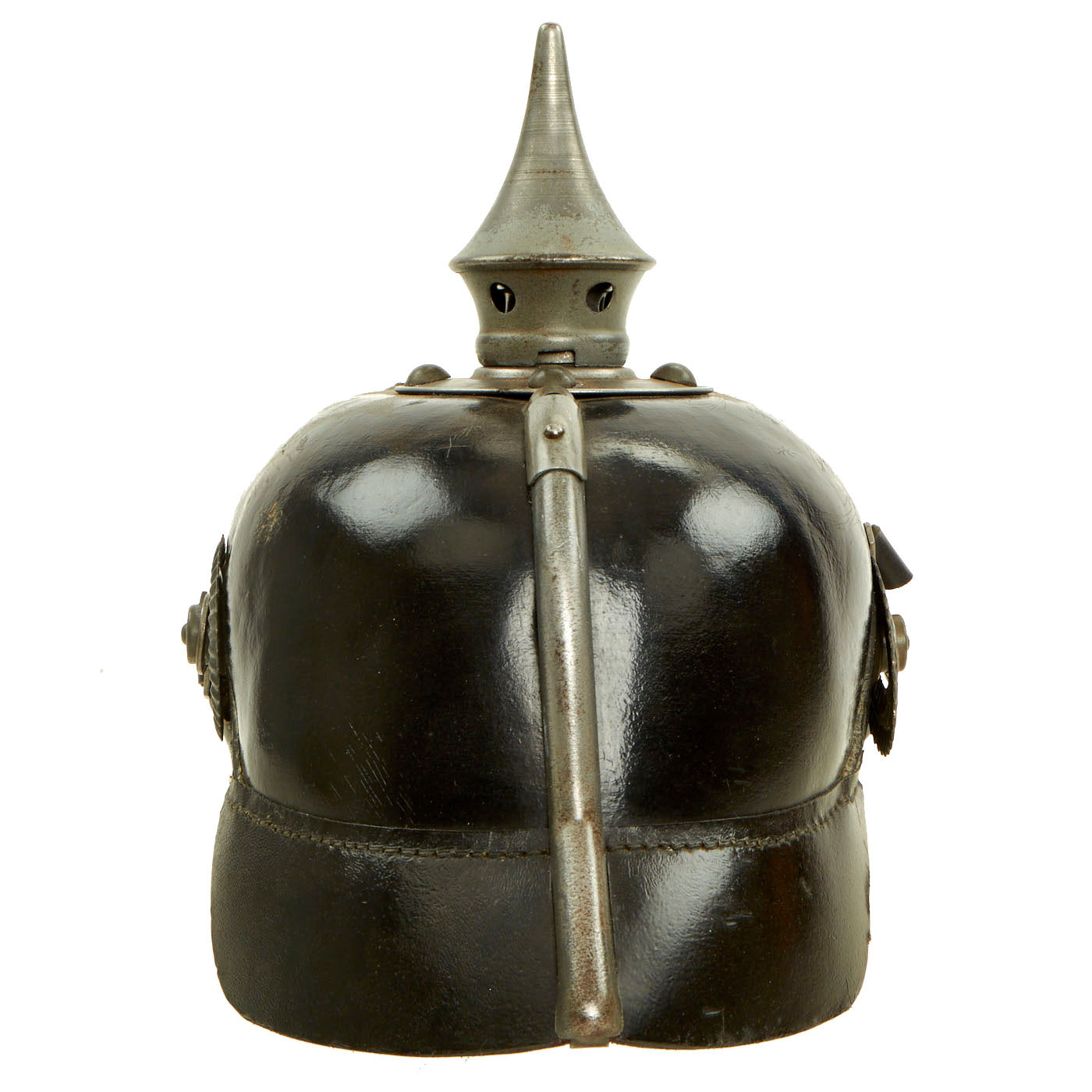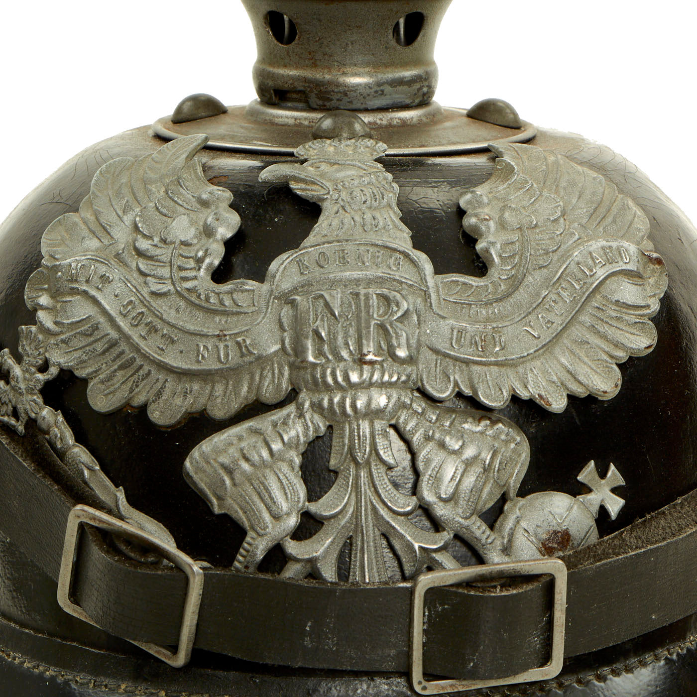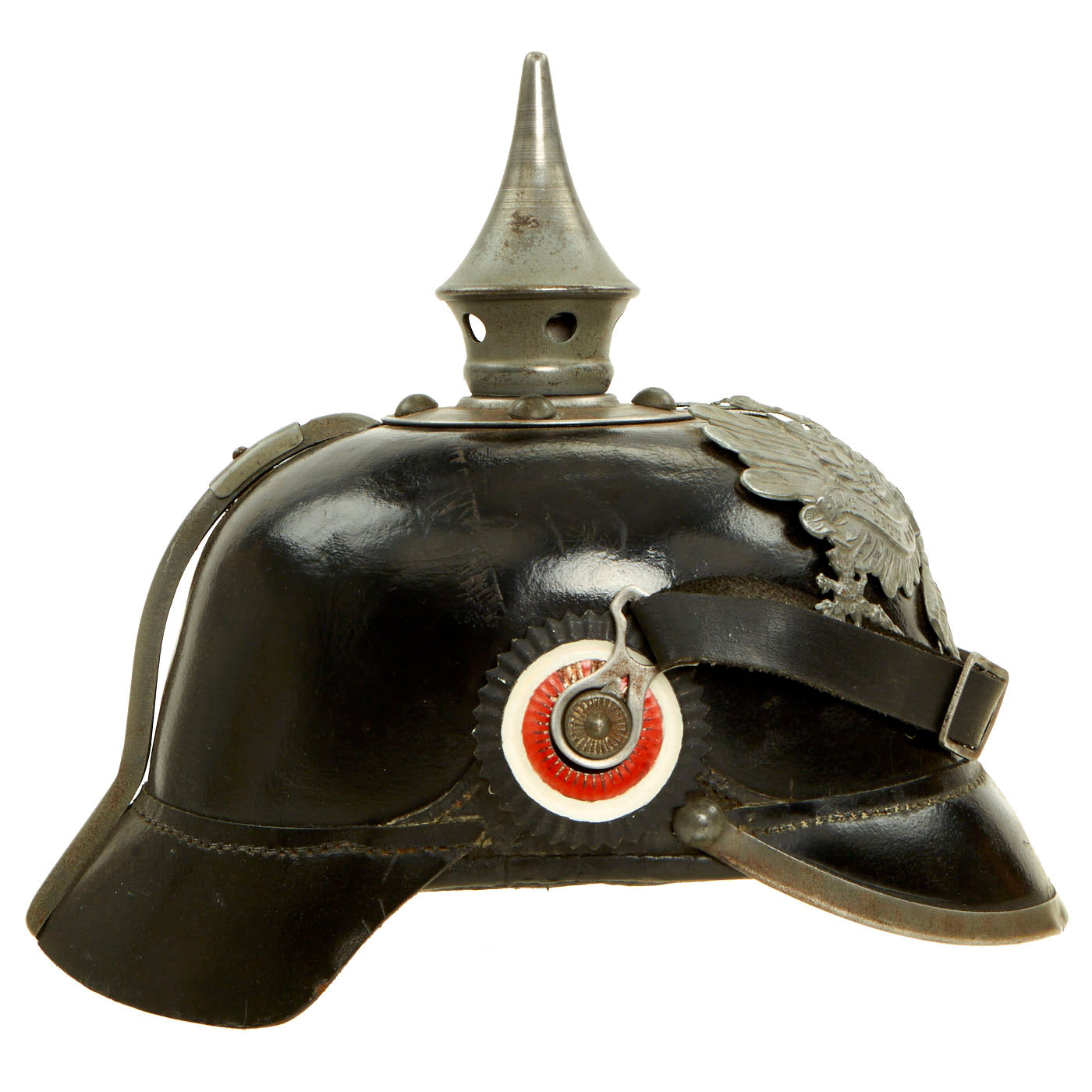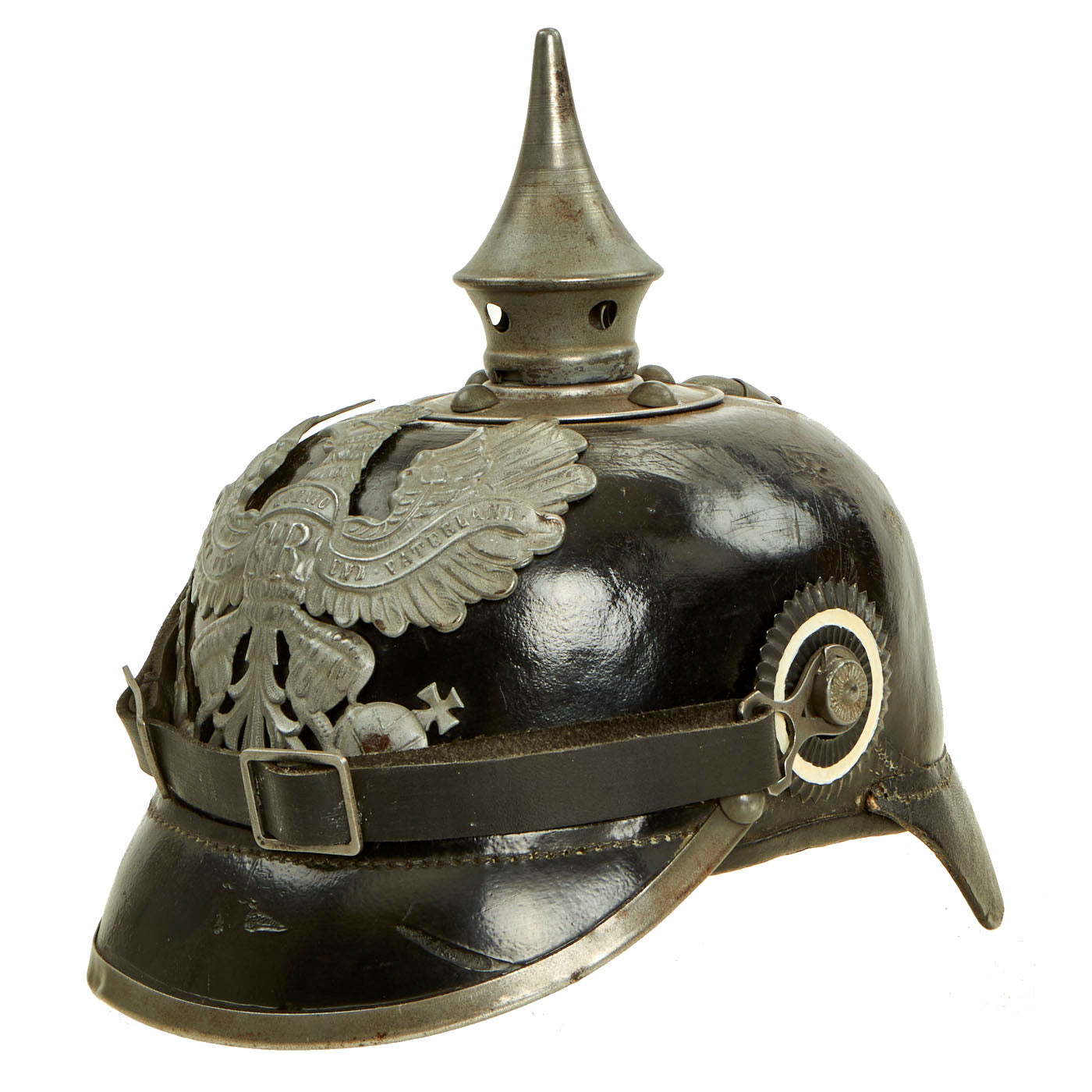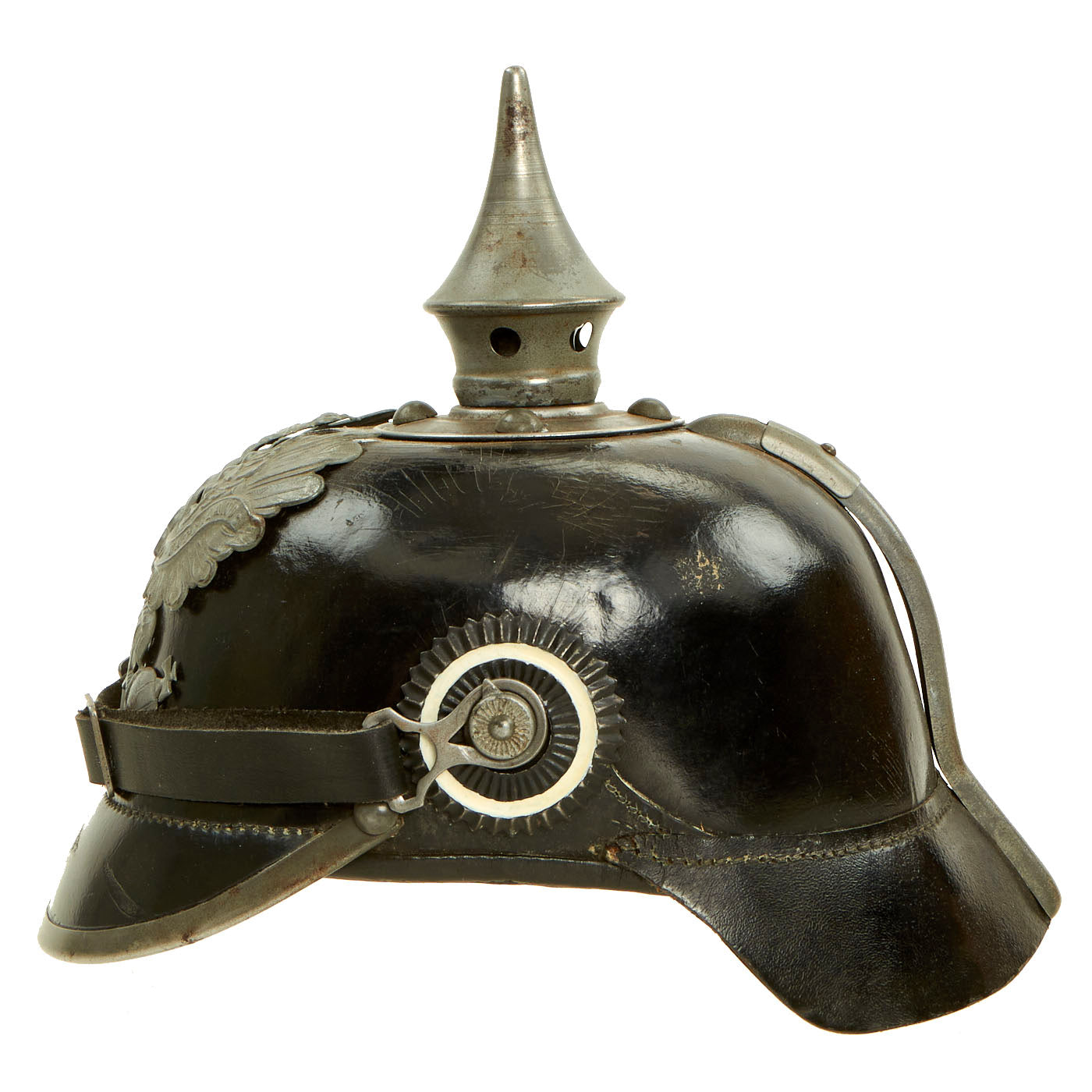 Original Item: Only One Available. A stunning textbook example of an excellent condition M-1915 Imperial Prussian Line Infantry enlisted man's Mannschaften (other ranks or EM / NCO) pickelhaube in good condition. The M1915 was the last model of Pickelhaube issued prior to the move to steel helmets. In accordance with the 1915 regulations, these helmets would no longer use brass, silver, or Tombak as the M1895 did. All issued Pickelhaube would now use gray oxidized steel fittings for all Regiments. As with previous versions, the body was constructed from boiled leather, which was shaped and lacquered black.