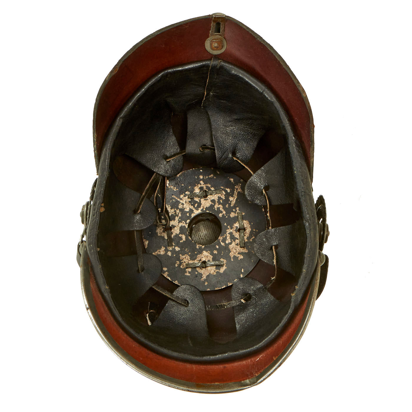 The attached chinstrap is a newer replacement, which completes the outward appearance of this particular example. The original liner is present and in exceptional condition. The liner is in beautiful condition and is still soft, retaining its original black leather finish. The helmet is marked with a depot stamp: B.A.X. and dated 1915.