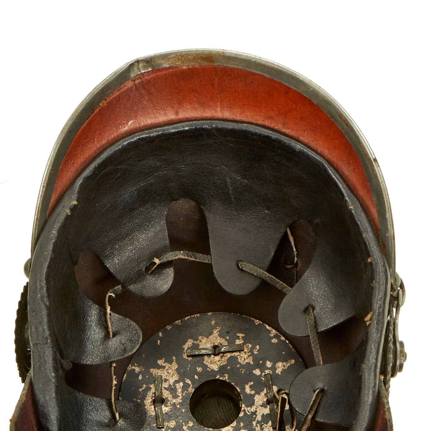 The exterior of the helmet shell is in good shape, with very little change to the shape, and the black enamel still exhibits a nice sheen still. There are areas of cracking and checking, but they just serve to add to the lovely patina of age. The front and rear visors are still quite well attached to the helmet. The front and rear visors appear to be completely attached.