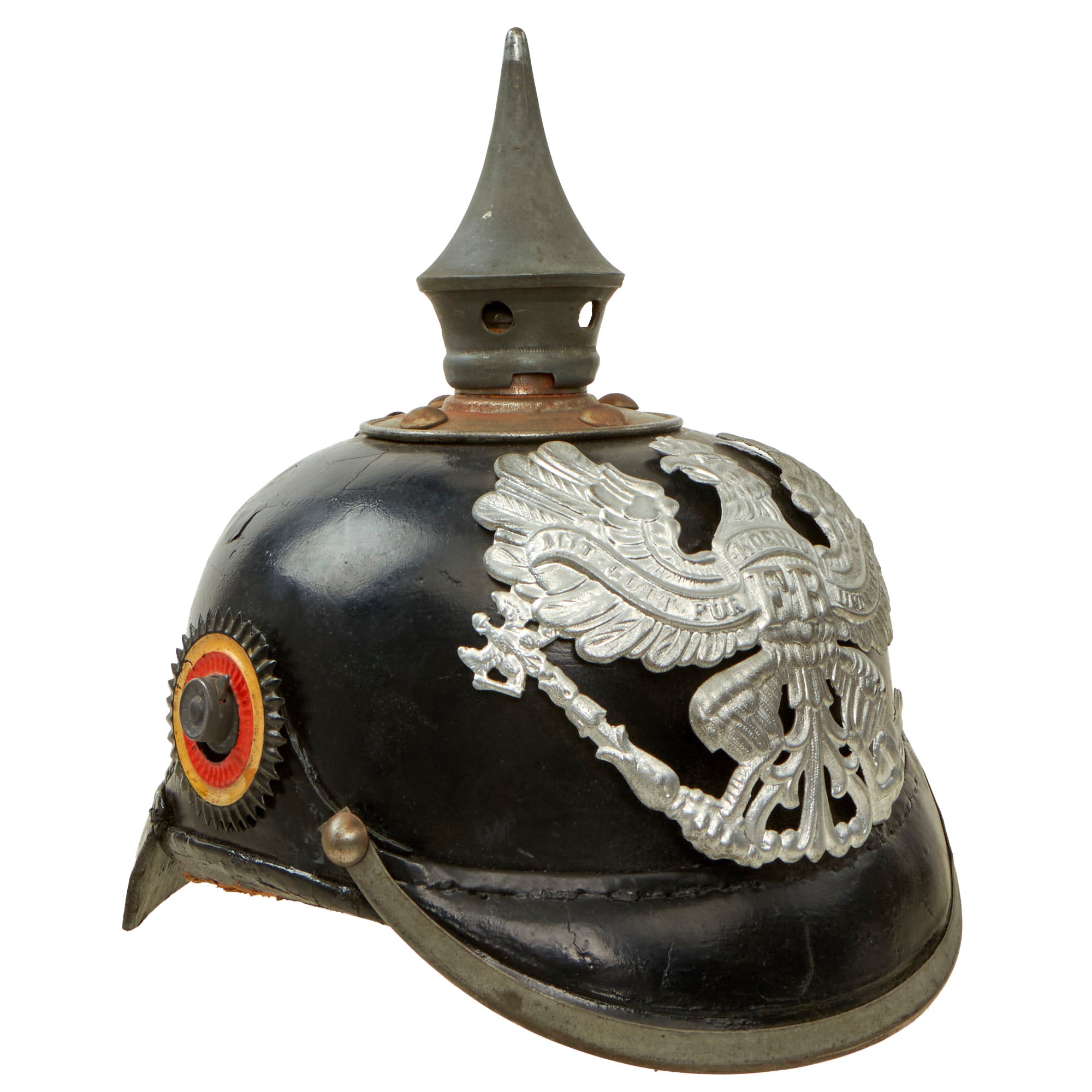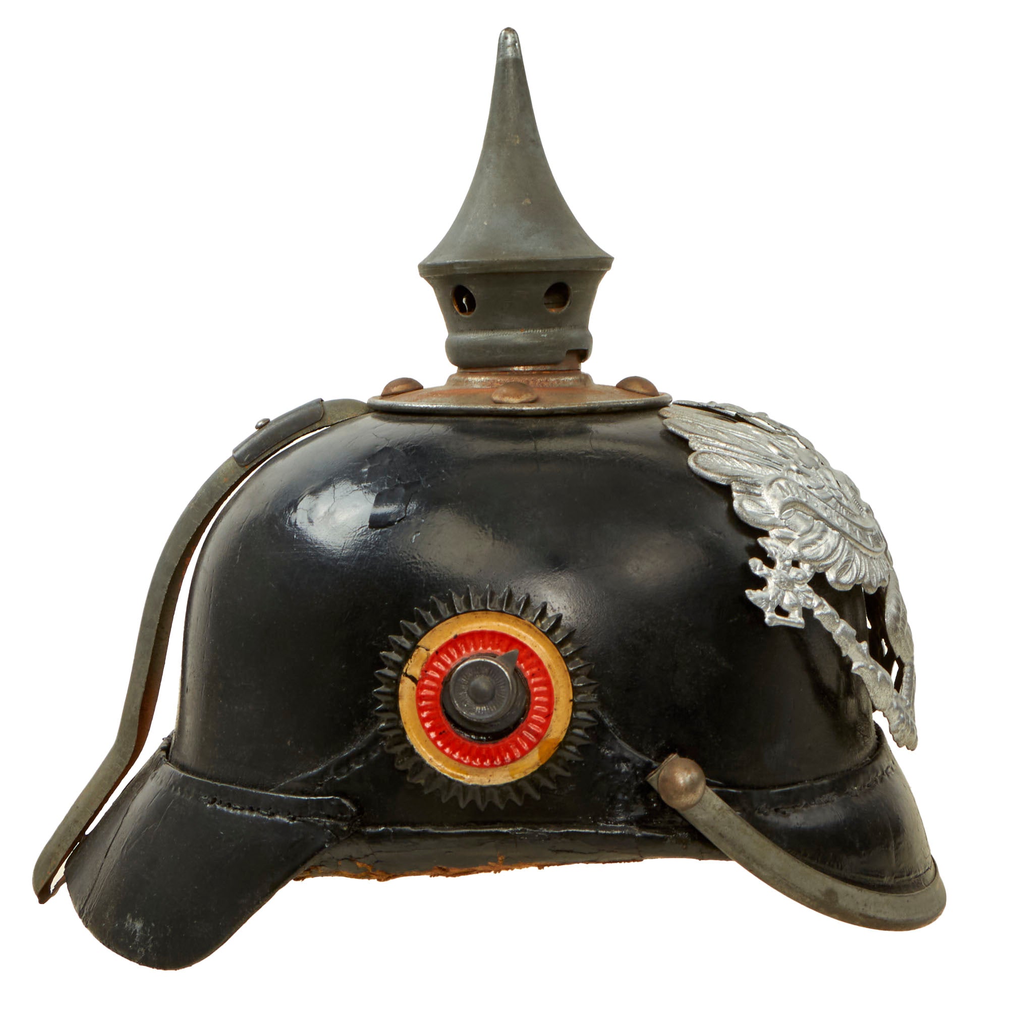 The helmet bears its original German National Colors (red white and black) Kokarden (cockades) around one of the chin strap lugs, but is missing the Prussian (black and white) cockade. In 1897 the new Reichs-Kokarde in Red-White-Black was introduced for all ranks to commemorate the 100th anniversary of the birth of Kaiser Wilhelm 1st. The Reichs-Kokarde was to be worn on the right side of the helmet, and the state Kokarde was moved to the left, as on this helmet.
