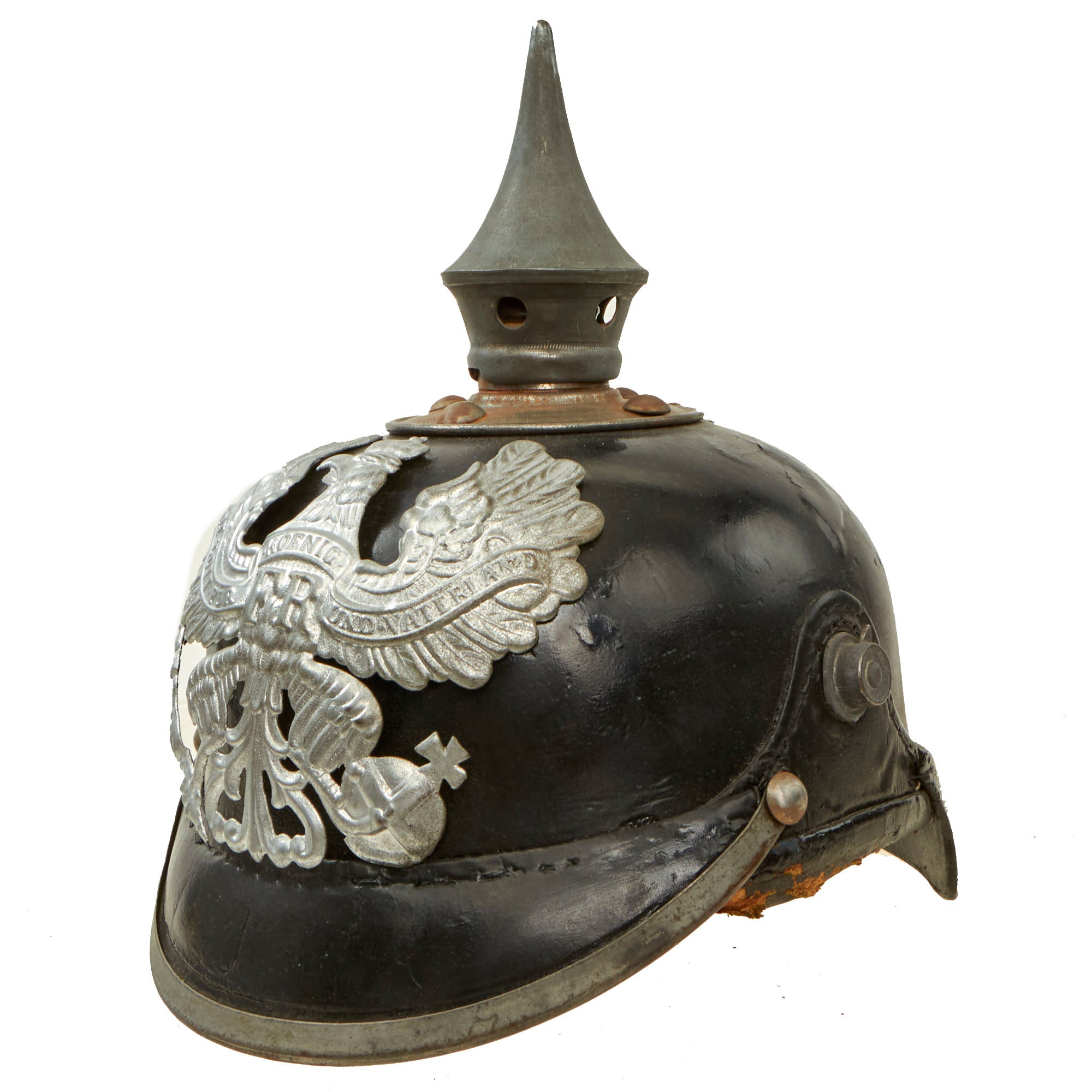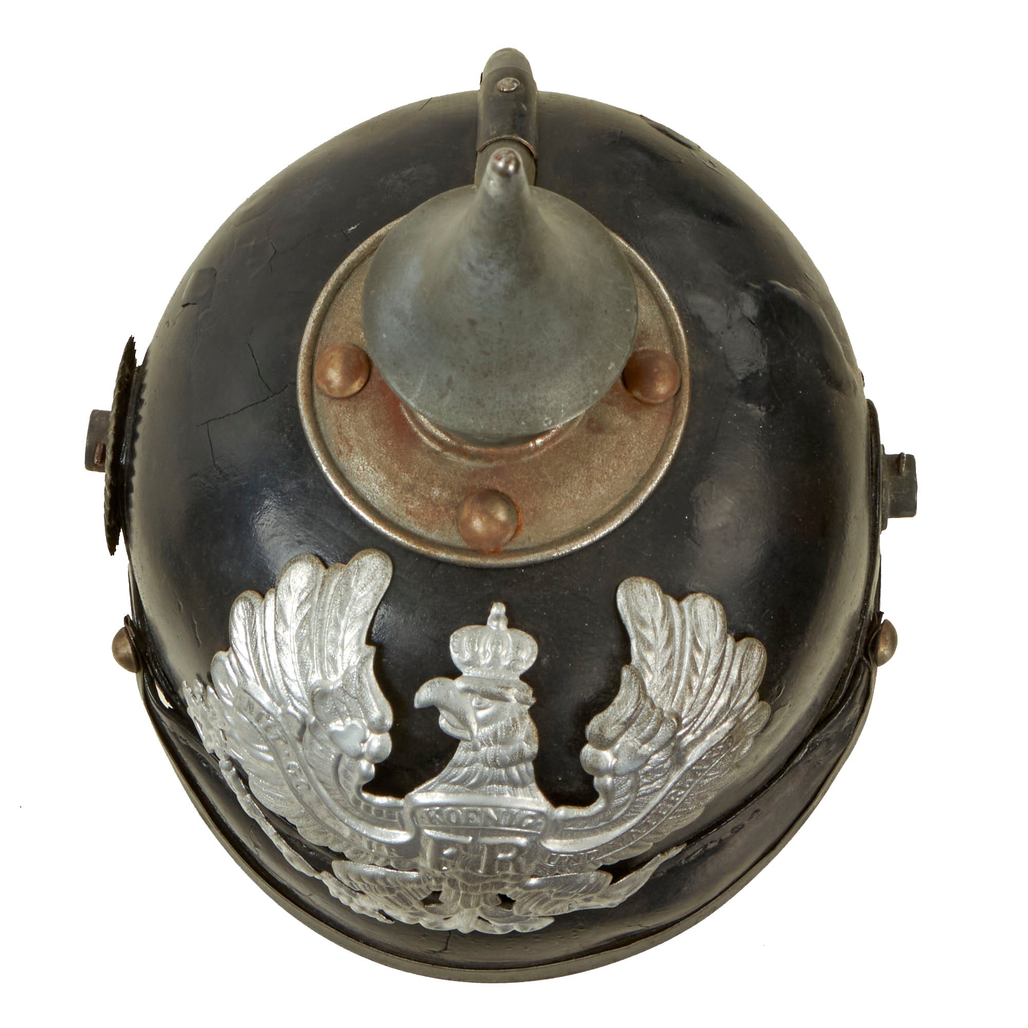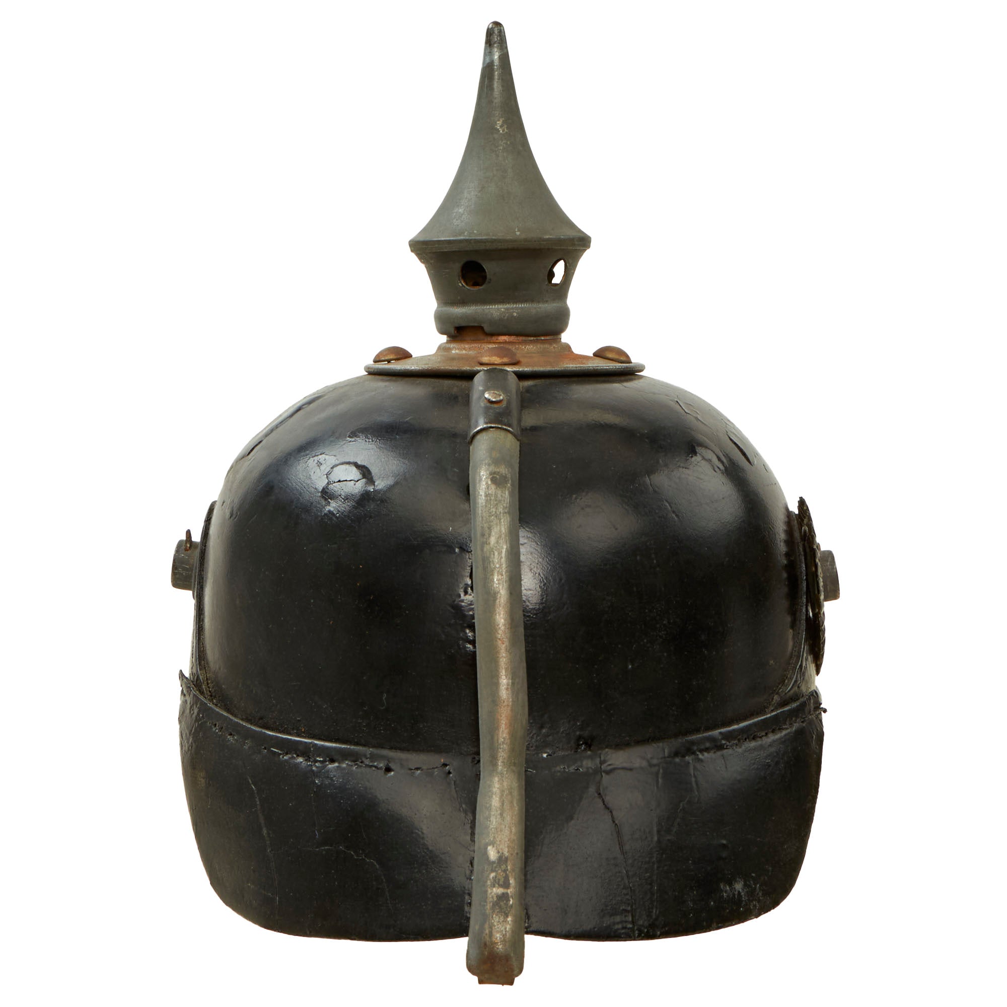 The exterior of the helmet shell is in good shape, with very little change to the shape, and the black enamel still exhibits a nice sheen. There are areas of cracking and checking, but they just serve to add to the lovely patina of age. Overall a very nice condition Imperial Prussian pickelhaube, perfect for any WWI collection!