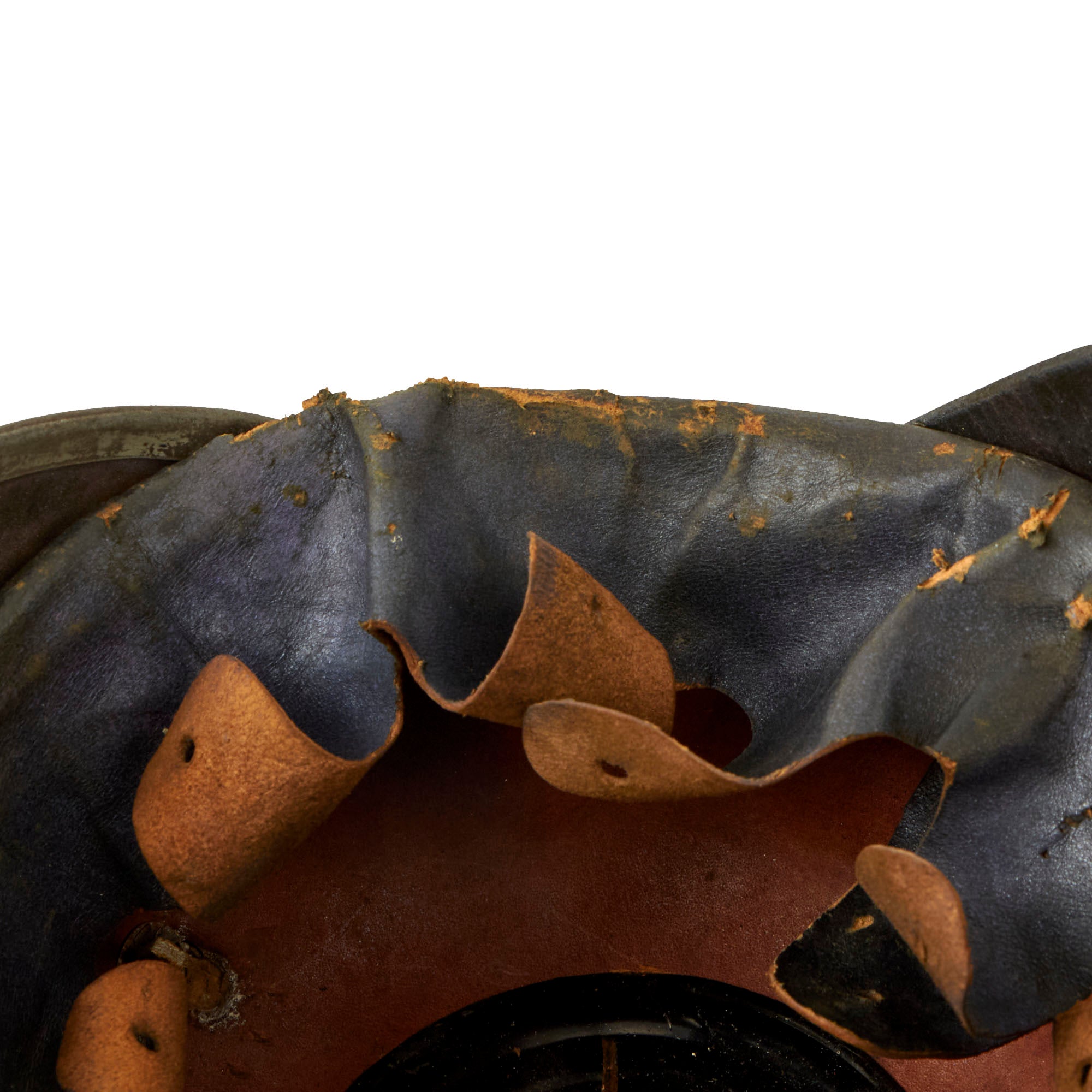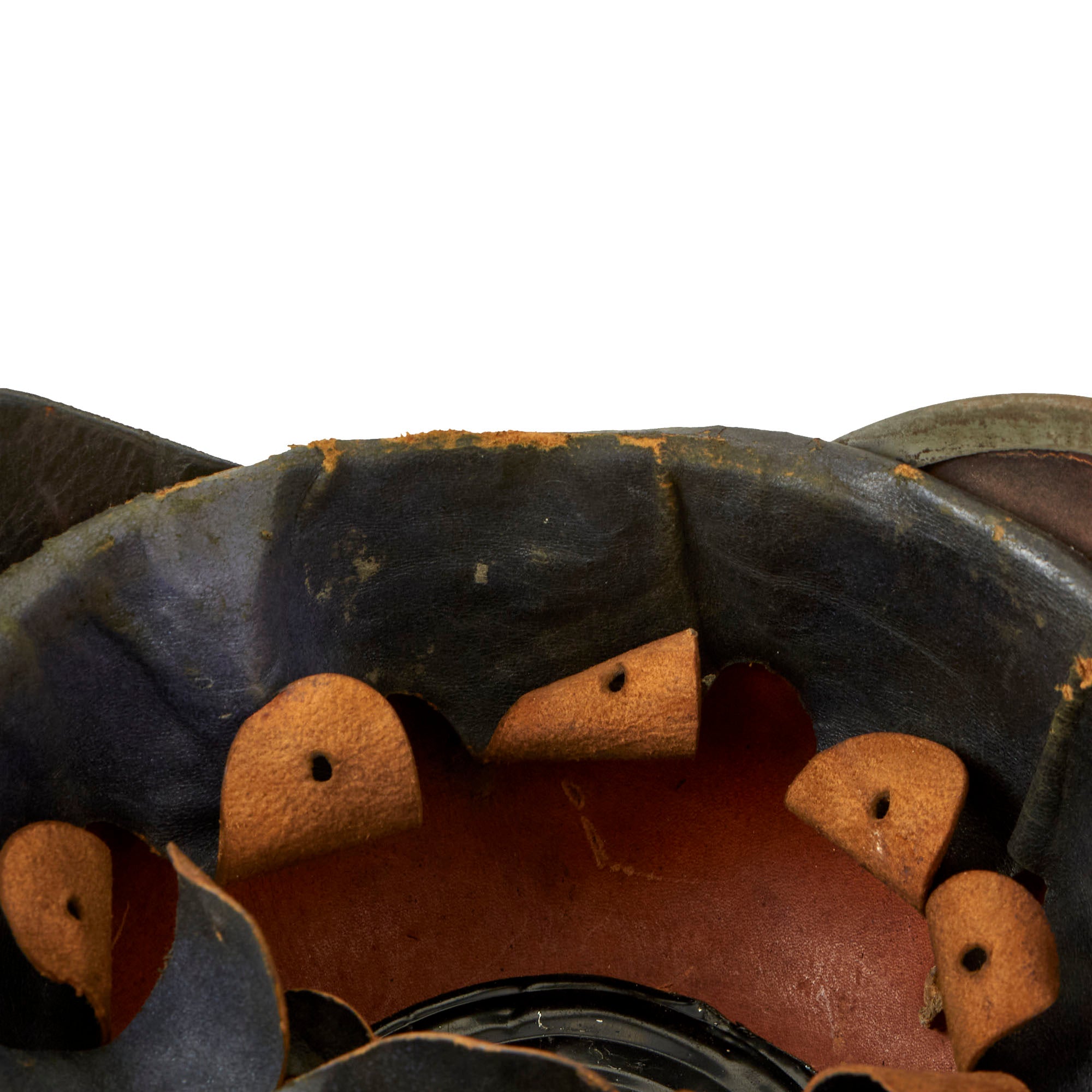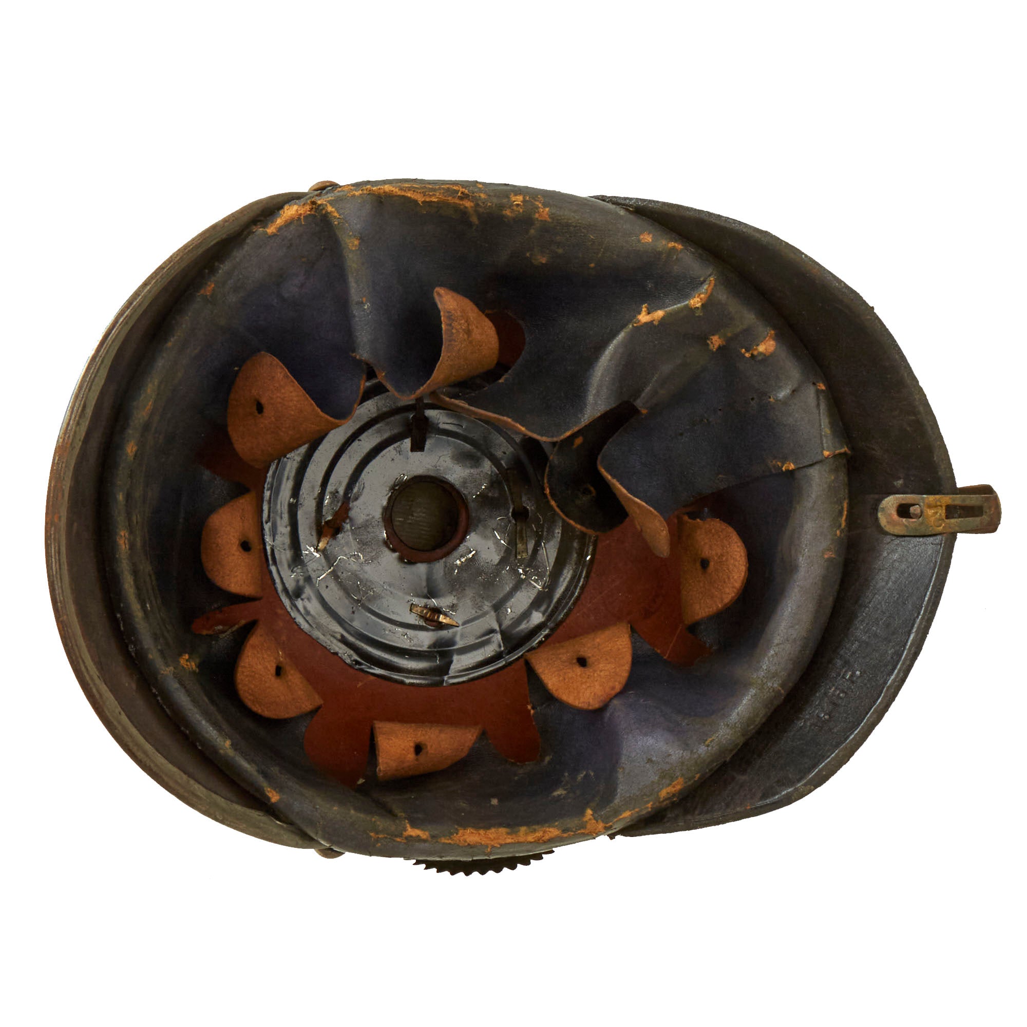 This helmet features an oxide plated steel frontplate (wappen) which appears to have been repainted, and the crown of this leather helmet displays a vented enlisted removable spike mounted on a steel baseplate, which is removable but takes some pressure to put back on. There is also a small adjustable vent on the spine that supports the rear skirt, only seen on the enlisted helmets, which is able to be moved still. The rear spine is disconnecting from the helmet as shown, as the nut which kept it in place is missing.