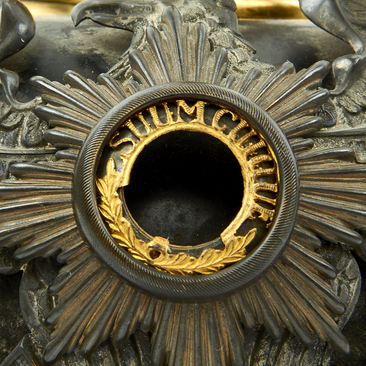 The overall condition of this officer's pickelhaube is very good. The helmets top fittings, spike, read support, and entire chin strap are gilt brass, with lots of original gold retained. The Prussian wappen (coat of arms) is of blacked brass, with some gold highlights, and features a large eagle holding a scepter and an orb, with a banner bearing the King's motto, MIT GOTT FÜR KOENIG UND VATERLAND (With God for King and Country, i.e. Prussia). As this is a Garde helmet, there is a large 8 pointed star in the middle, which is the emblem of the Hoher Orden vom Schwarzen Adler (Order of the Black Eagle). The gilt motto SUUM CUIQUE (to each his own) is marked above center, with laurel leaves below. Unfortunately the central eagle is missing, and the central circle is only loosely attached. Most likely it was dropped on the wappen a few times, which pushed in the eagle, which then was lost.