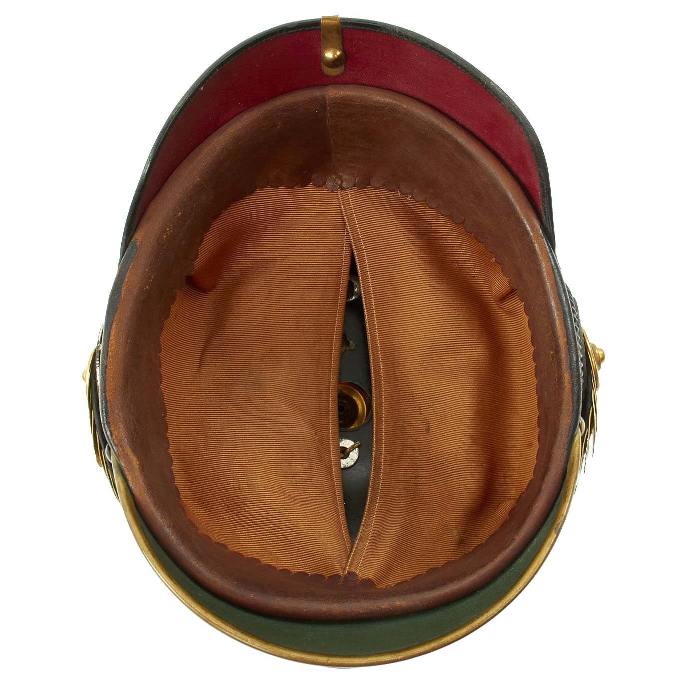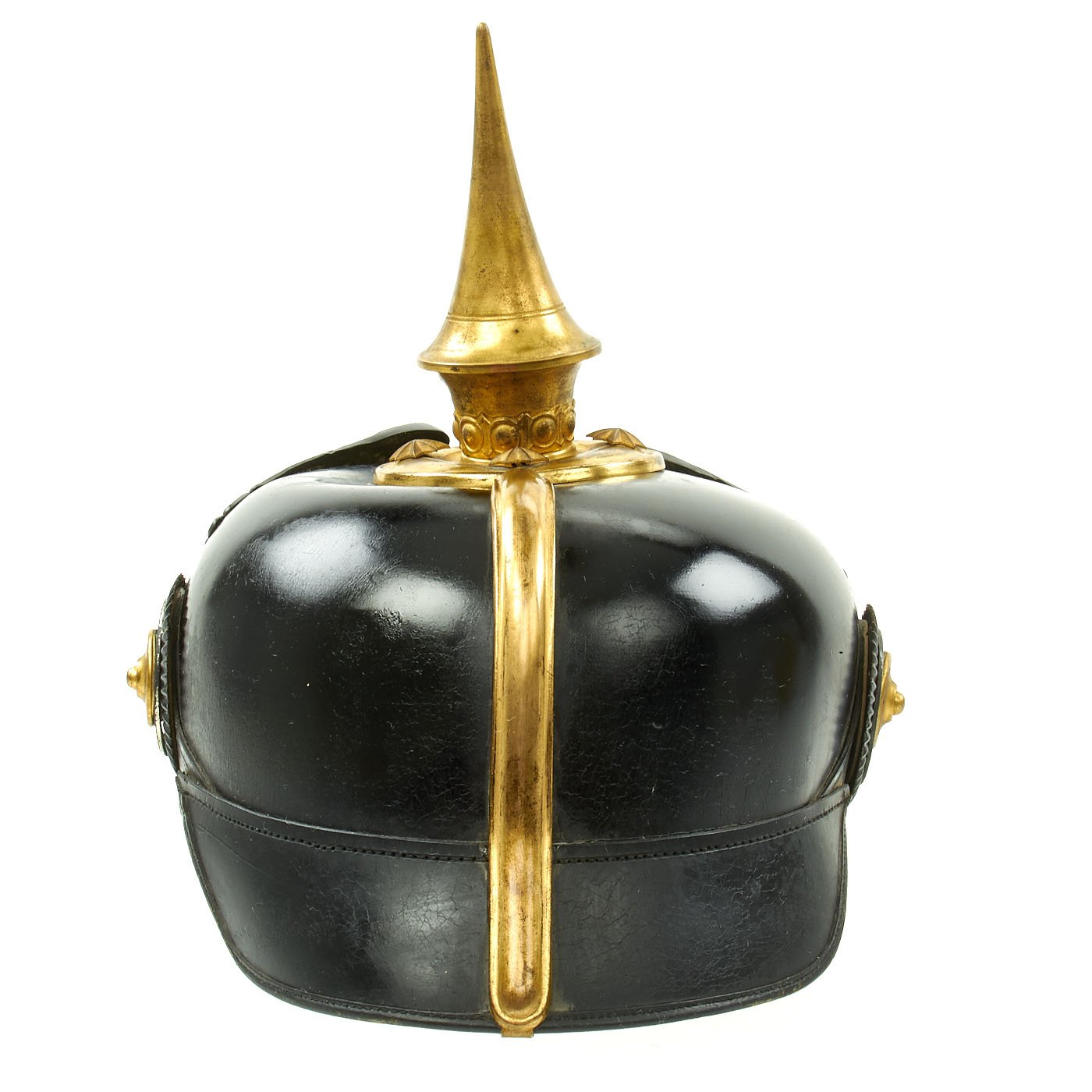 This example is quite nicely appointed, with the fittings being a mixture of gilt brass , with a blacked brass Wappen front plate. It also has the post-1880 internal leather sweatband and silk skull-cap as seen on officer's helmets. These also featured other officer features such as: the undersides of visors are lined, Officer Kokarden are carried, and the "egg & dart" Perlring was matched with star-pattern spike base brads, and chinscales were worn. As with most pickelhauben, they are made from boiled leather, which is then lacquered black.