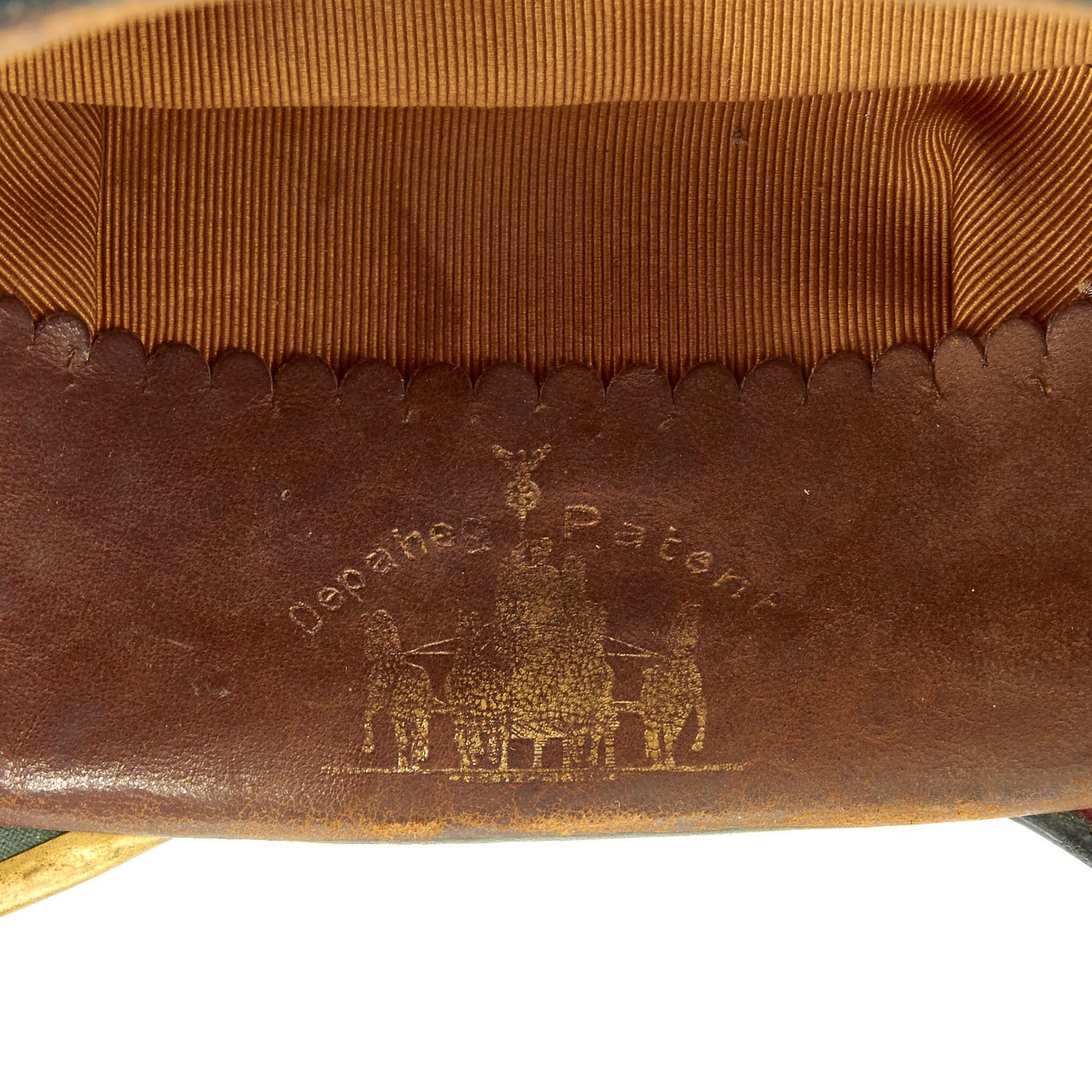 The inside liner is still present, and is marked with an emblem and the maker Depaheg Patent in gold. It still has the silk skull cap, which is so often removed. The silk is light brown, and retained at nearly 100%, something we almost never see. The leather sweat band is still supple and complete. Overall a wonderful interior, much more complete and in better condition than almost any we see.